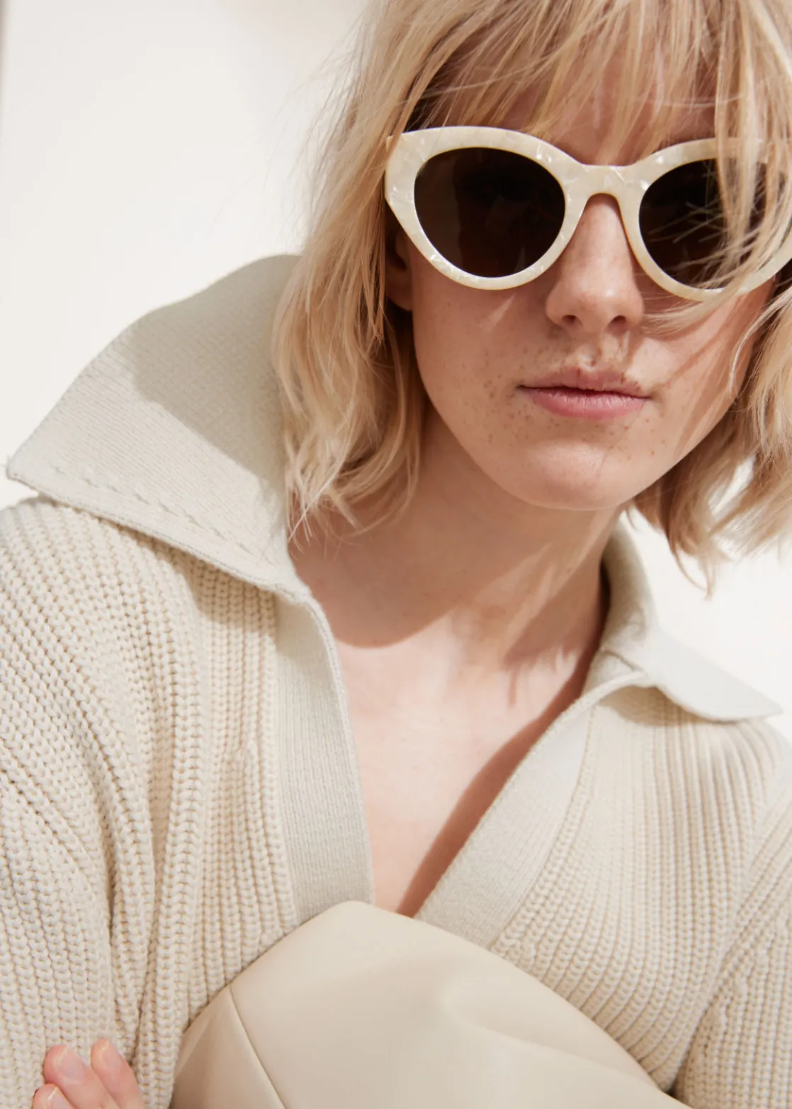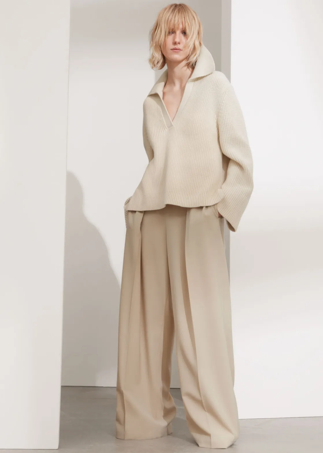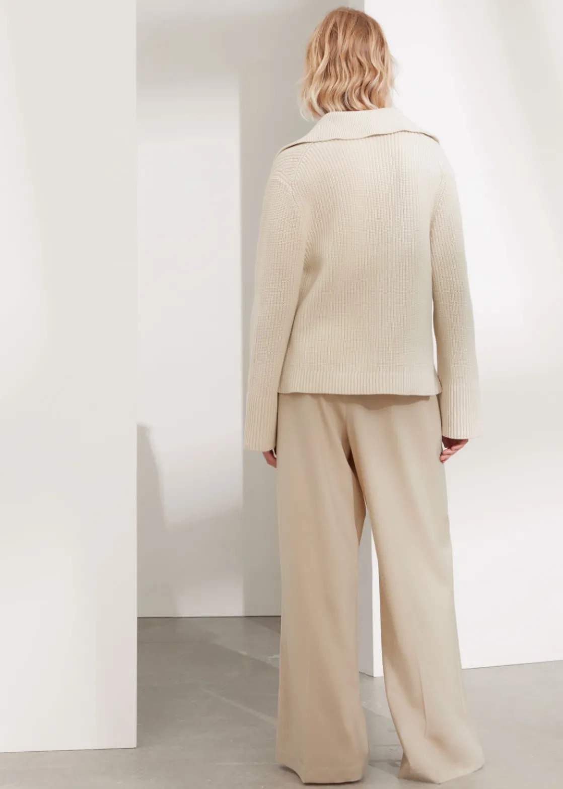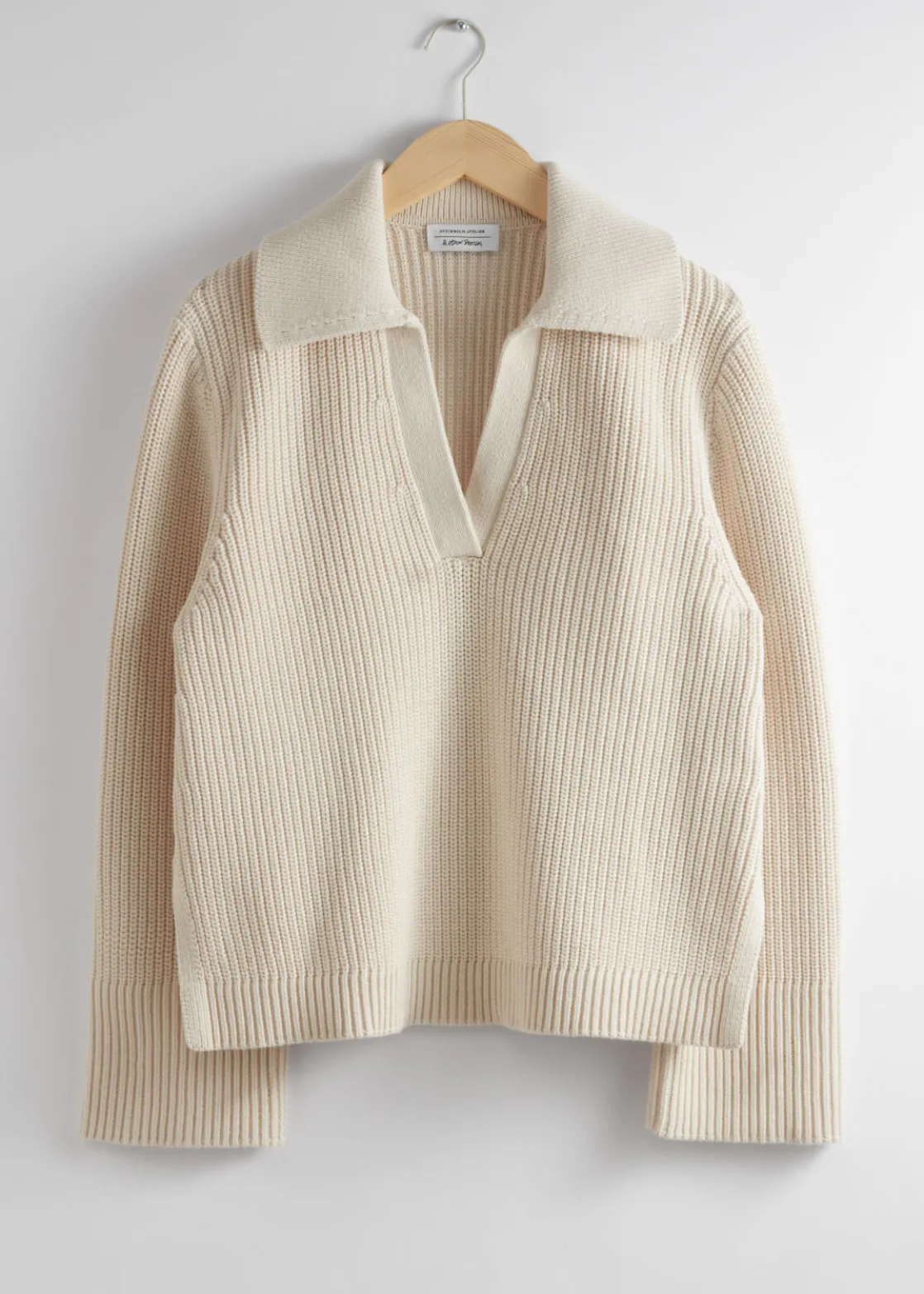 Collared long-sleeve rib-knit sweater with an oversized silhouette.
