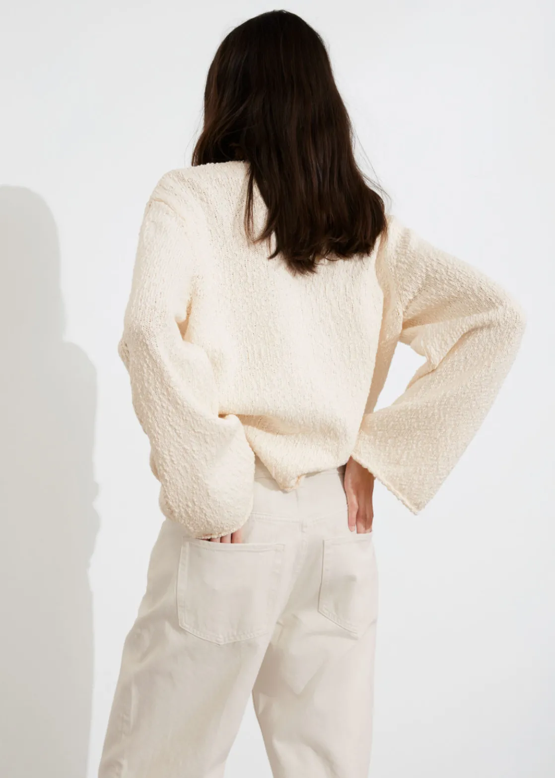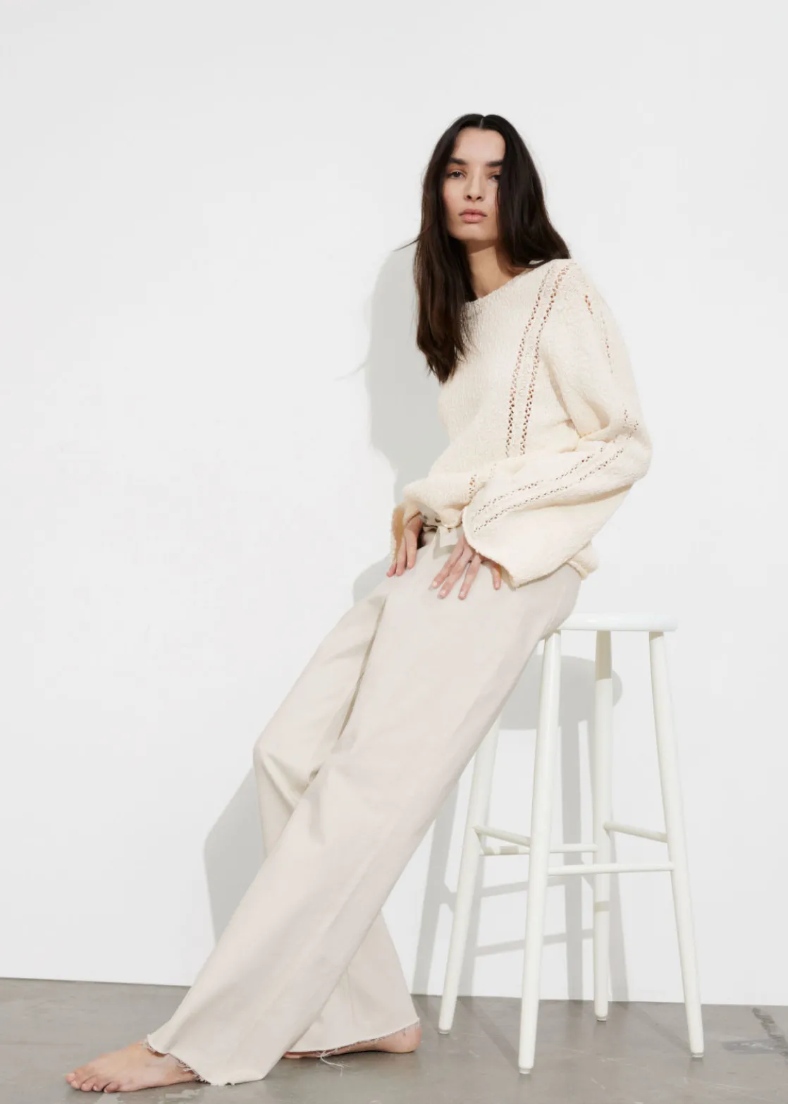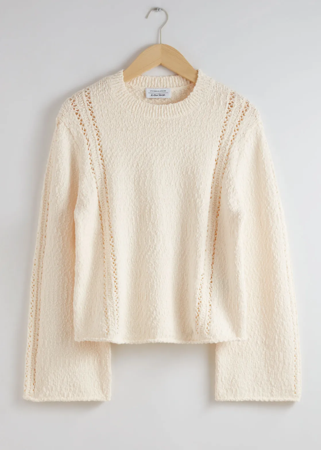 Long-sleeve knit sweater featuring a textured finish and open-knit detailing tracing the front and the sleeves.