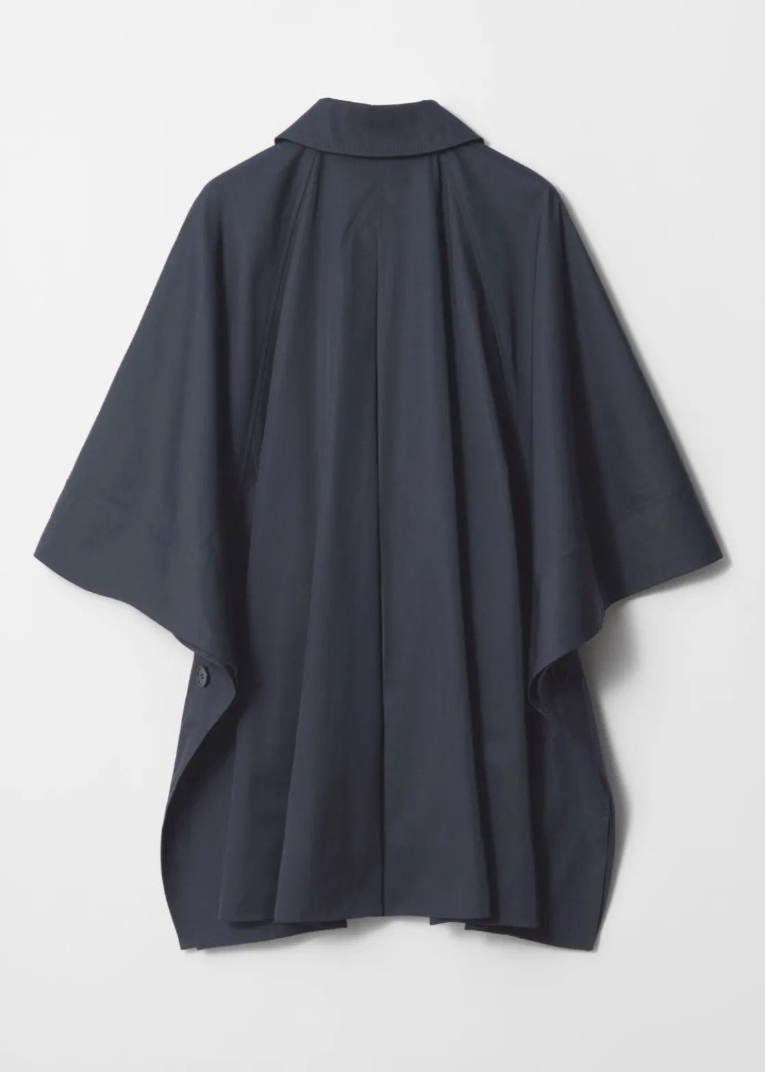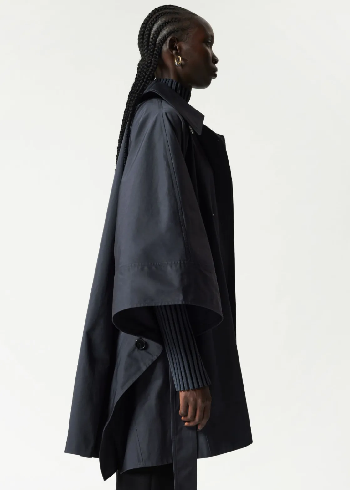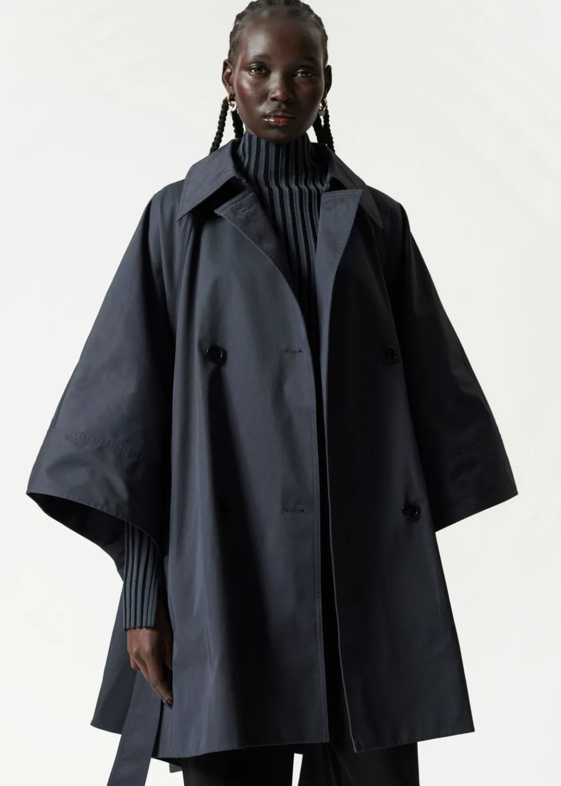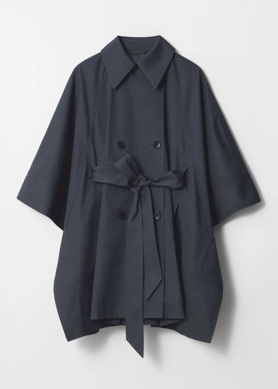Oversized cape with a trenchcoat-inspired finish. Featuring a turn-down collar, a double-breasted silhouette and a self-tie belt.