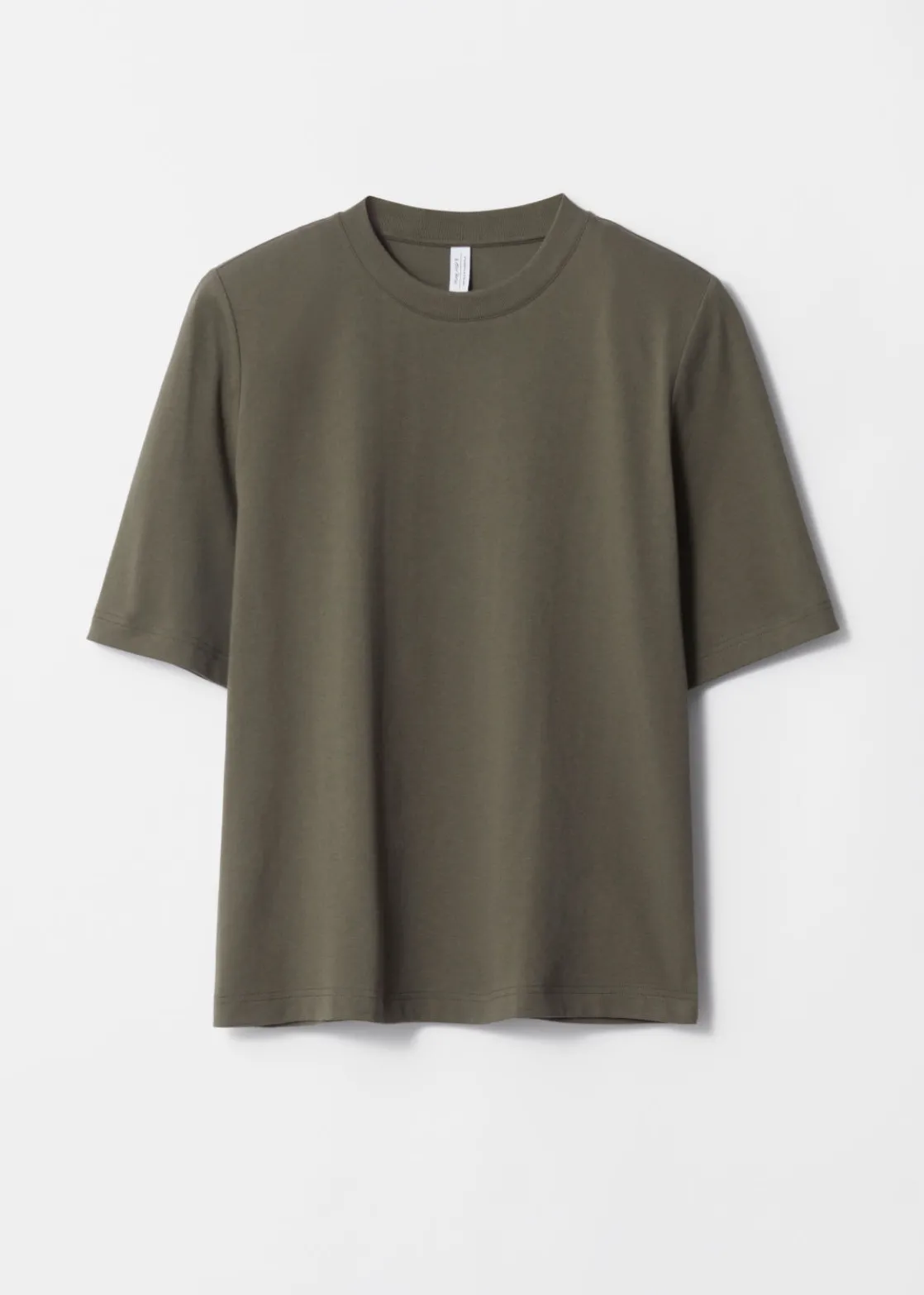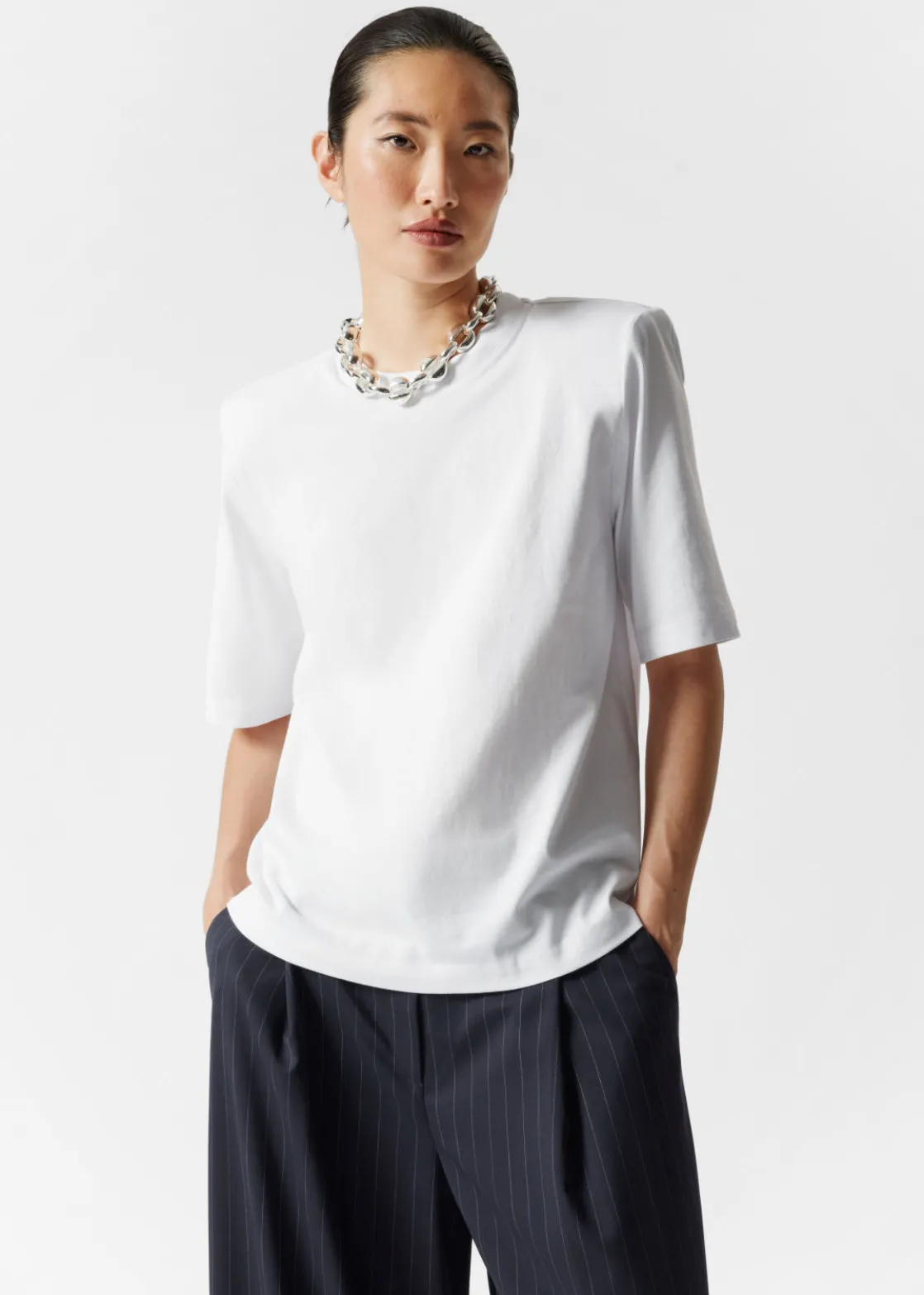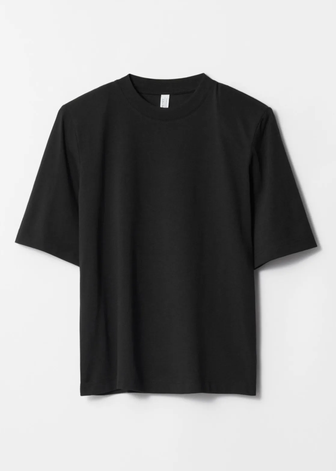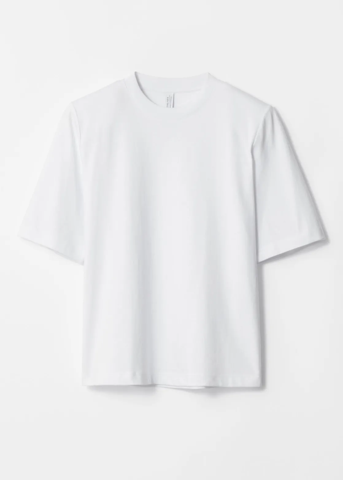 Classic crewneck t-shirt made from cotton. Featuring washable shoulder pads.
