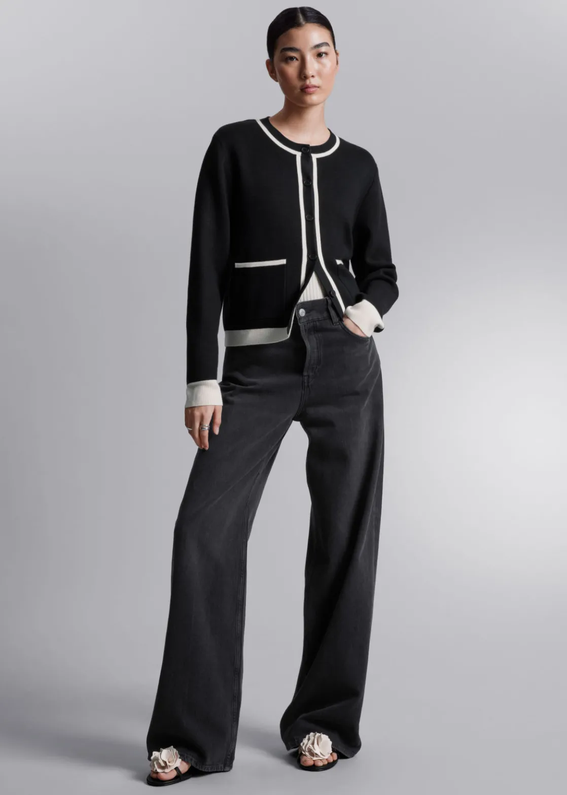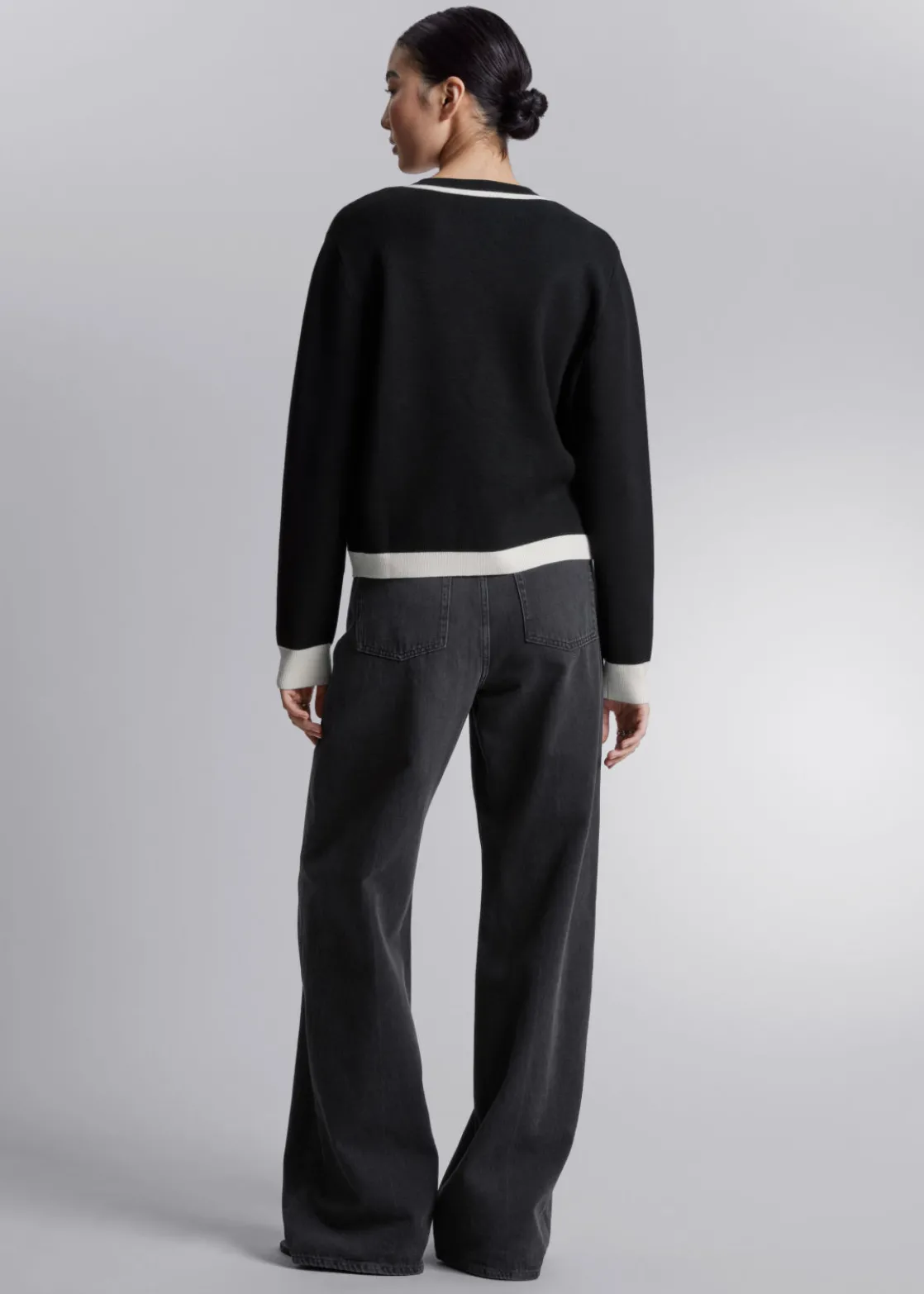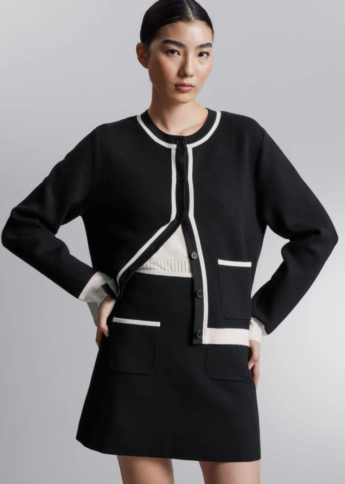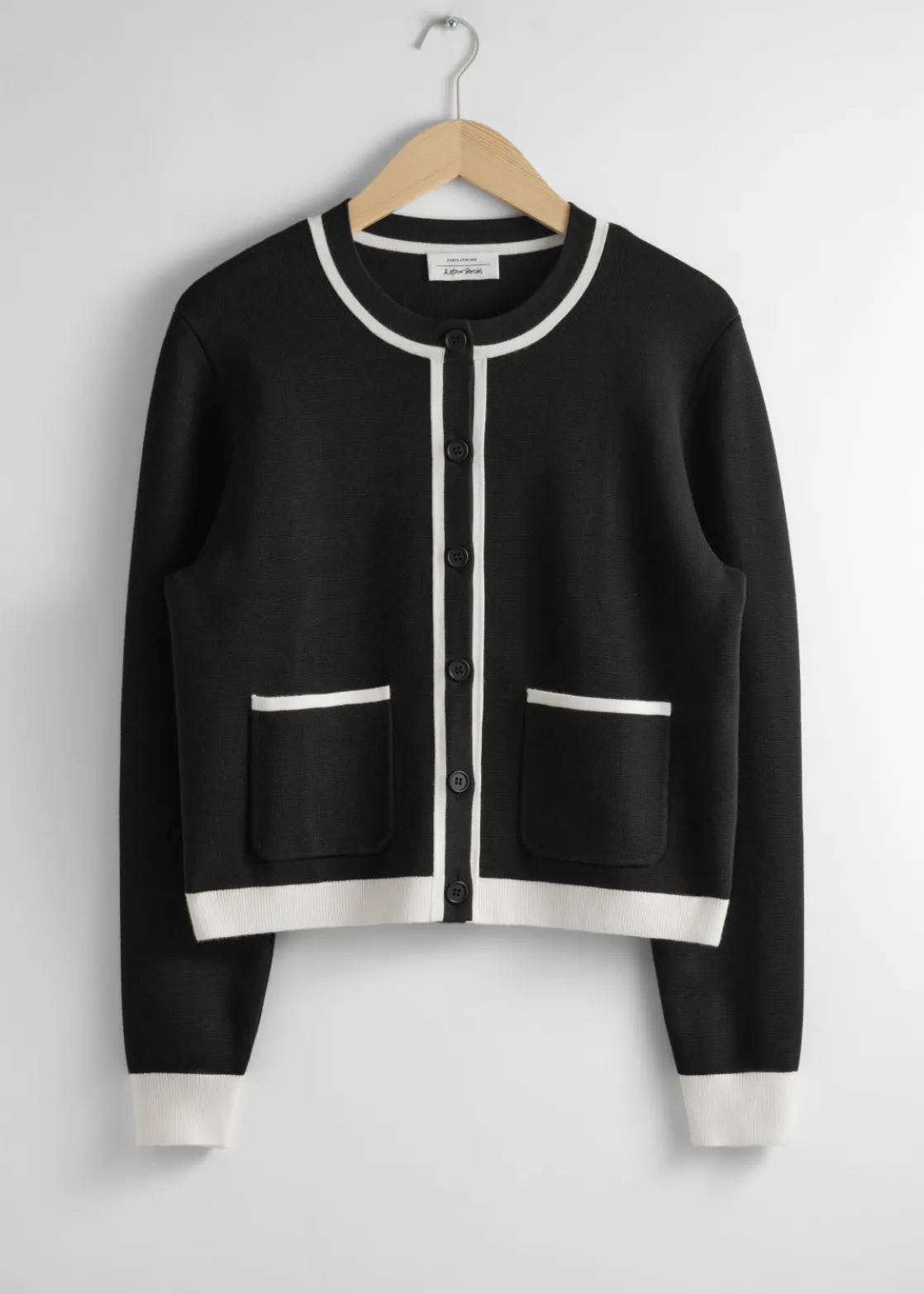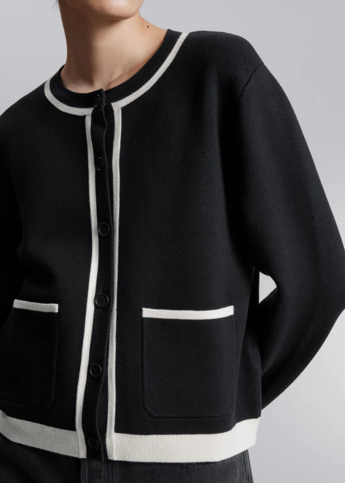 Long-sleeve knit cardigan featuring duo patch pockets. Detailed with contrasting accents at the endings and pockets.