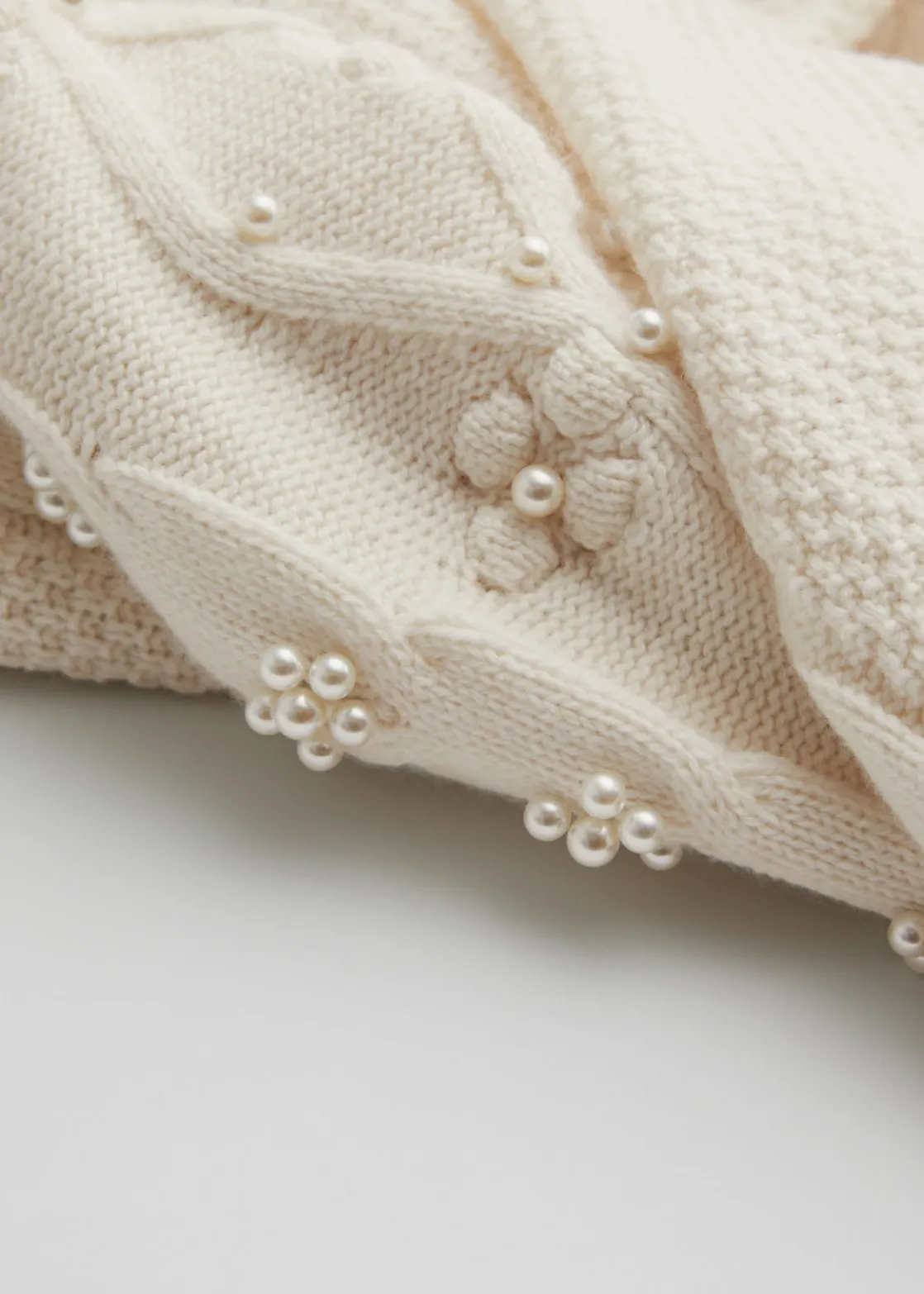 Mock neck wool sweater designed with a cable knit finish and pearl beads.