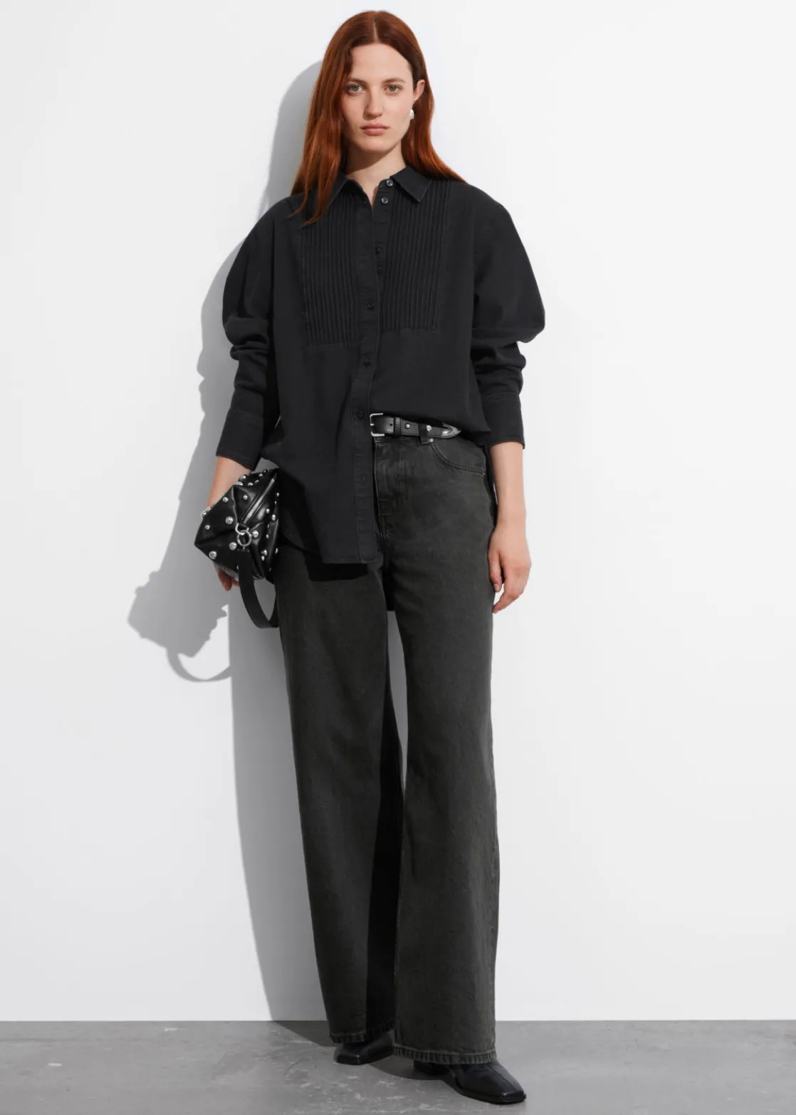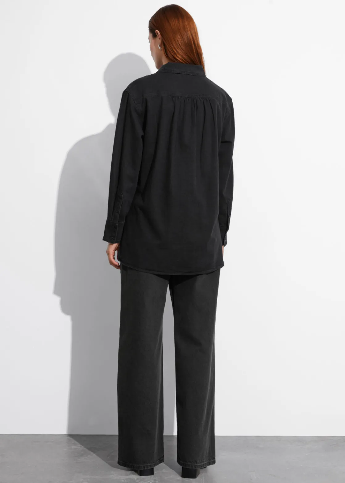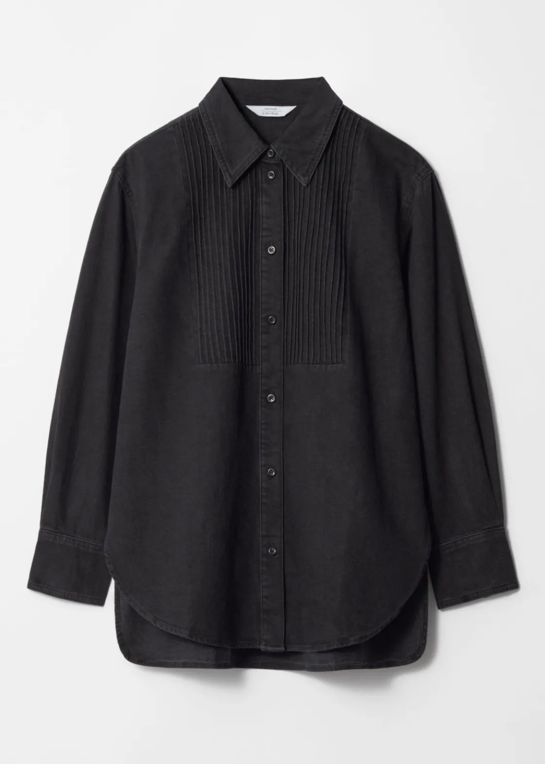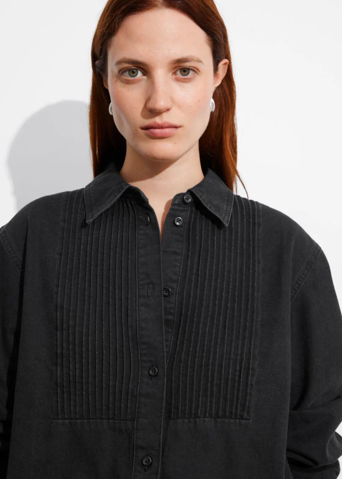 Long-sleeve denim shirt featuring pleated detailing at the chest. Finished with a slightly longer back part.