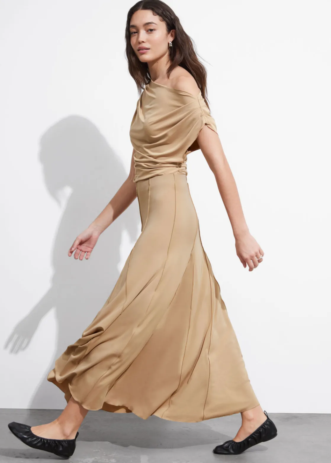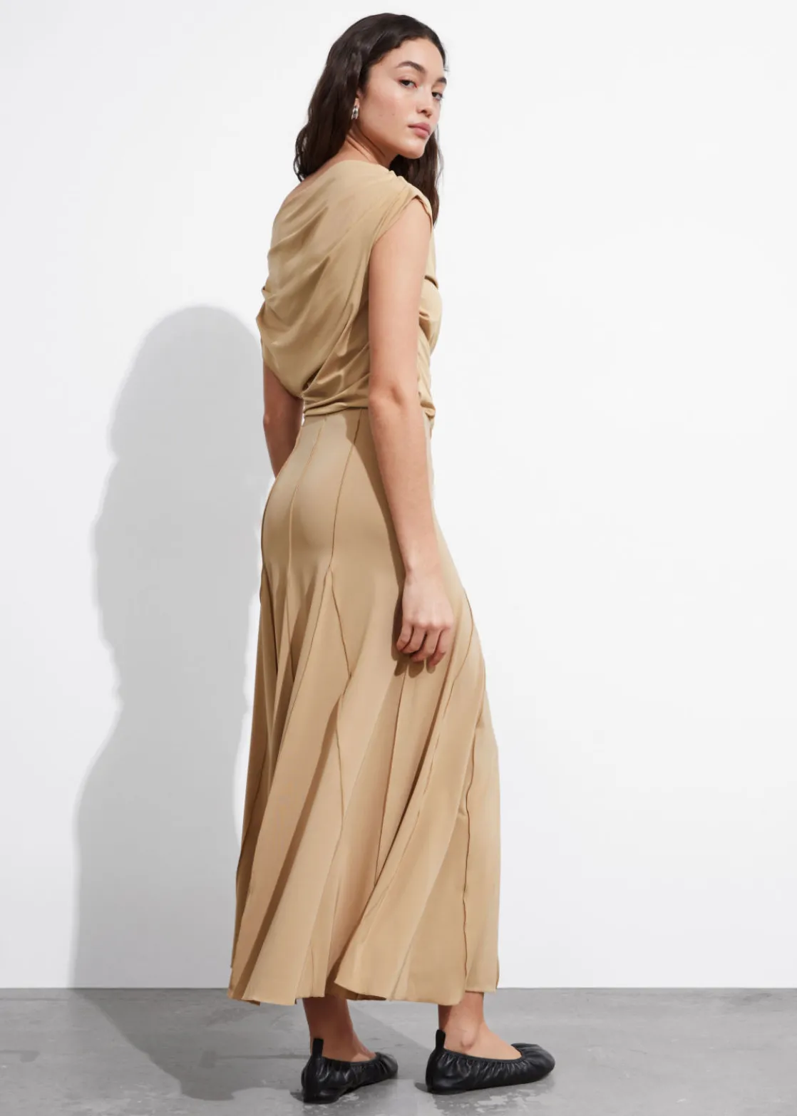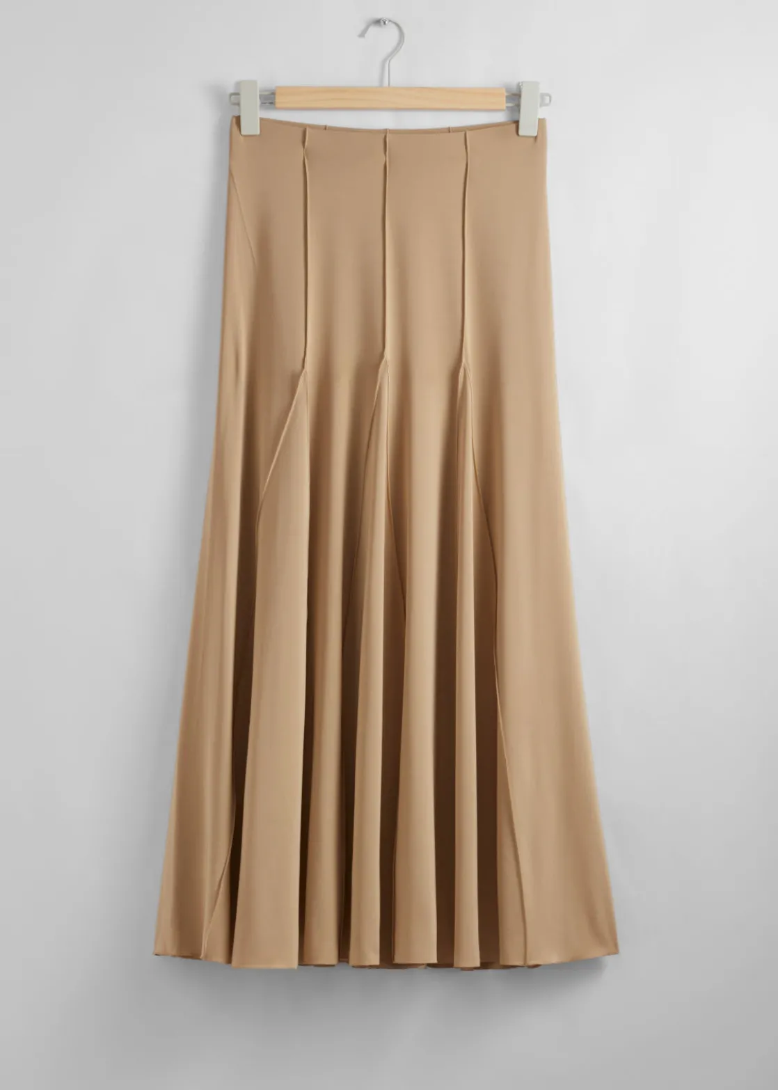 High-waist midi skirt featuring a gently pleated finish. Detailed with vertical seams at the top.