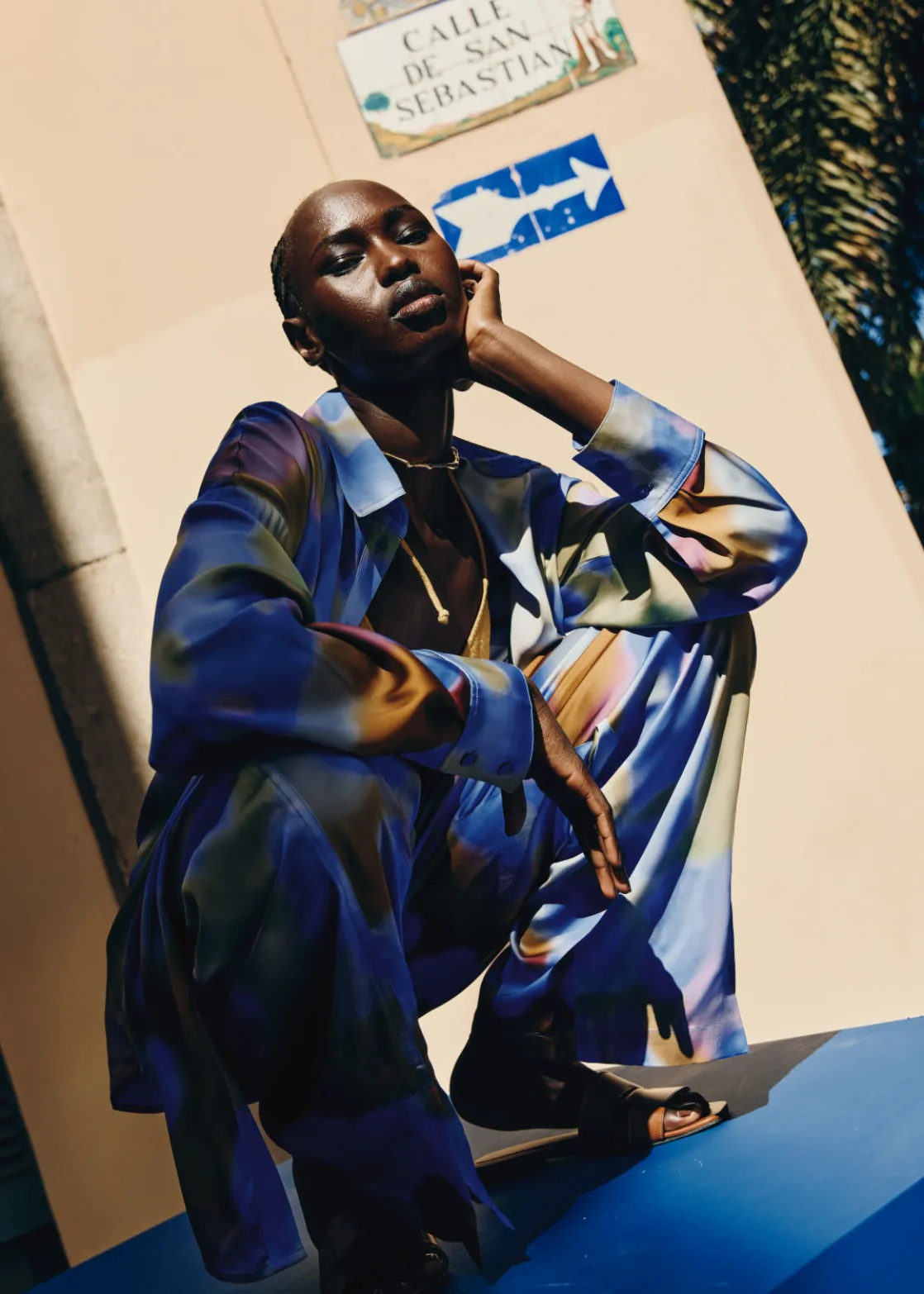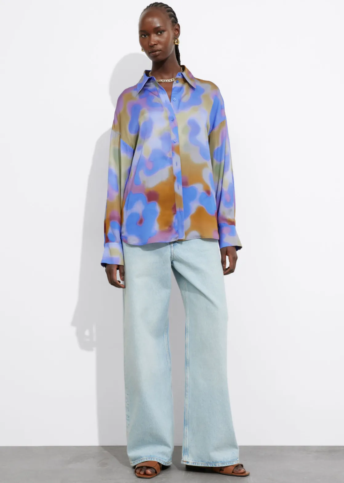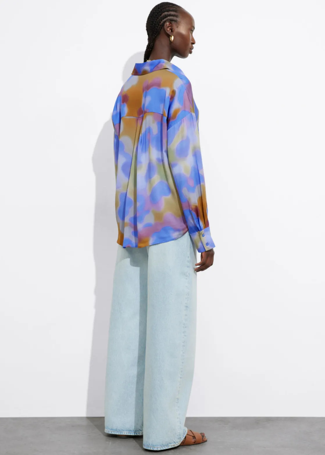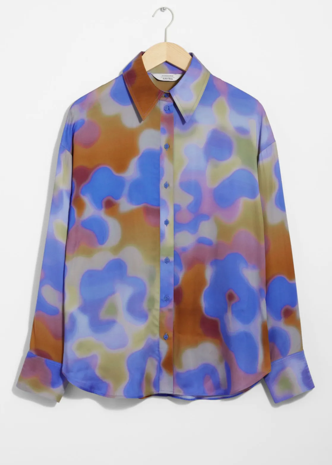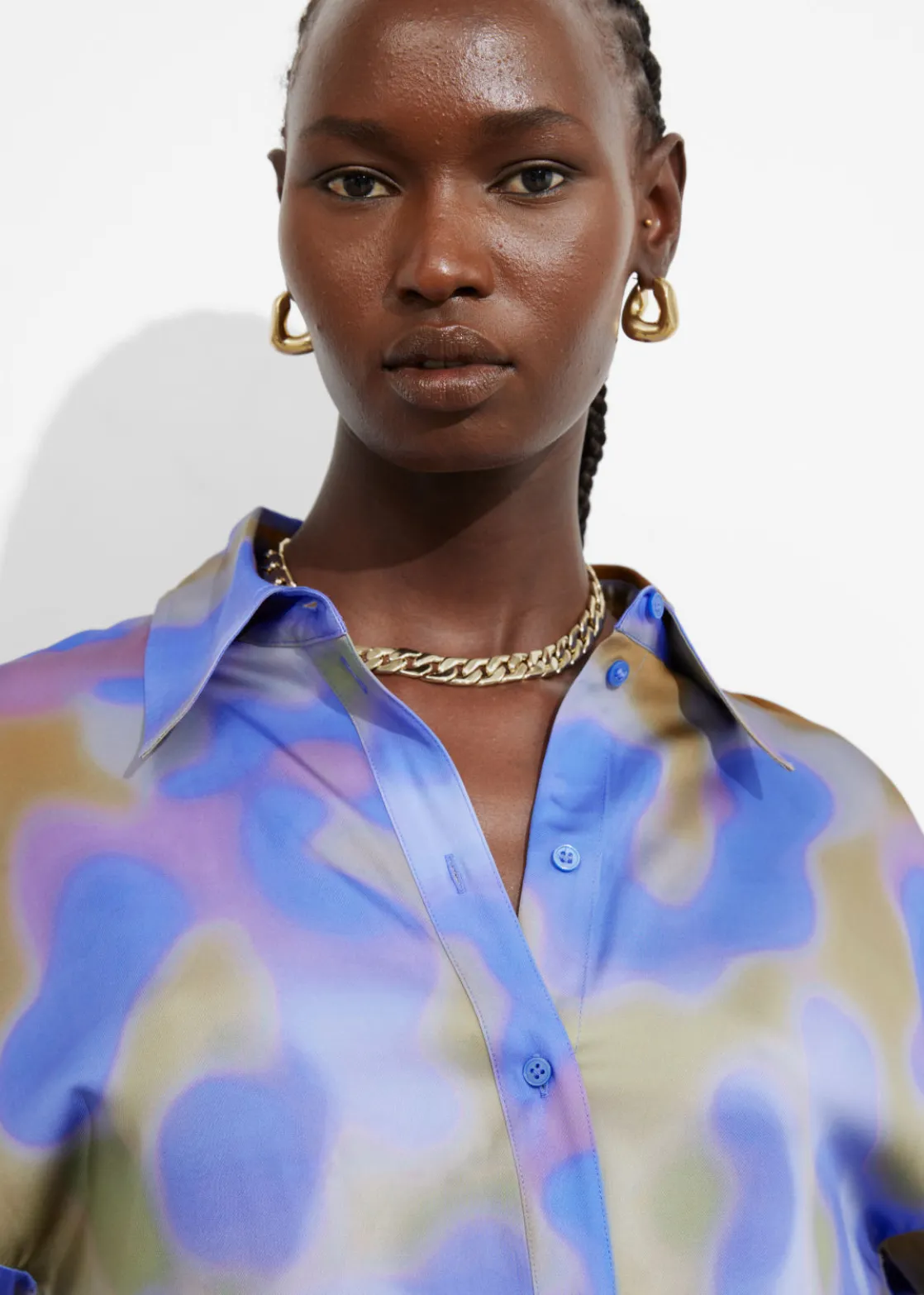 Printed satin shirt cut in a relaxed silhouette. Traced with centre front button closures.