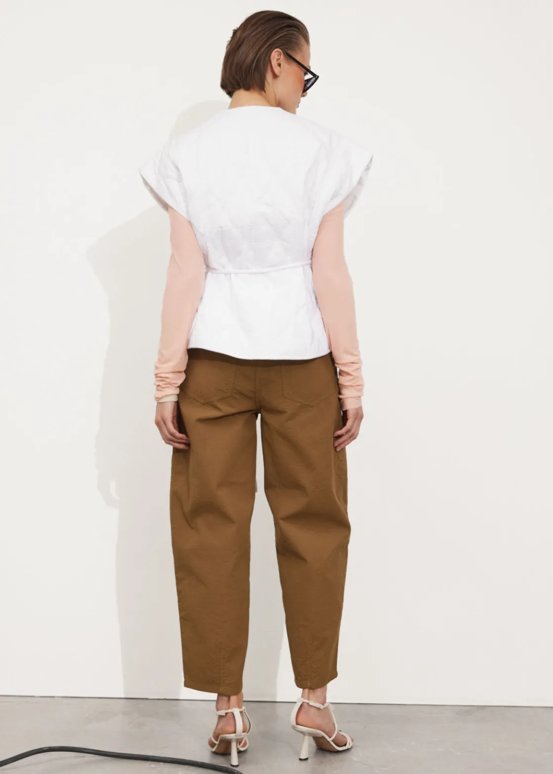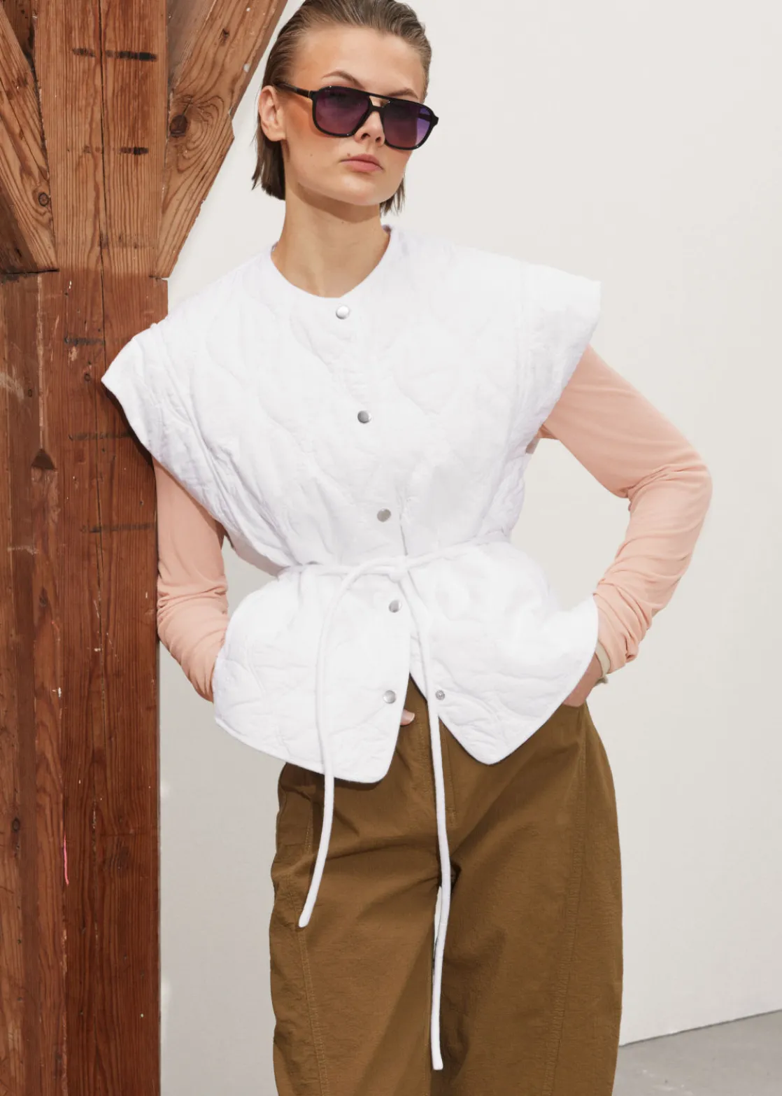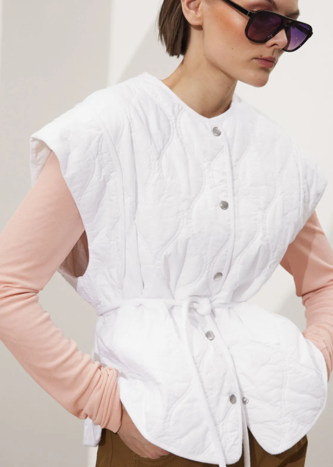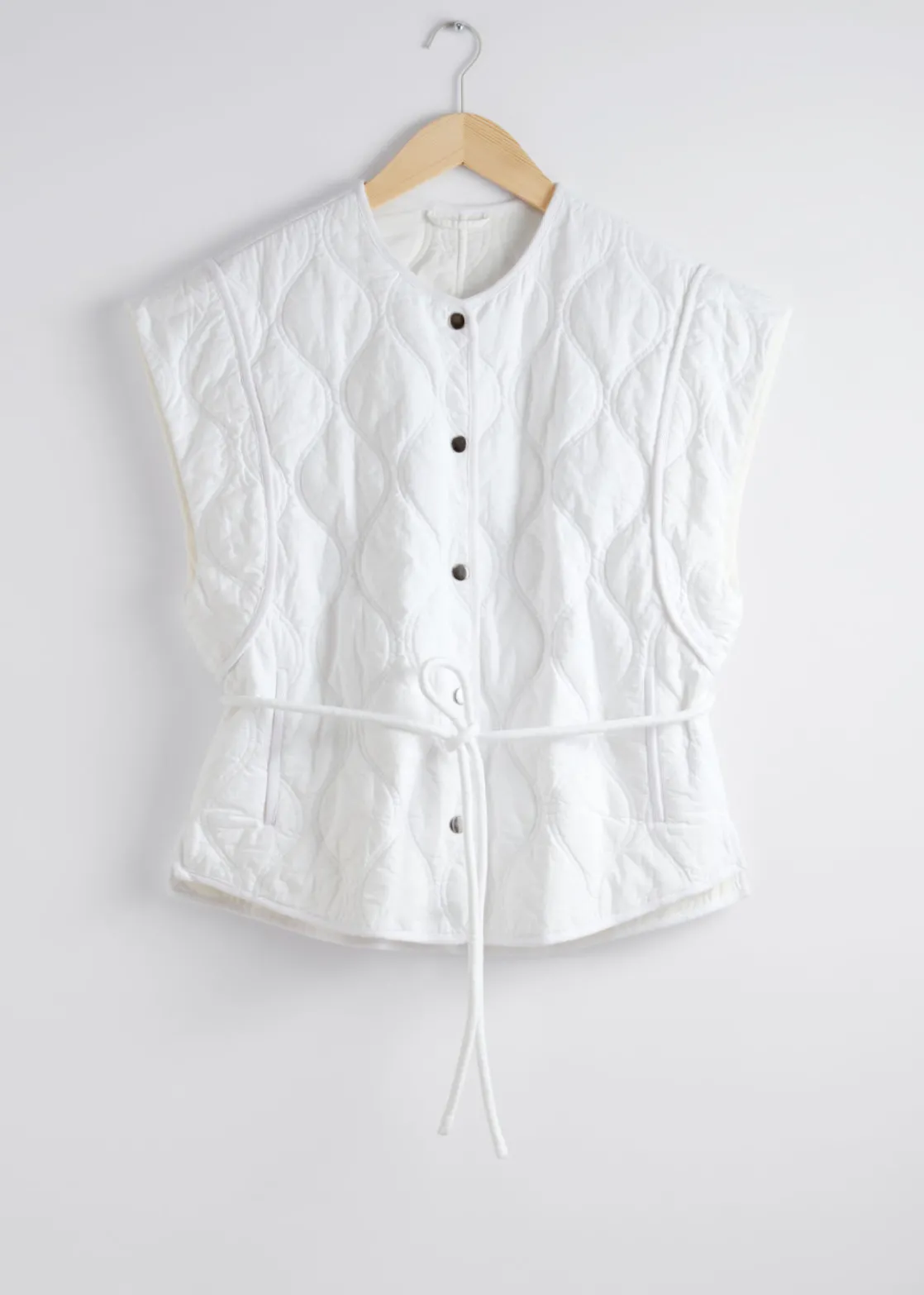Buttoned gilet vest with a padded, quilted finish. Secured with a thin rope belt.