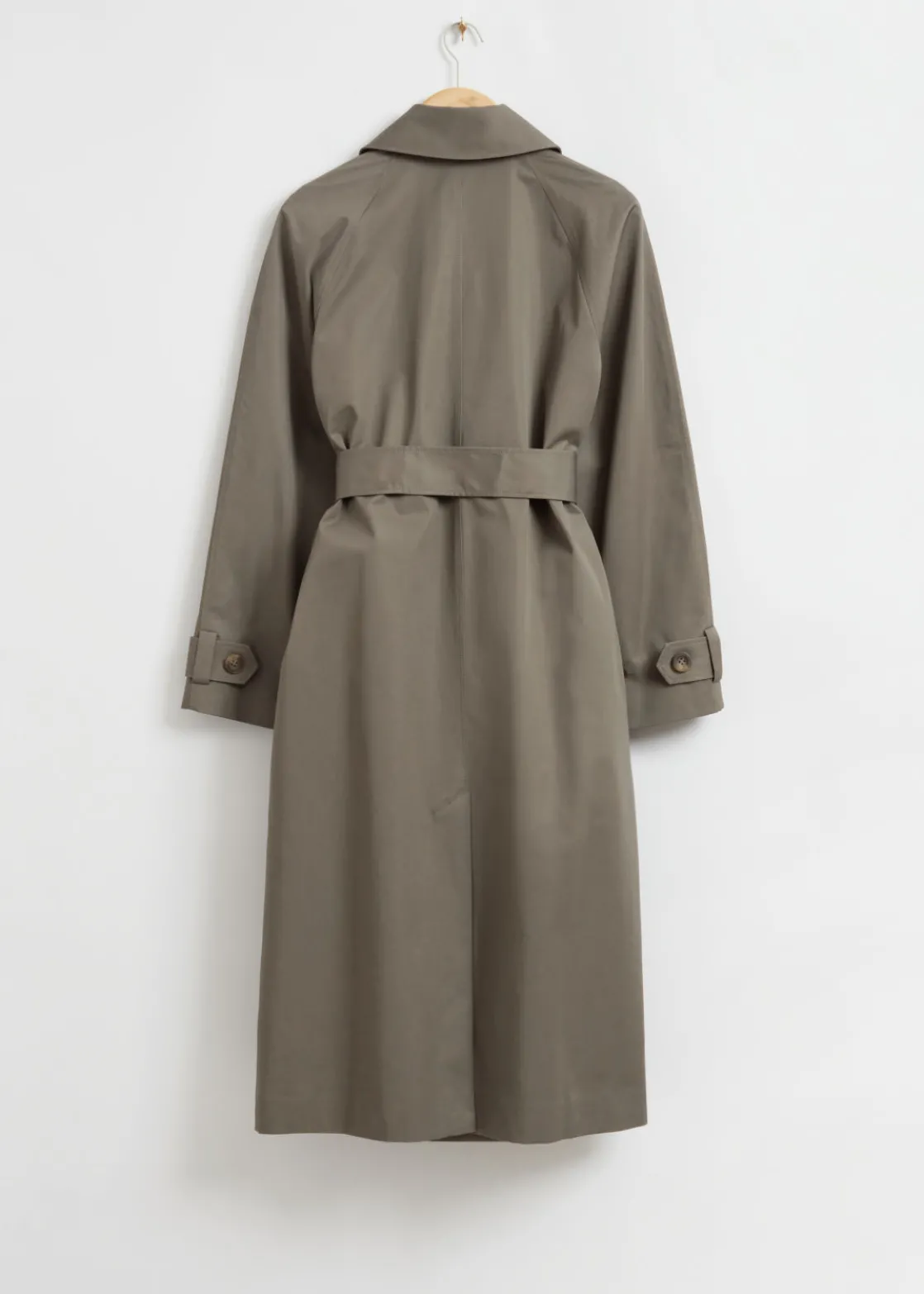Relaxed midi length trench coat with a belted waist and one button front closure, two slanted welt pockets with flaps and belted cuffs.