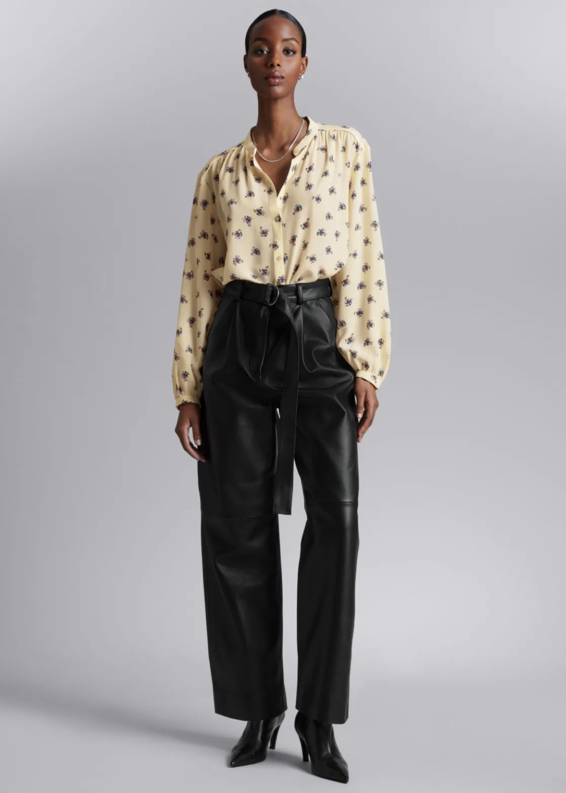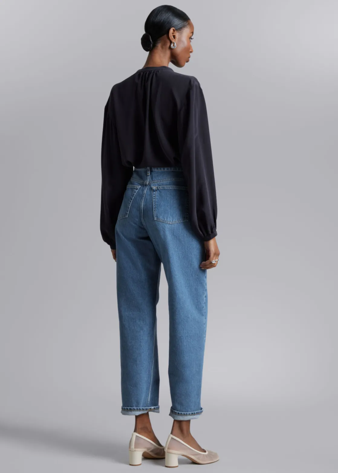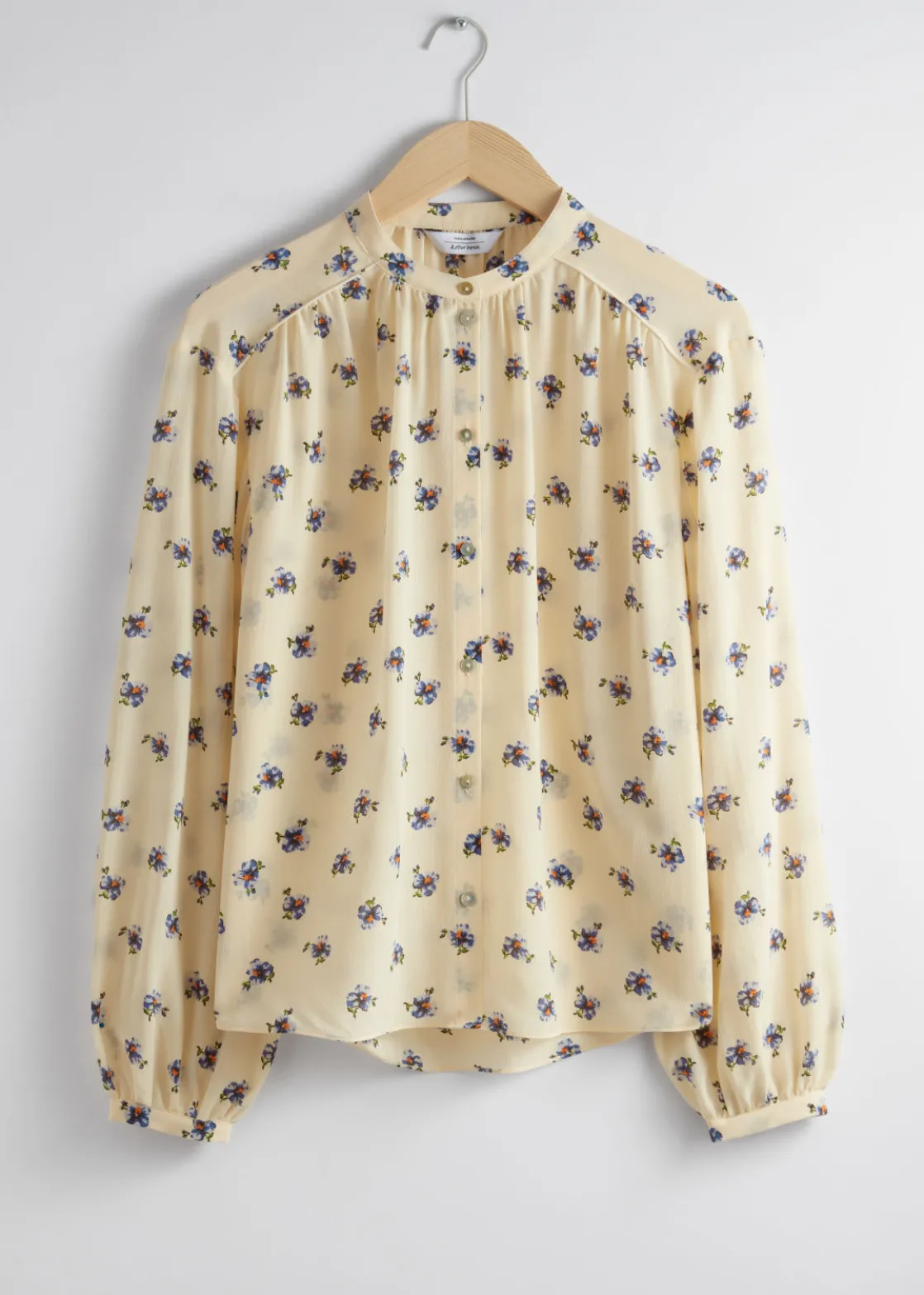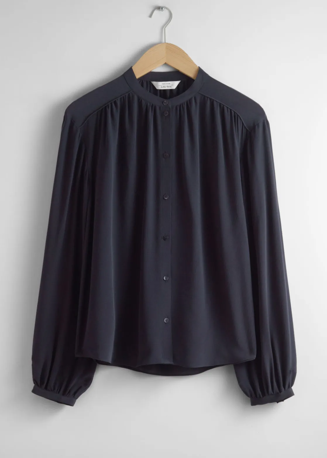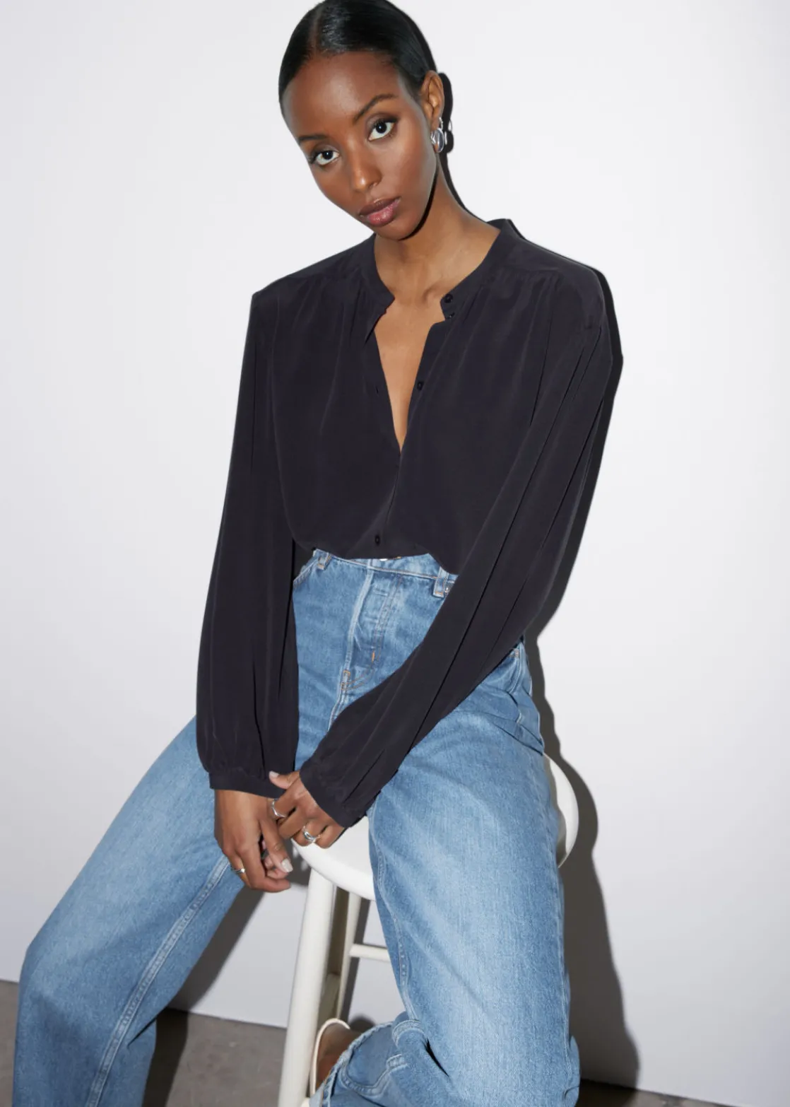 Long-sleeve silk blouse cut from mulberry silk. Traced with seven button closures.