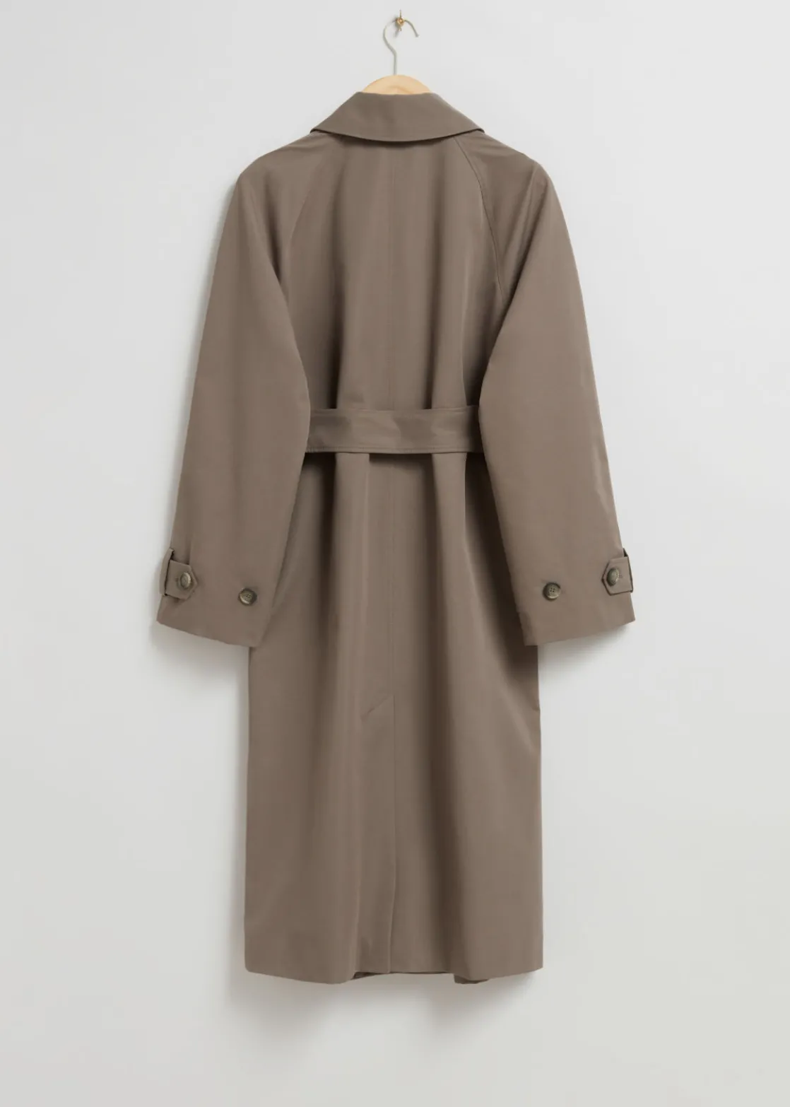 Relaxed trench coat featuring a classic belted finish and duo welt pockets with flaps.