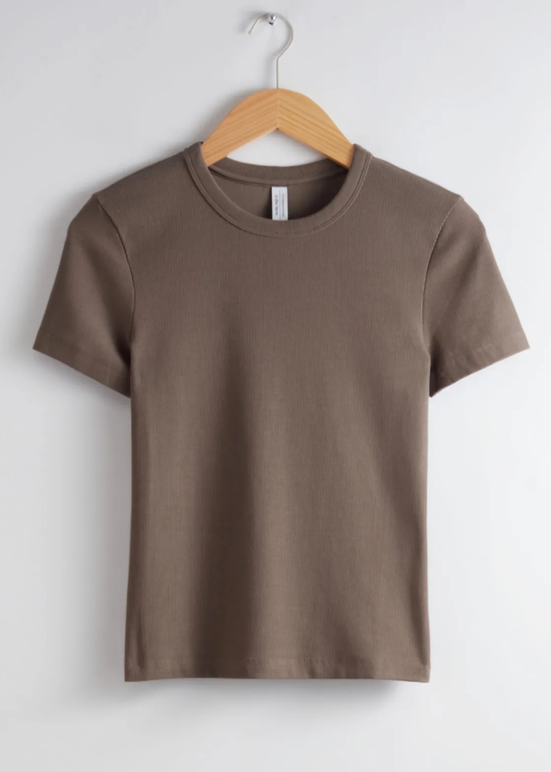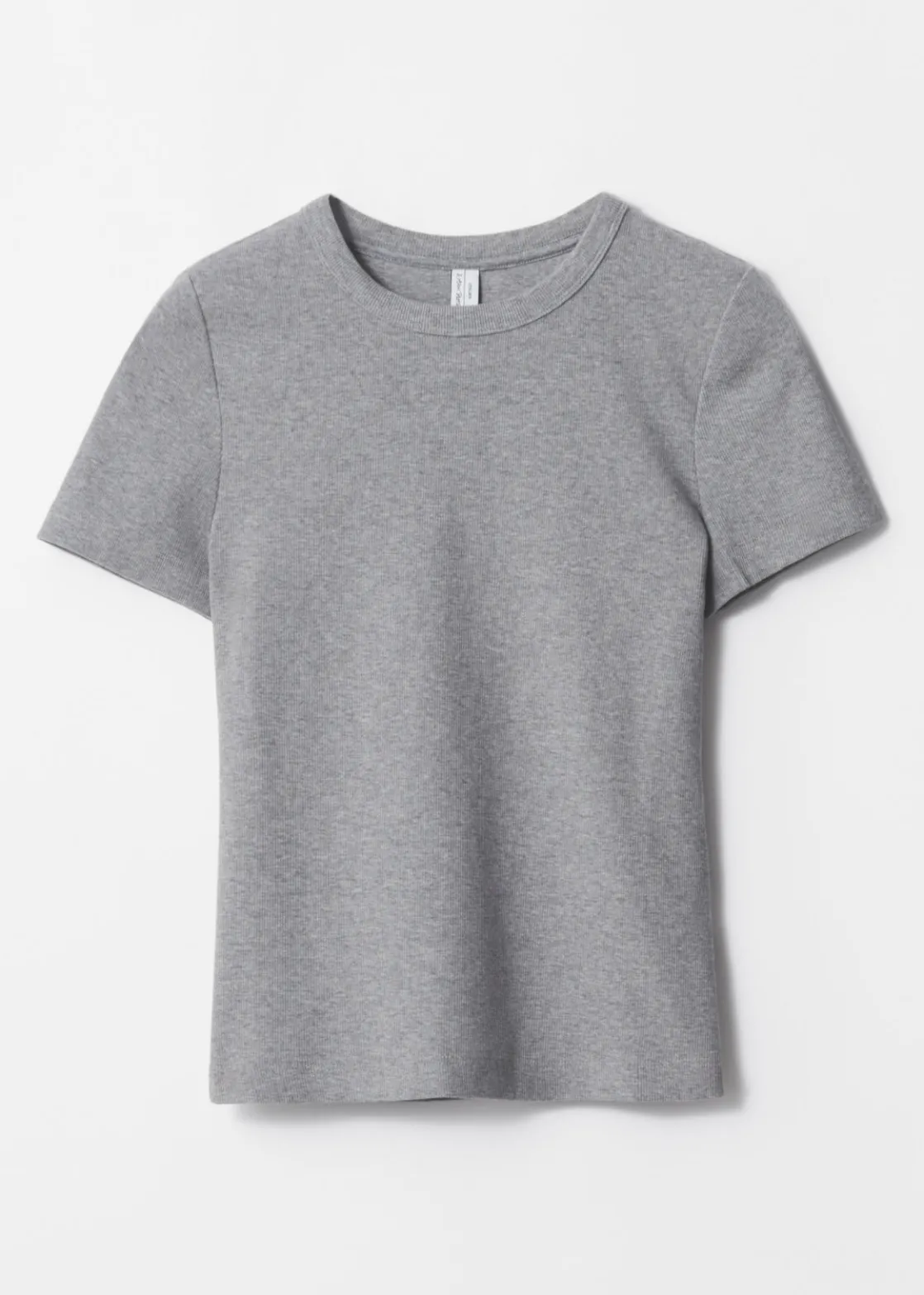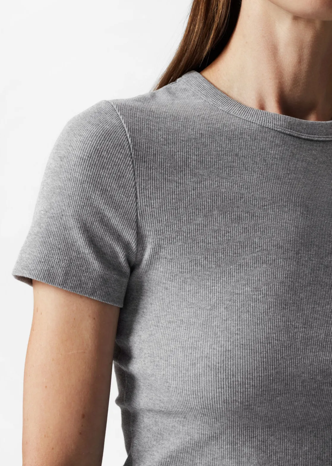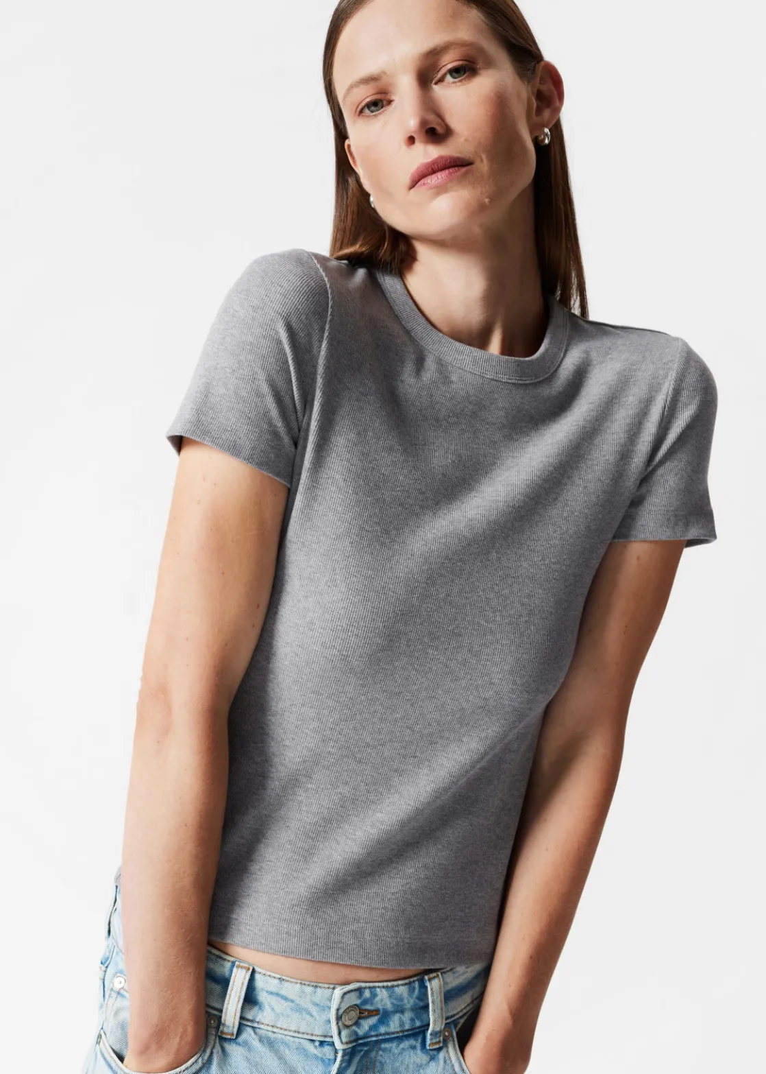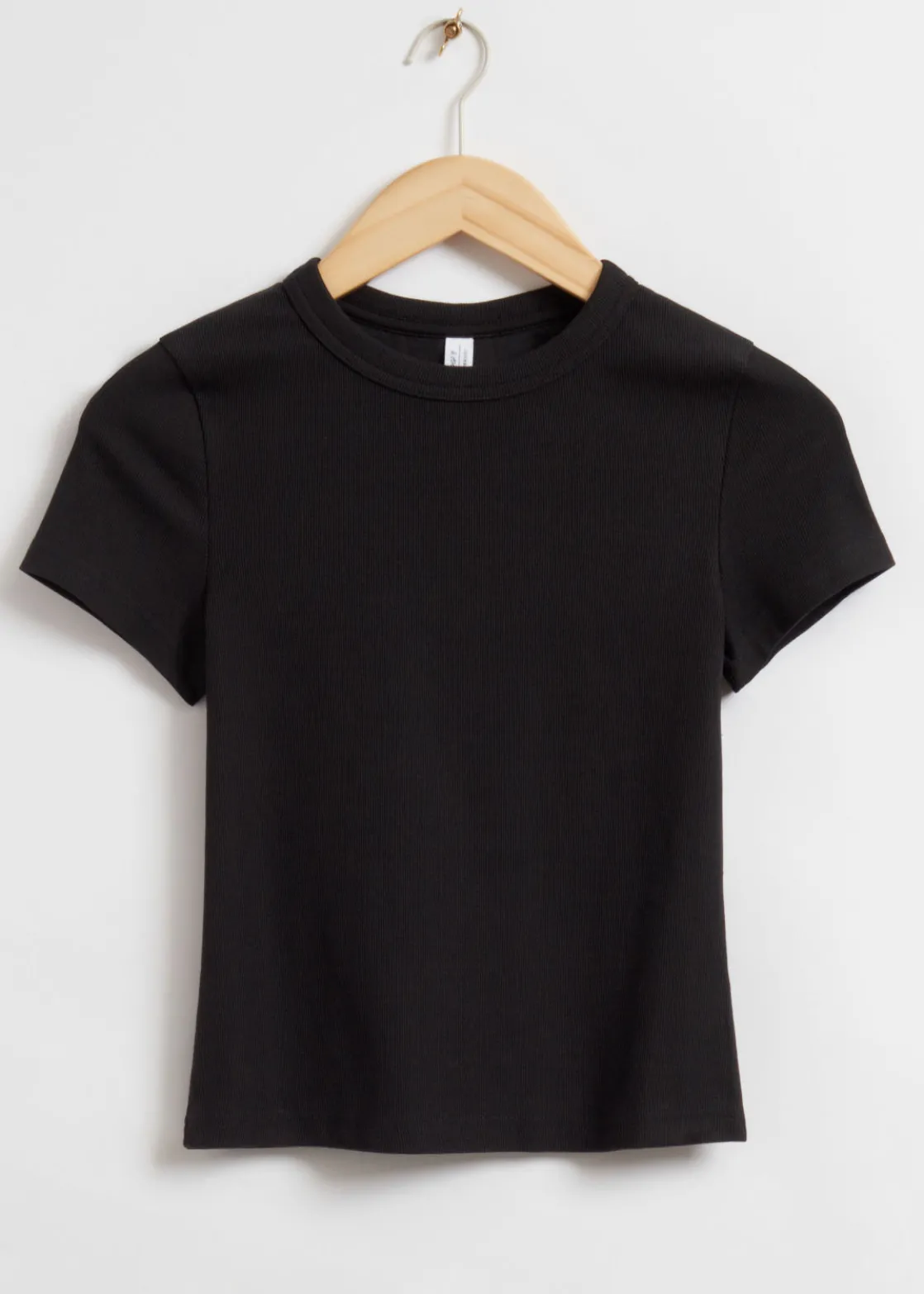 Cropped t-shirt featuring short sleeves and a round neckline.