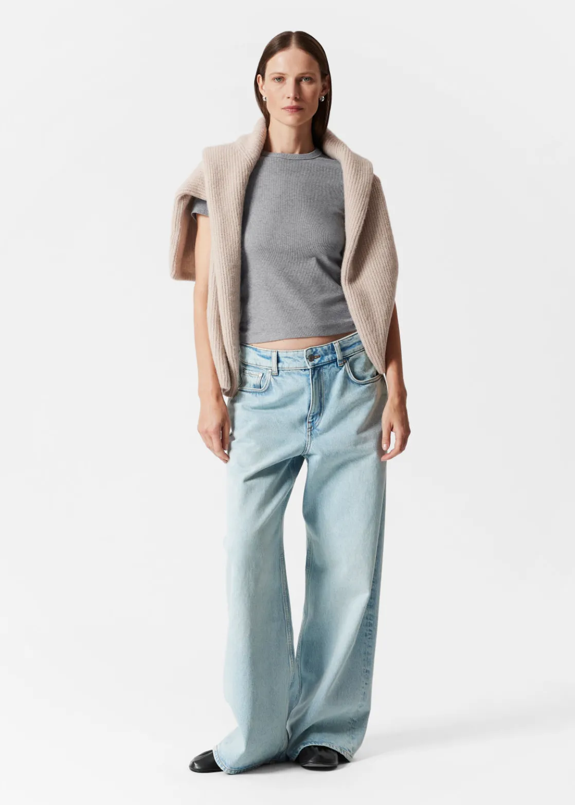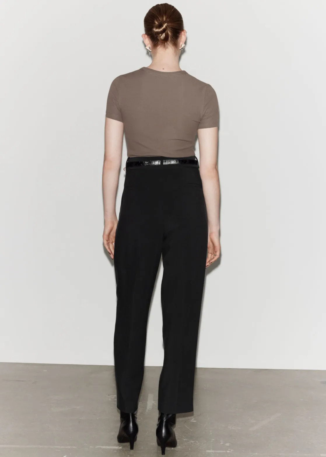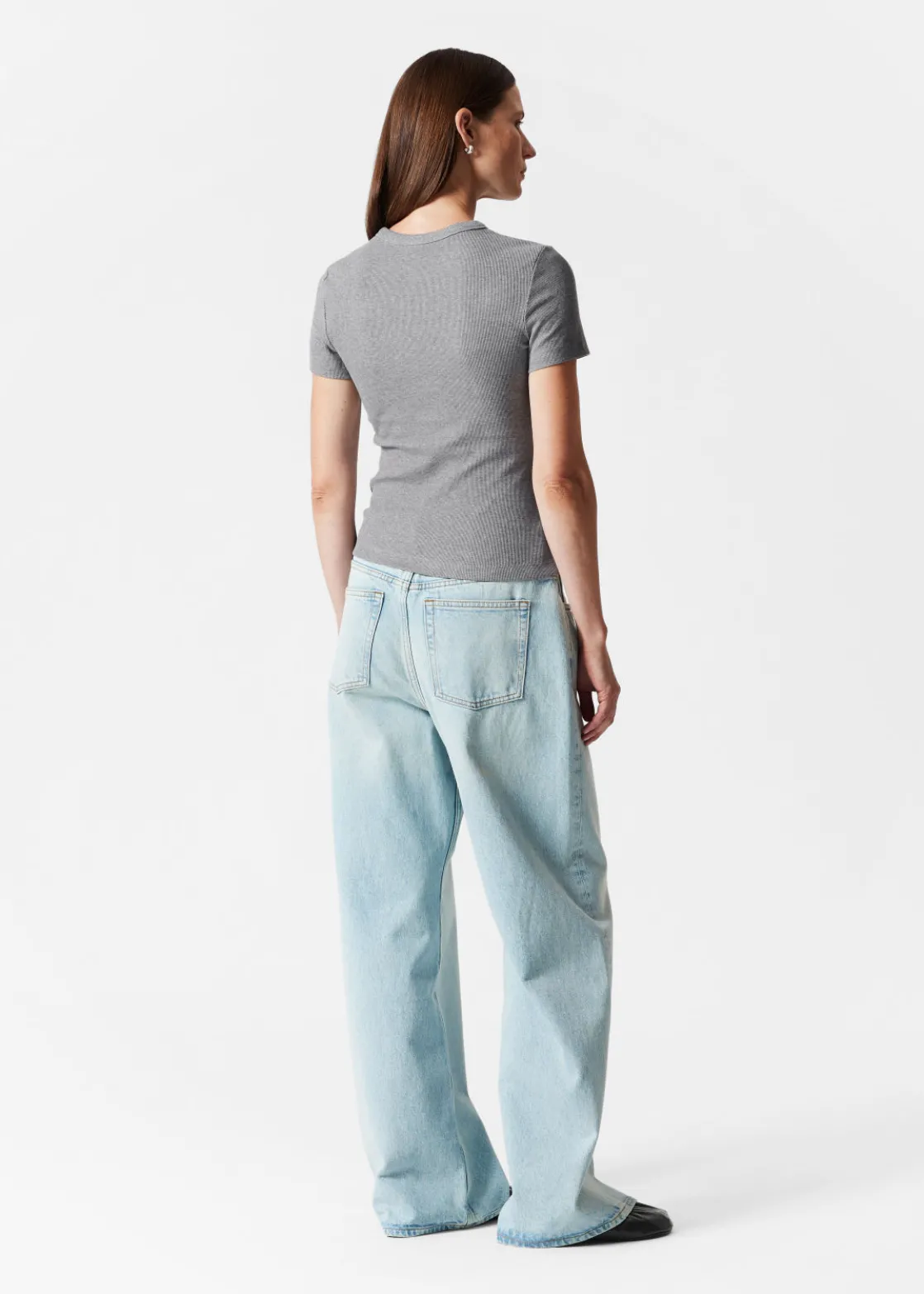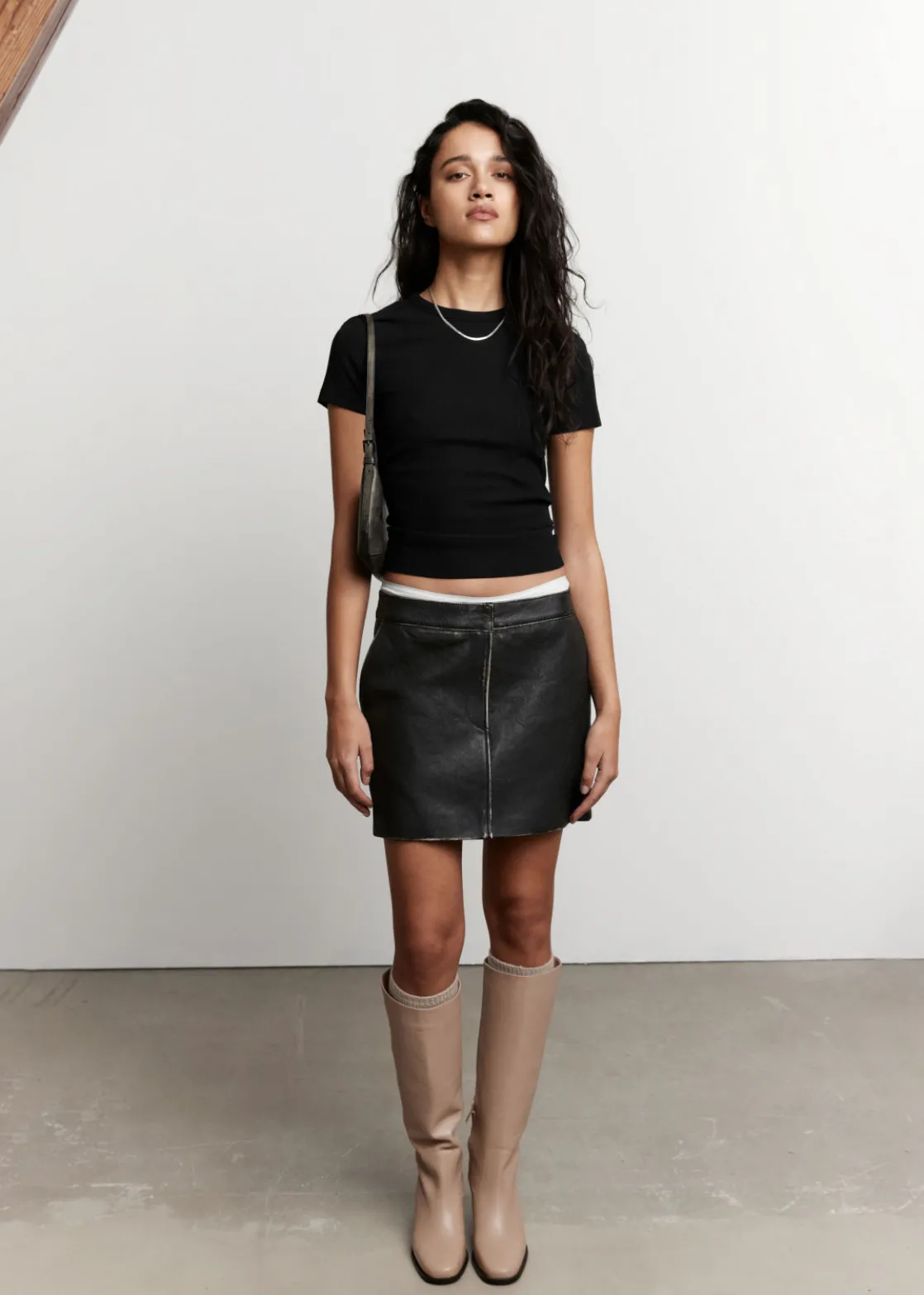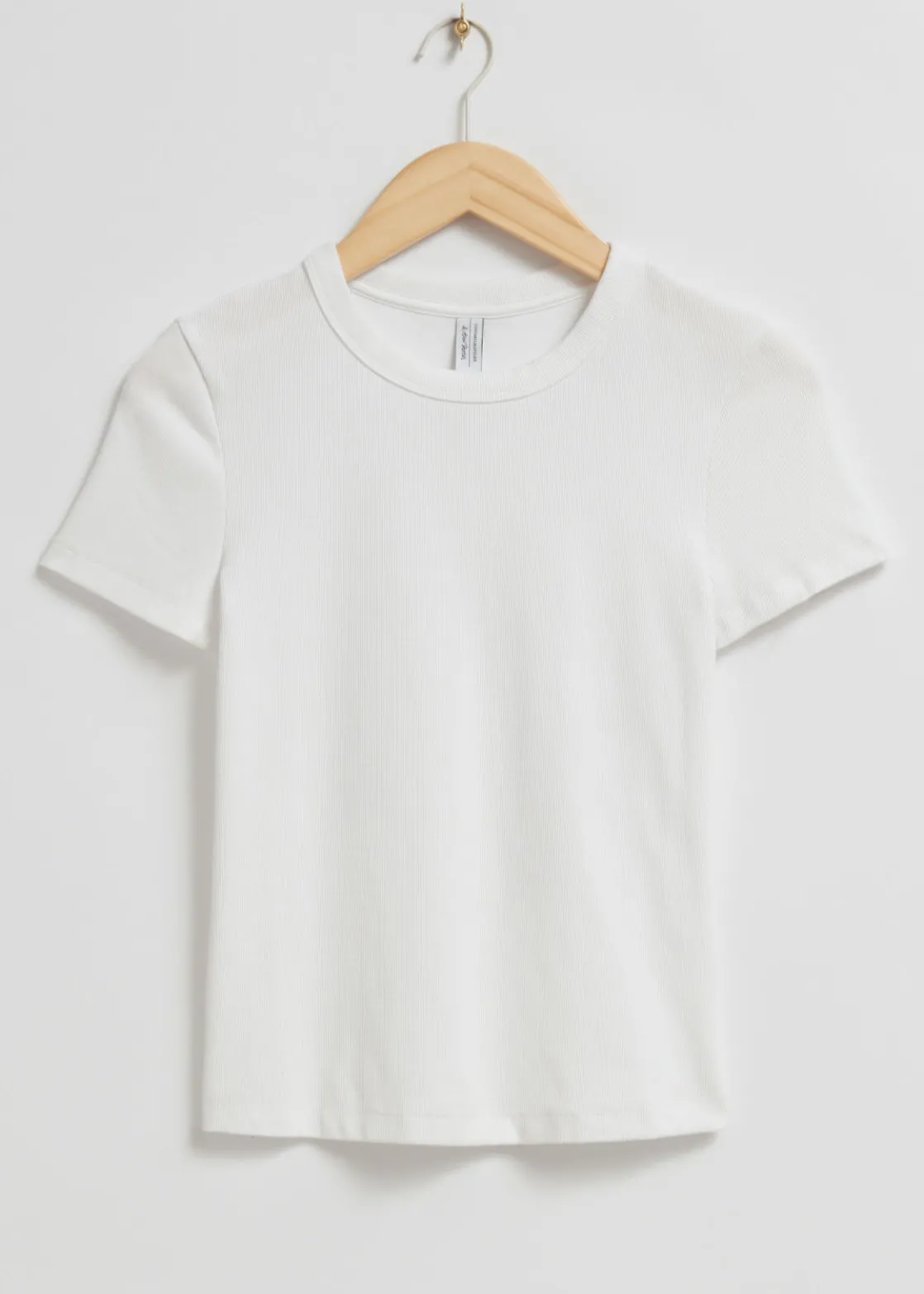 Cropped t-shirt featuring short sleeves and a round neckline.