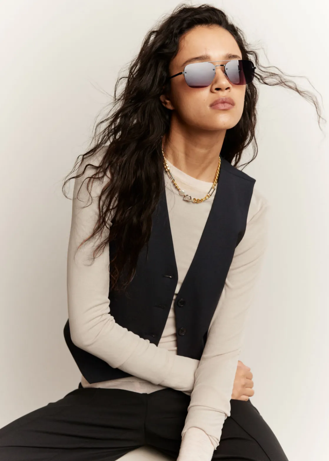 These rimless aviator-style sunglasses are set with smokey lenses, brow bar and slim arms.