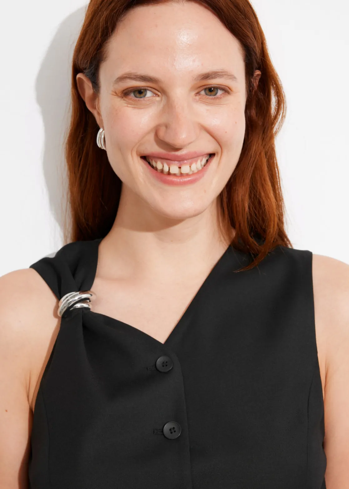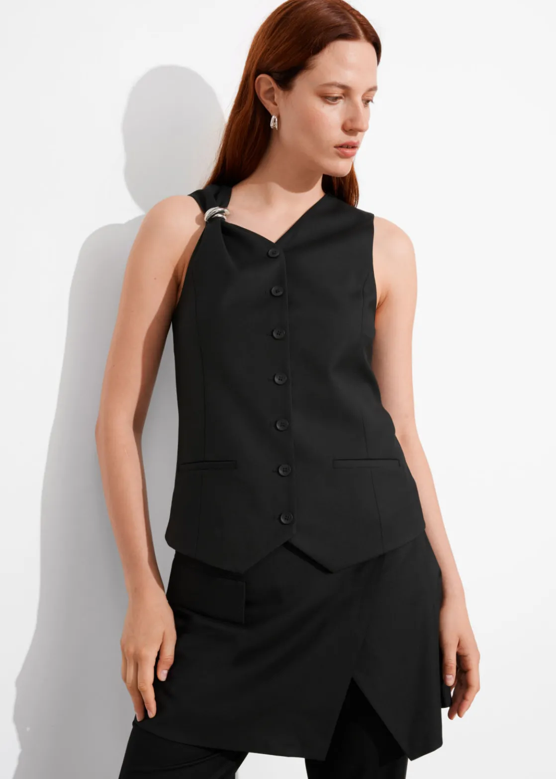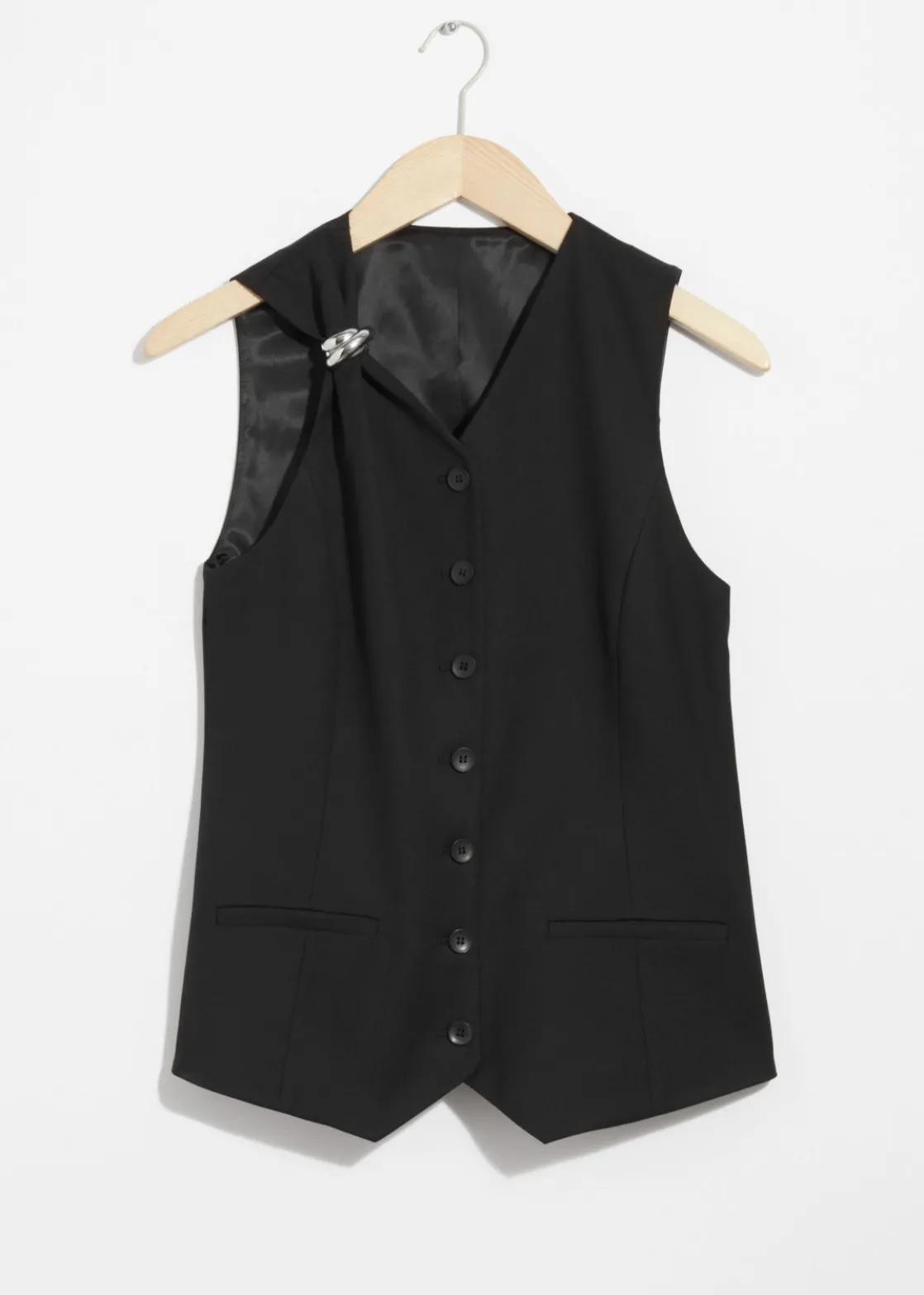 Tailored vest accented with a silver-toned ring at one shoulder.