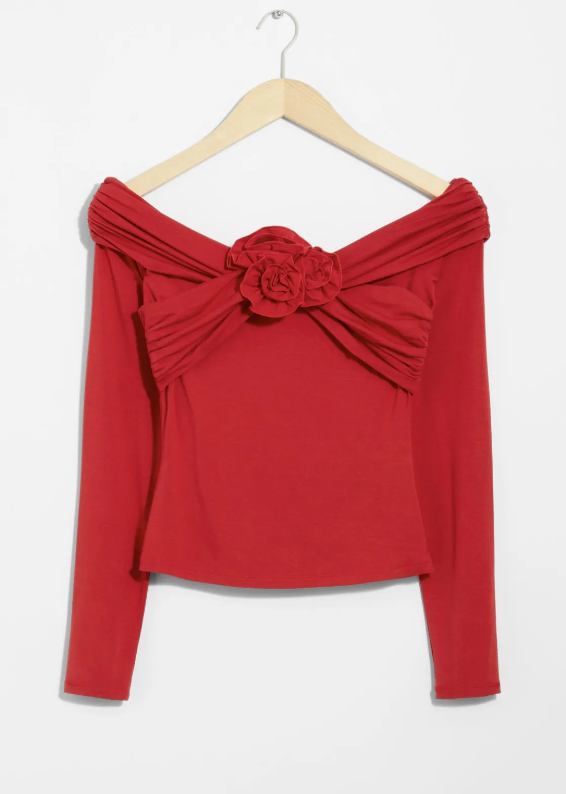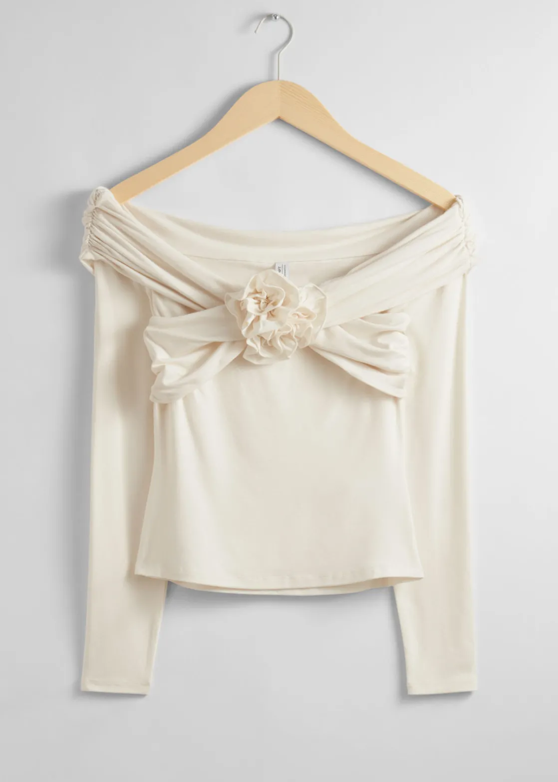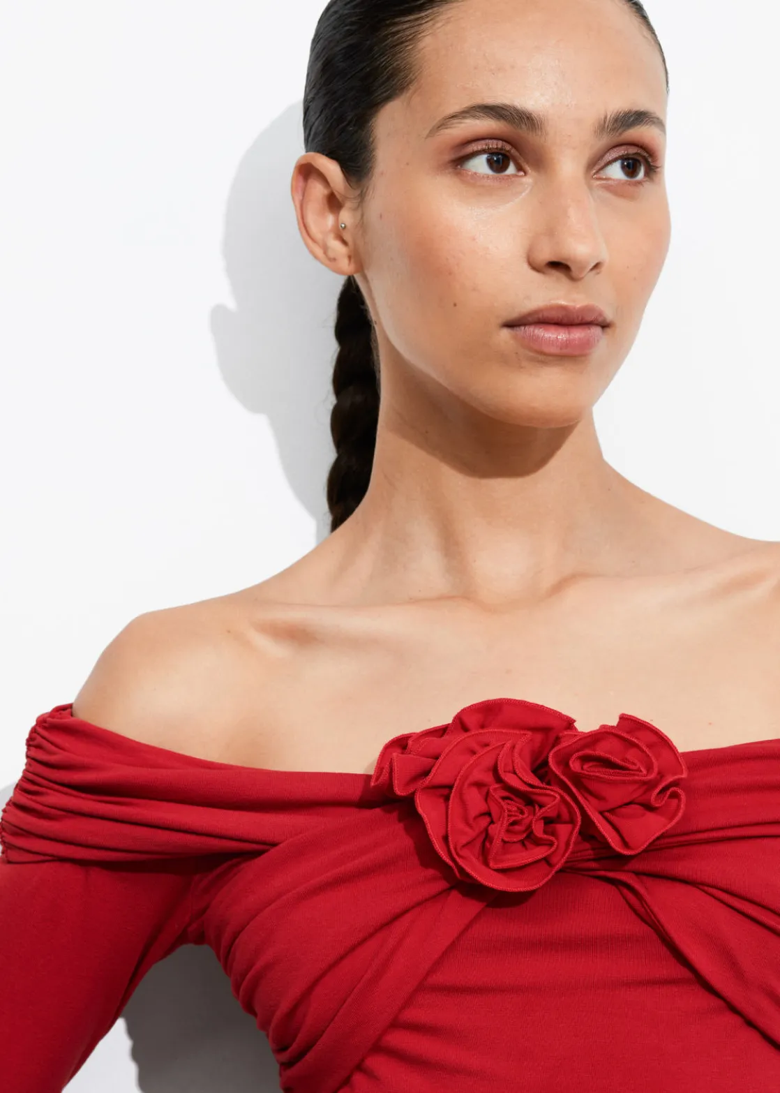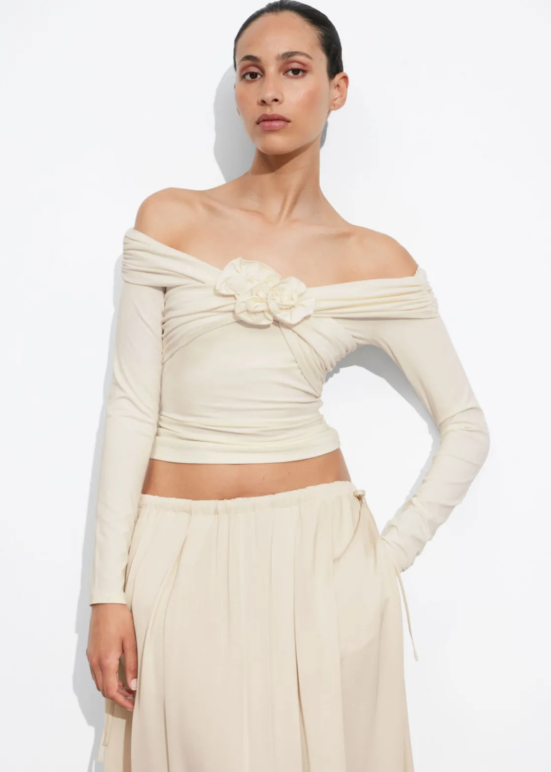 Slim long-sleeve off-shoulder top featuring a ruched neckline with a floral appliqué detail.
