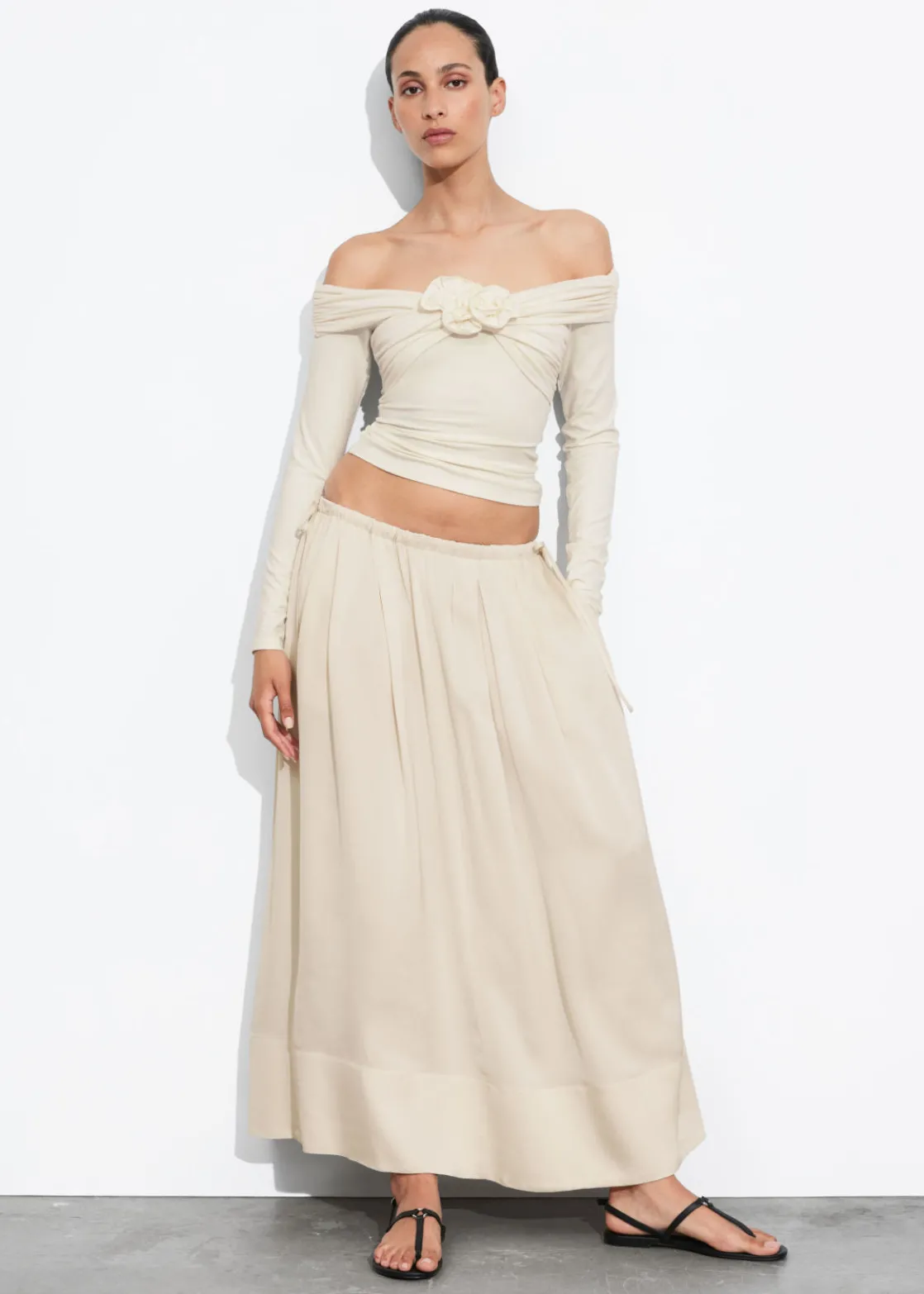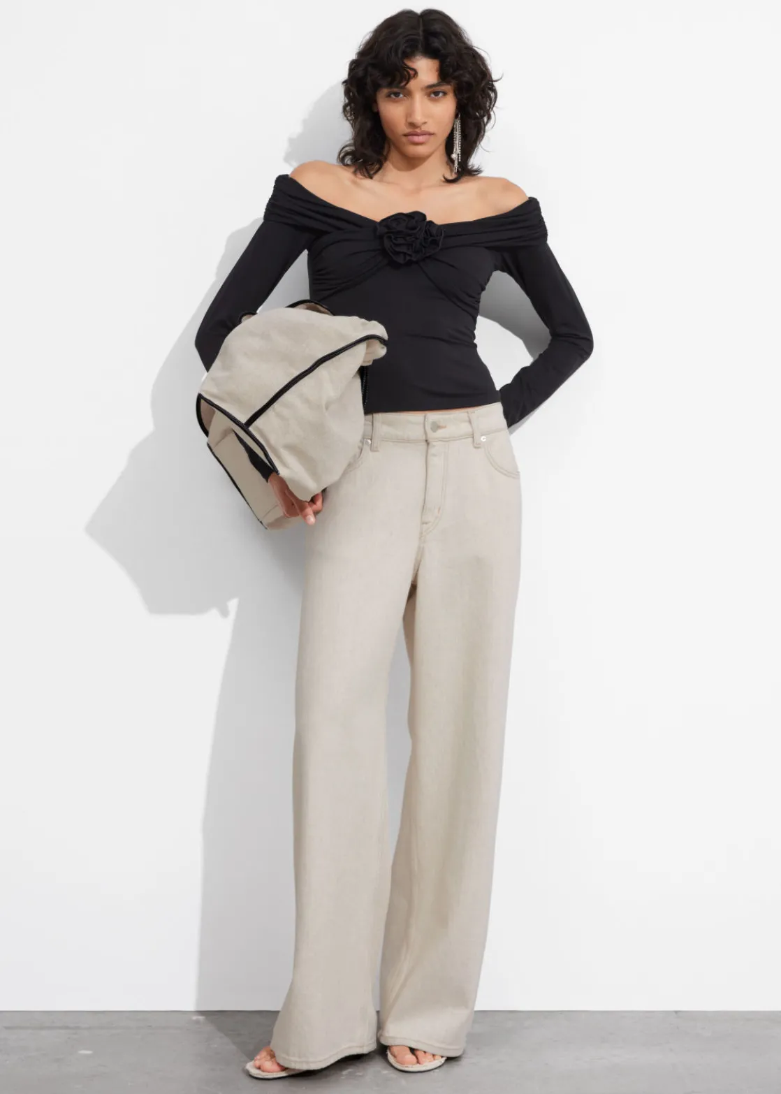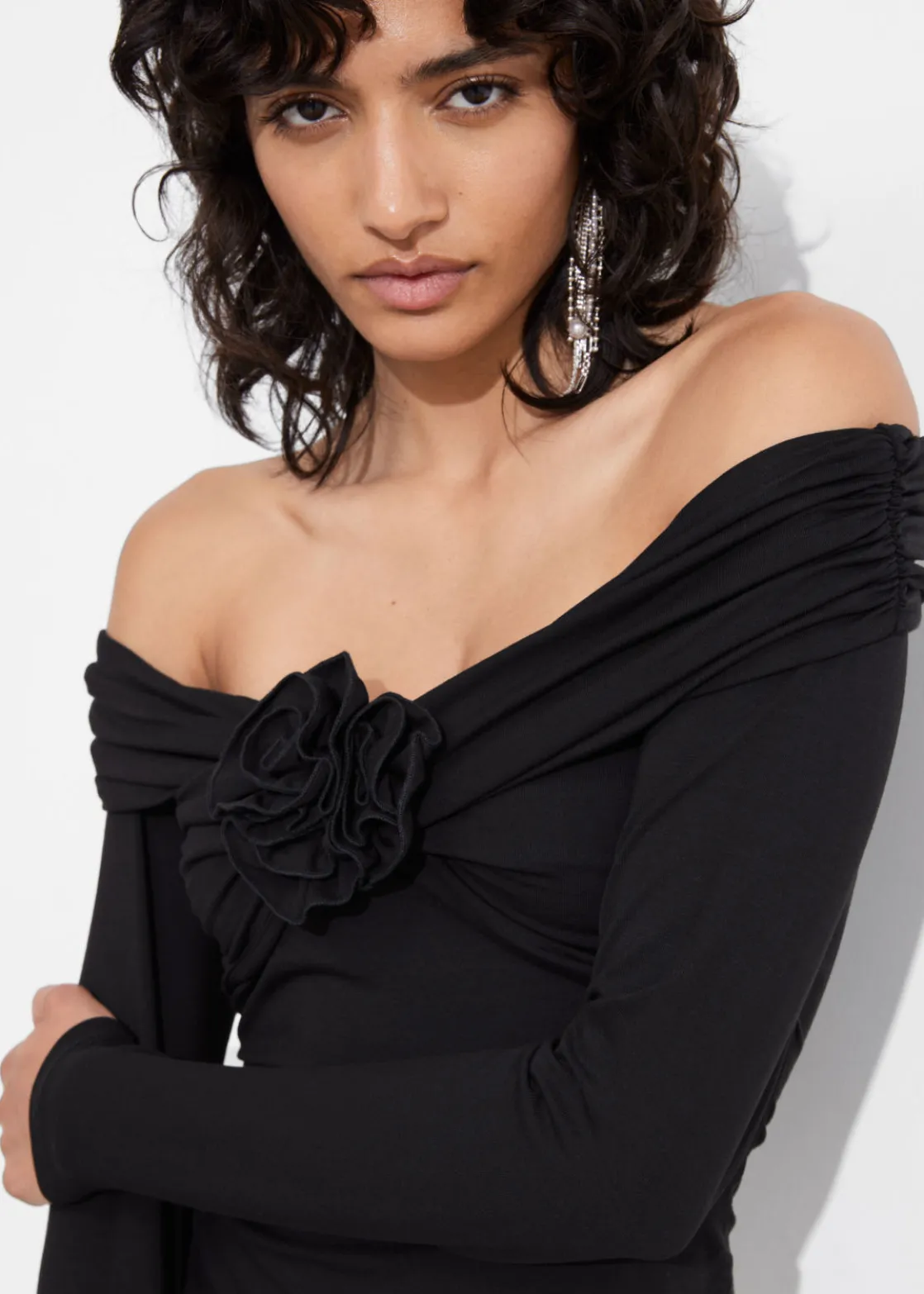 Slim long-sleeve off-shoulder top featuring a ruched neckline with a floral appliqué detail.