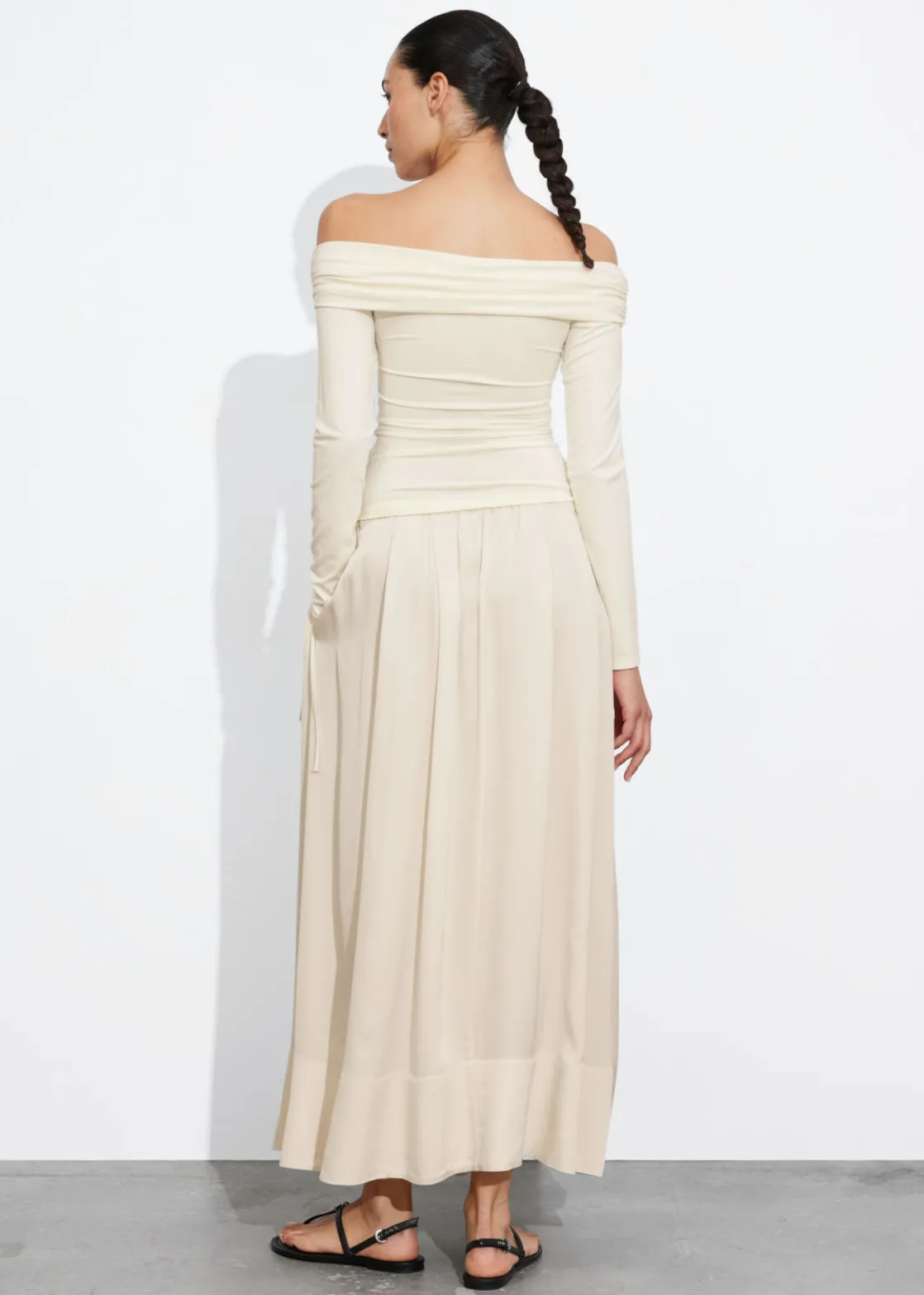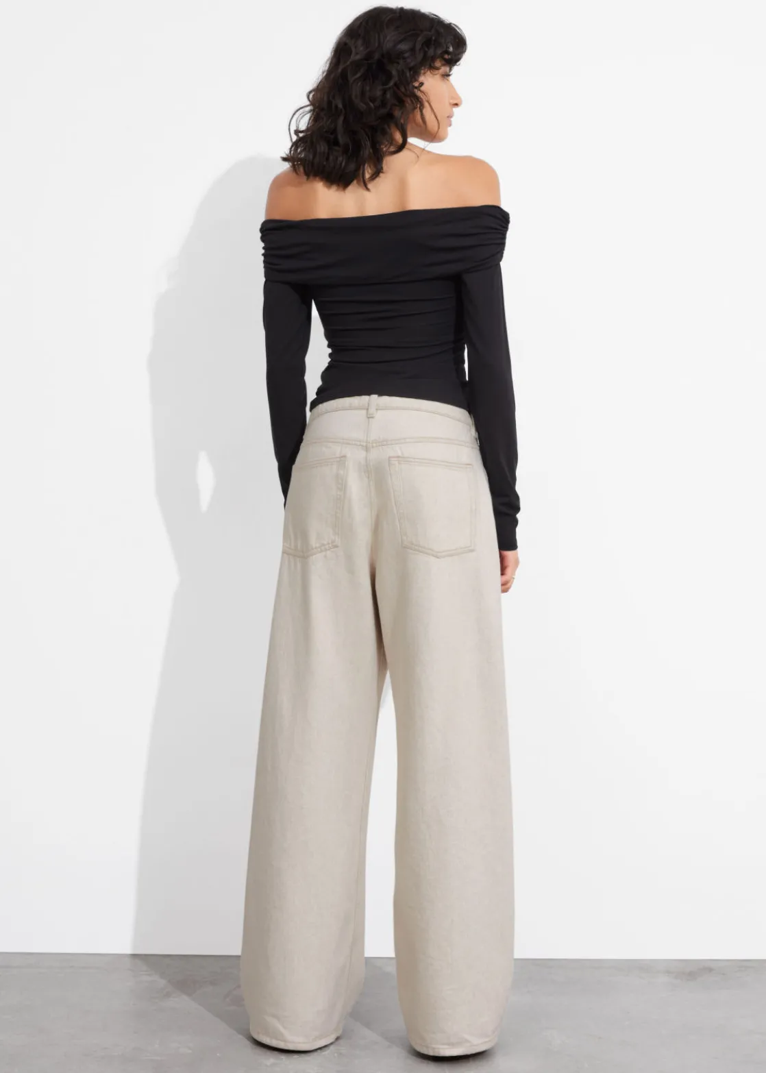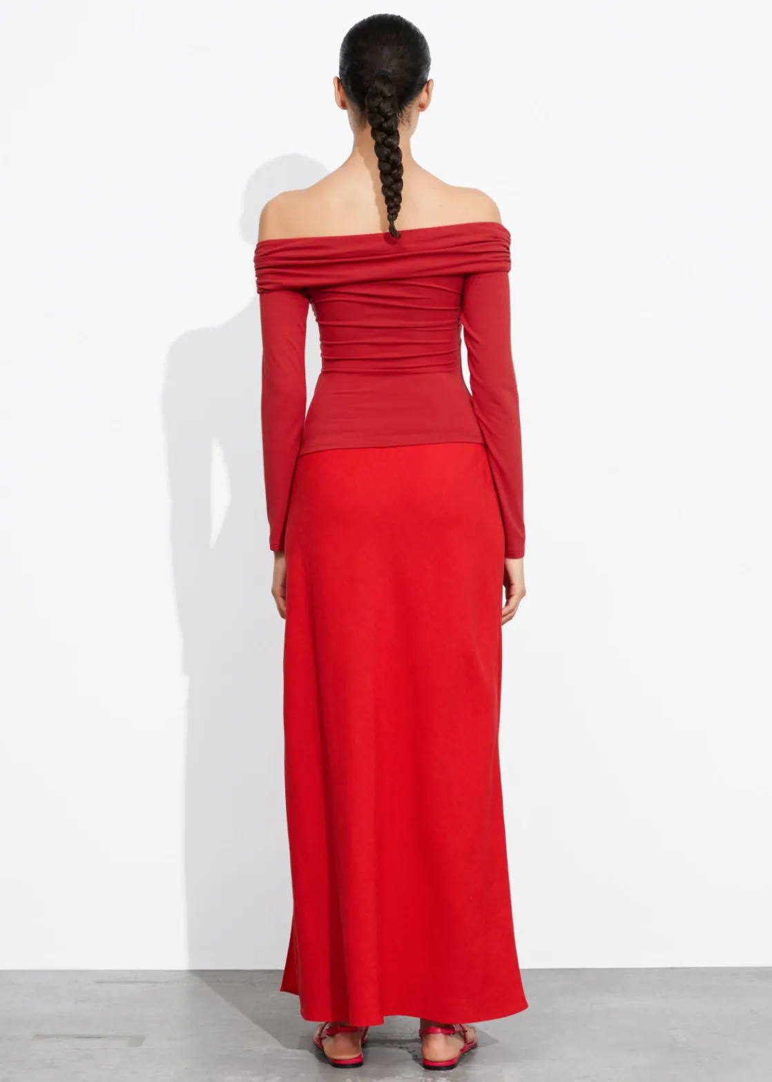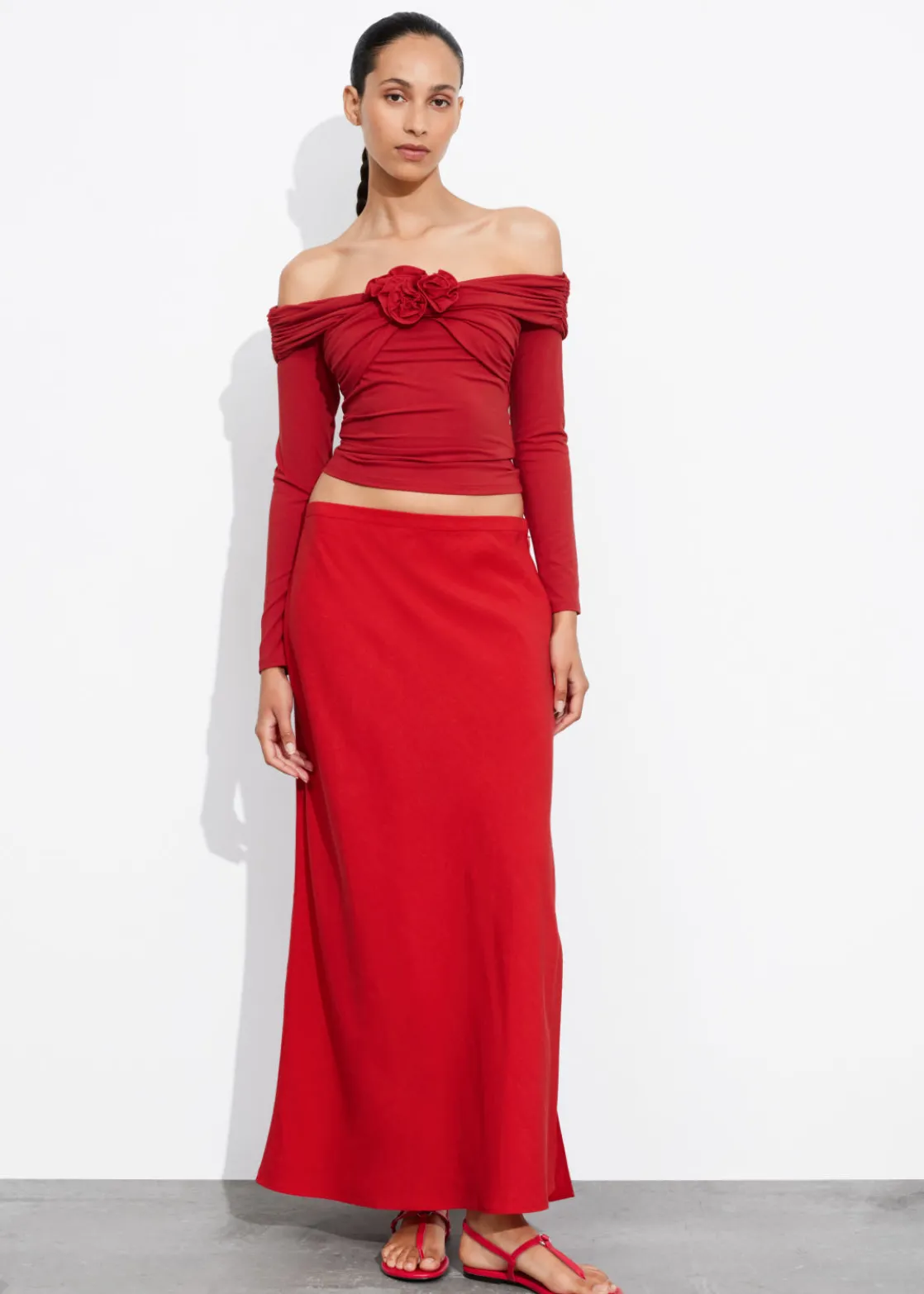 Slim long-sleeve off-shoulder top featuring a ruched neckline with a floral appliqué detail.