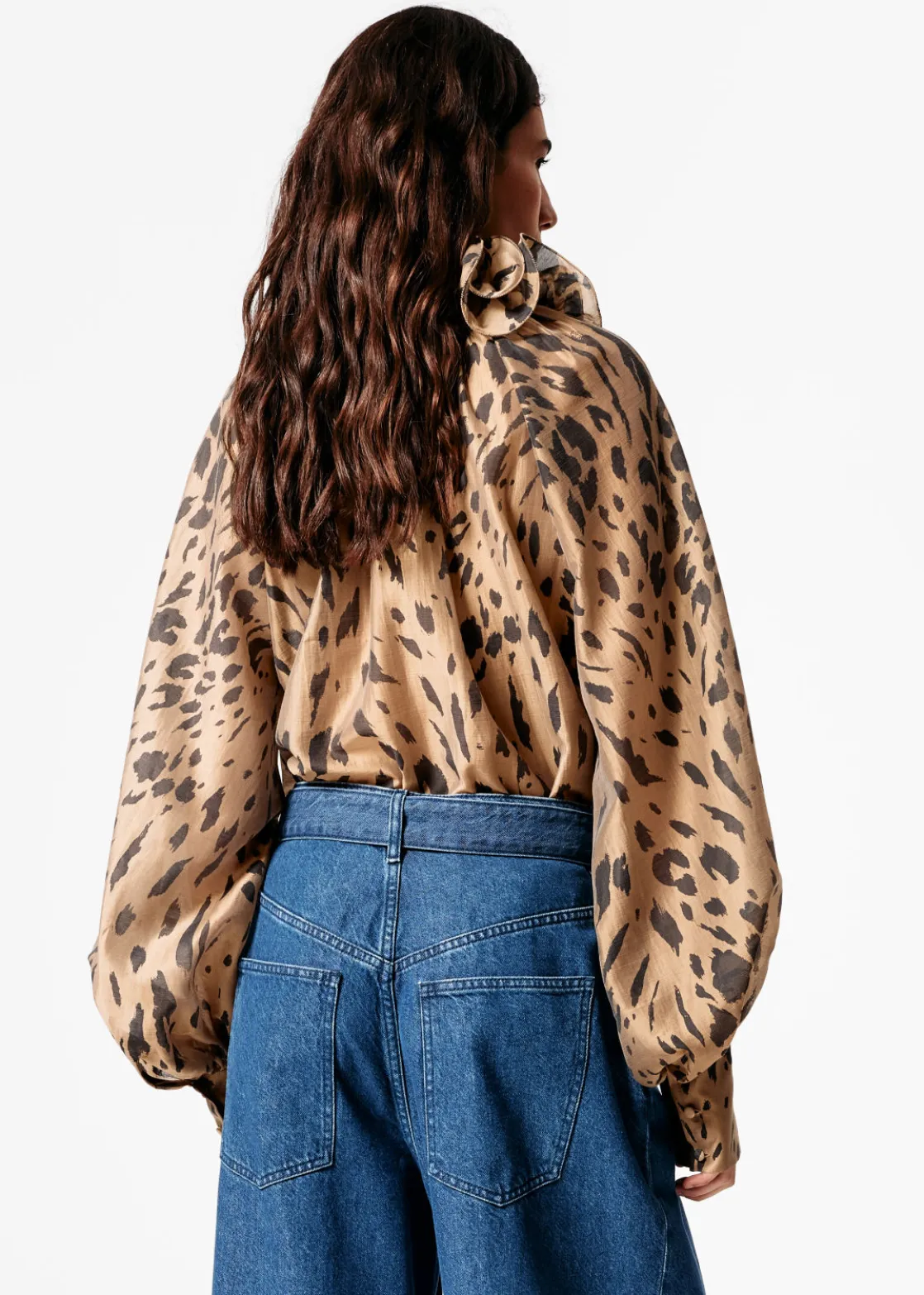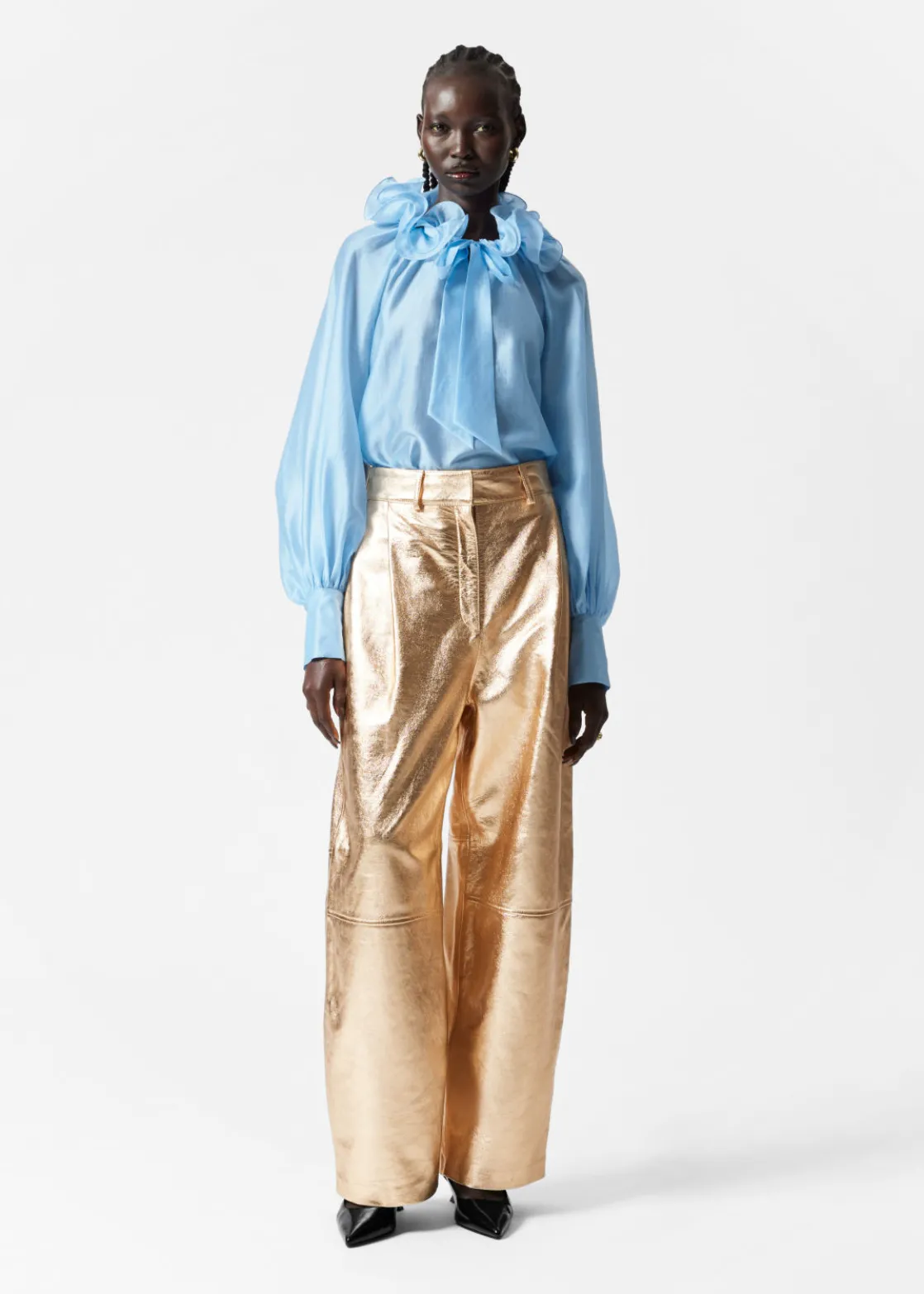 Blouse featuring voluminous sleeves, a ruffled collar and a neck-tie detail.
