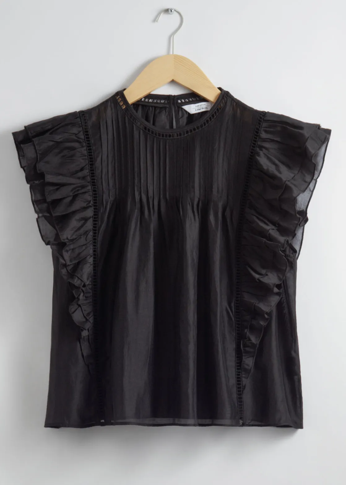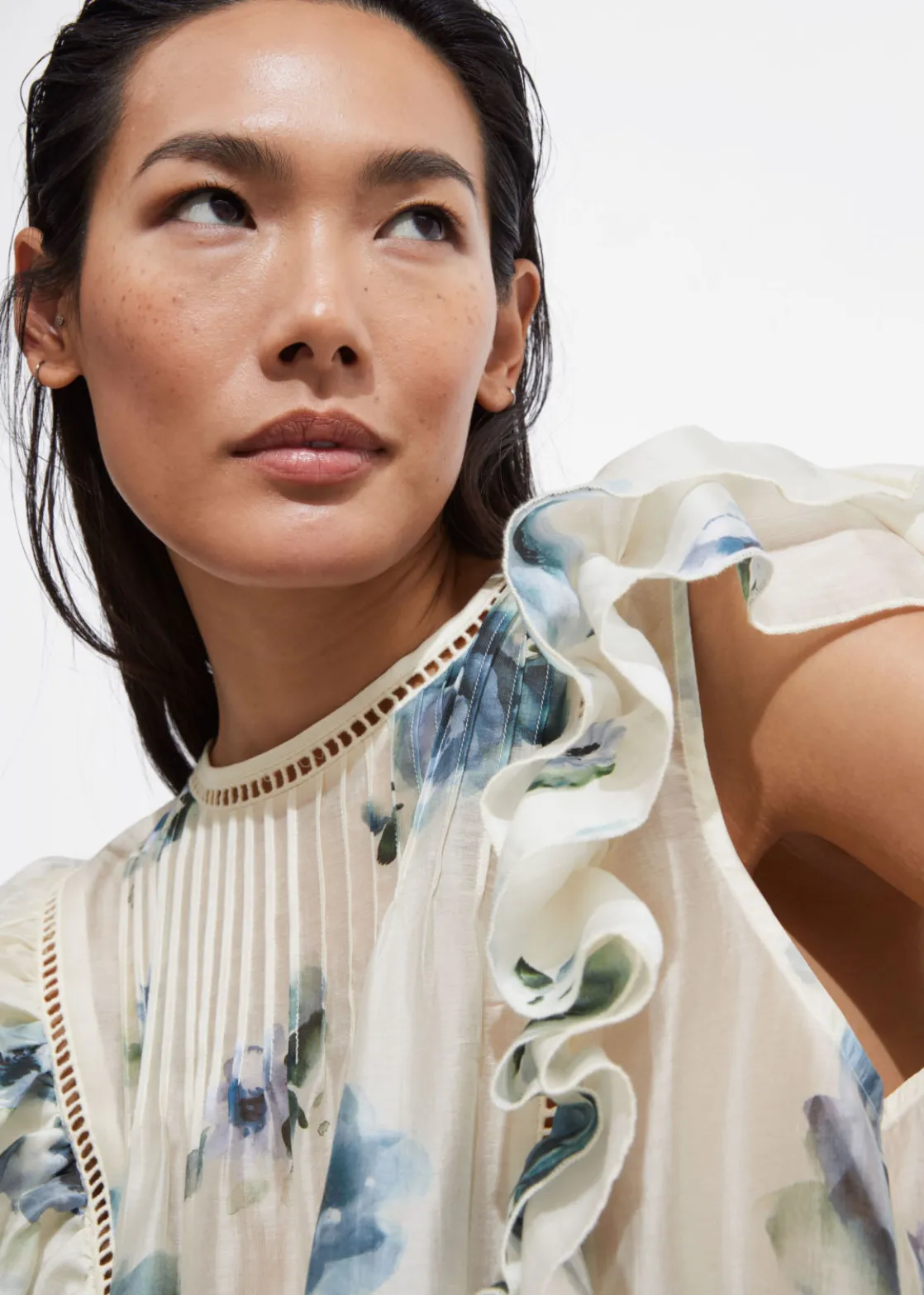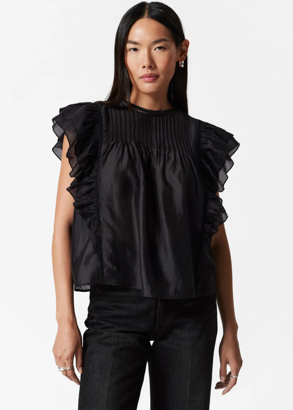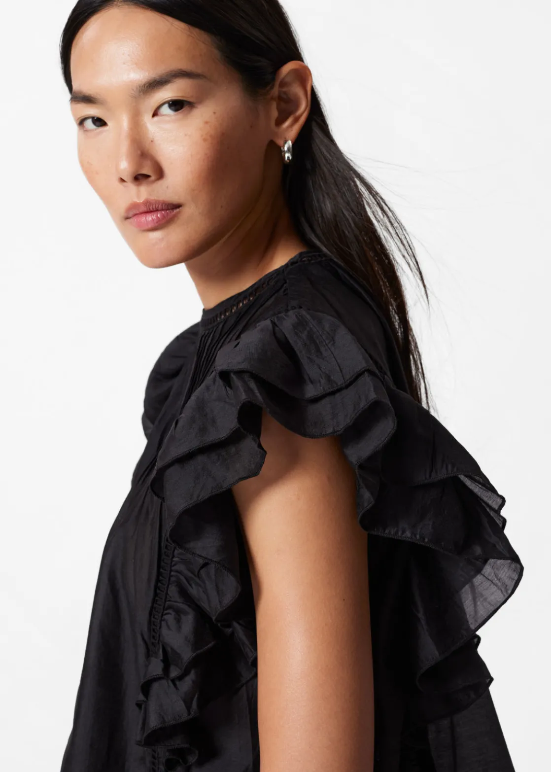 Top traced with layered ruffles along the shoulders and sides. Finished with a pleated chest.