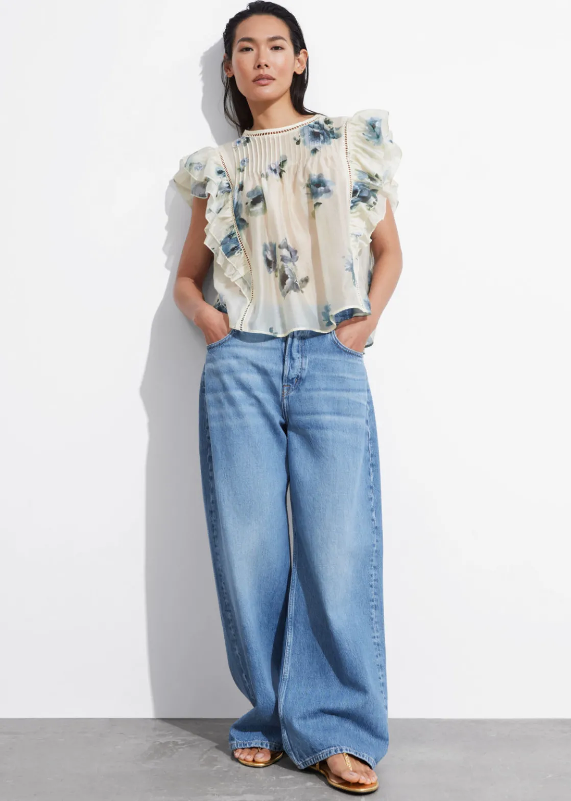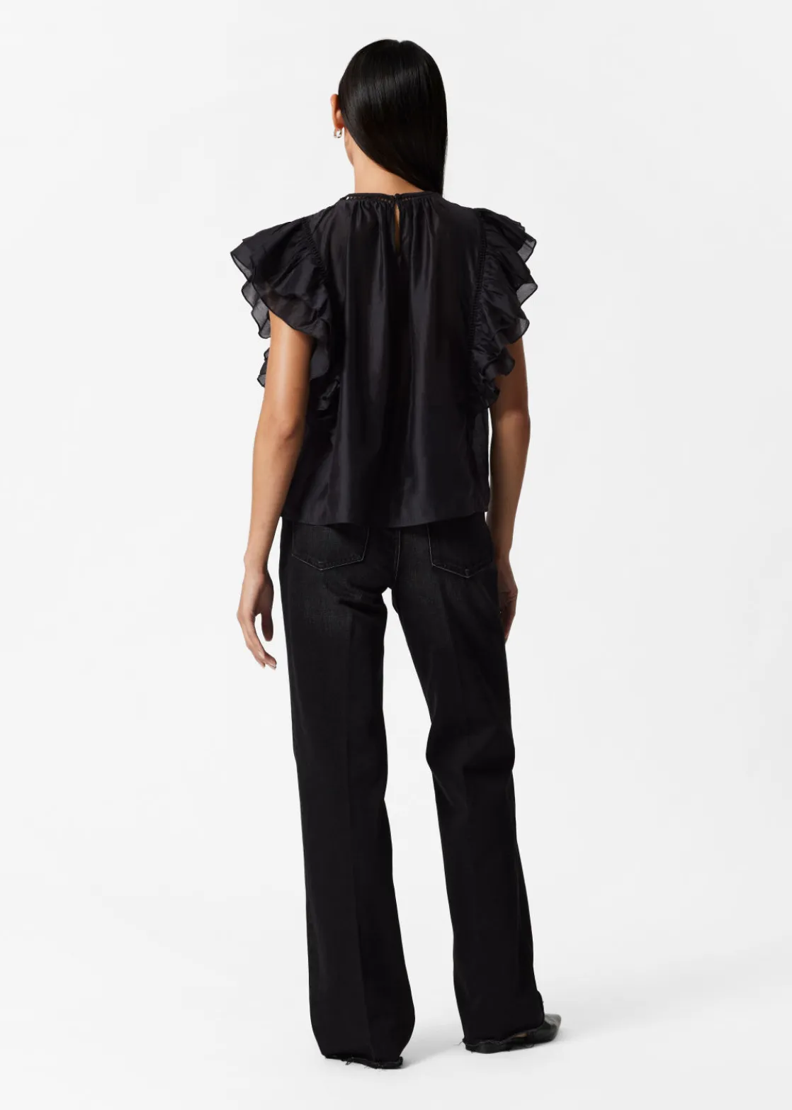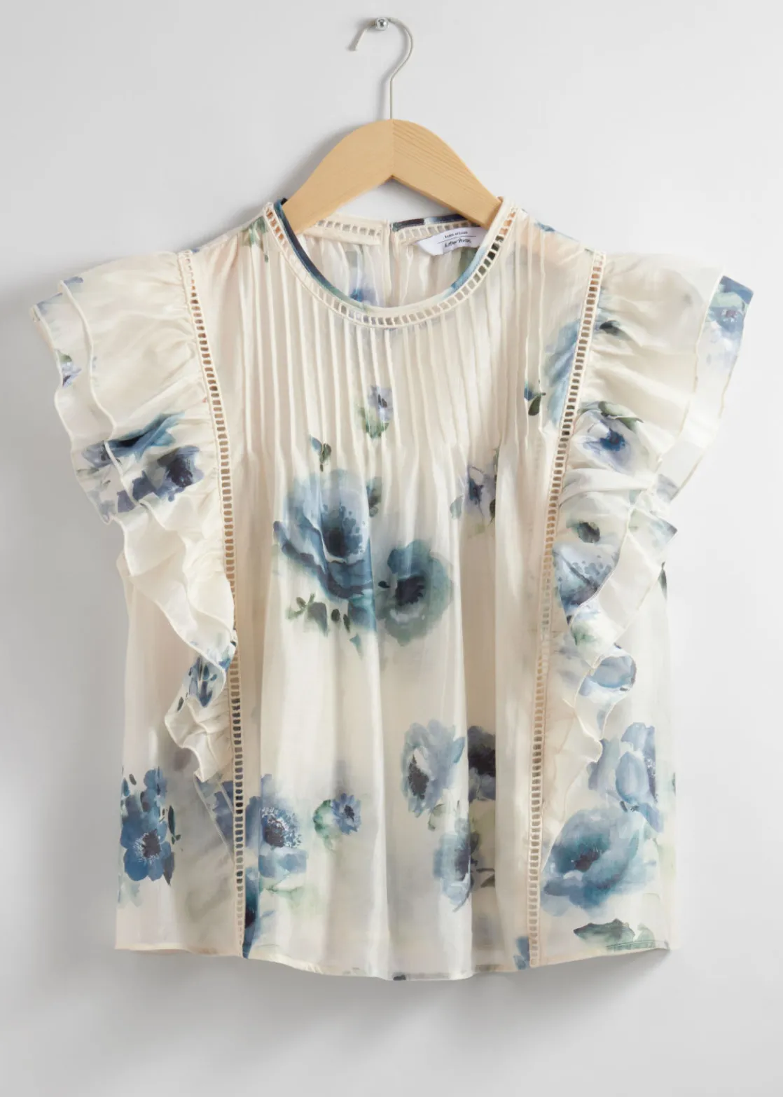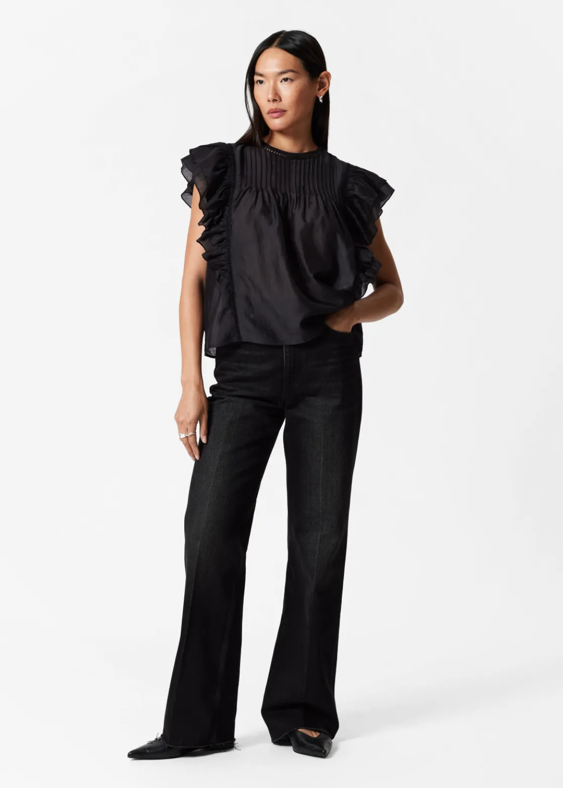 Top traced with layered ruffles along the shoulders and sides. Finished with a pleated chest.