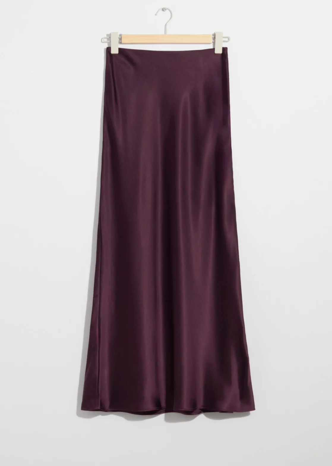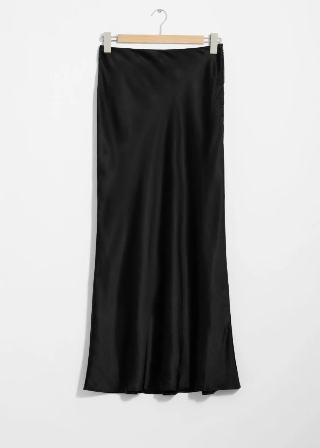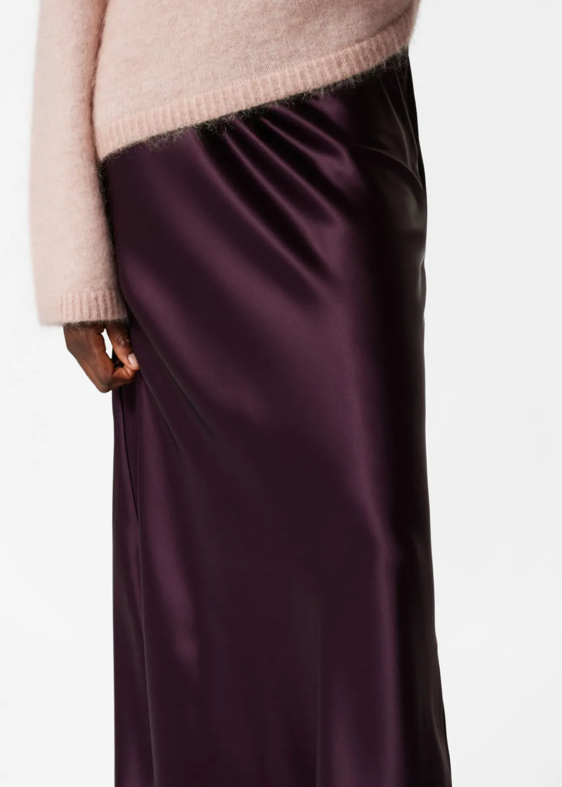 High-waist satin maxi skirt with a clean finish. Secured with a zipper at the side.