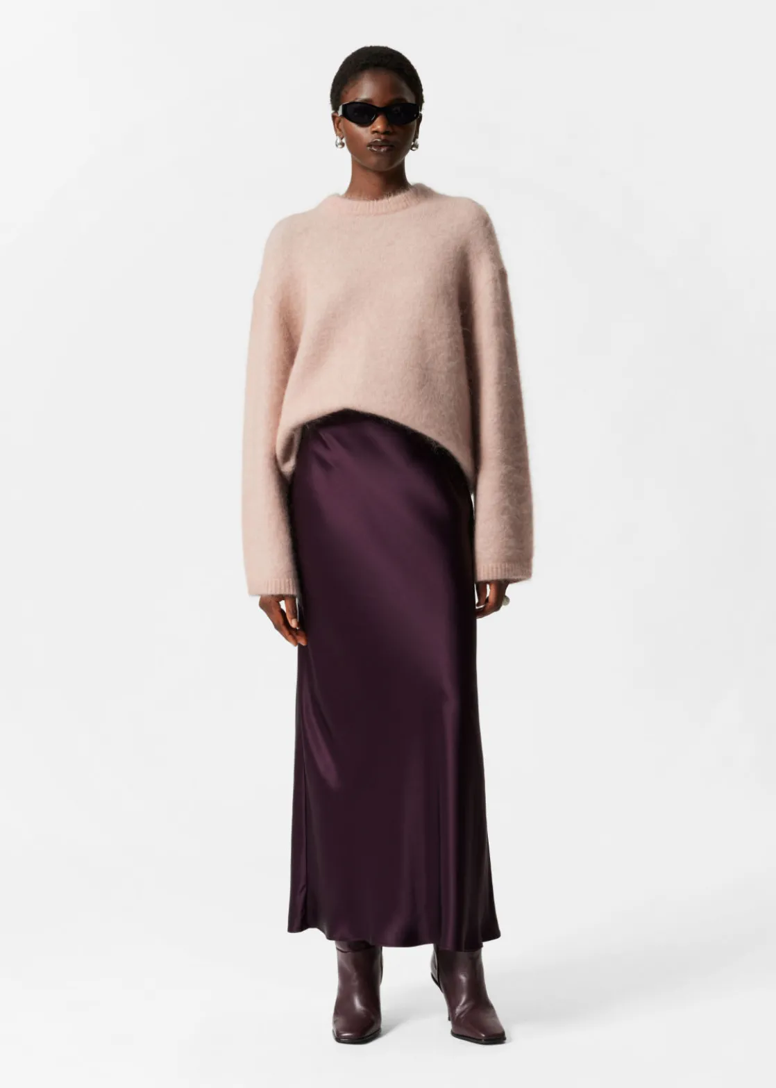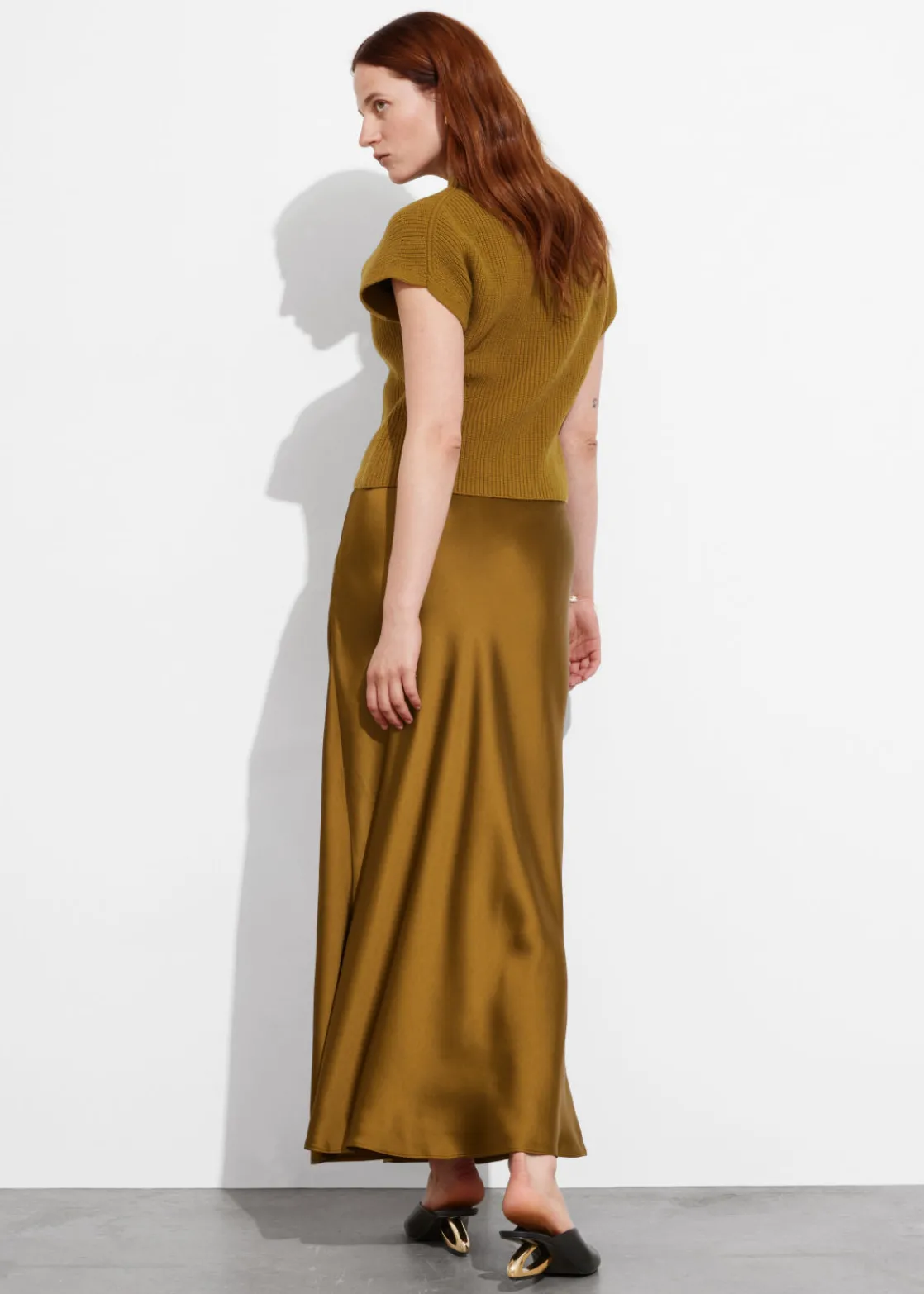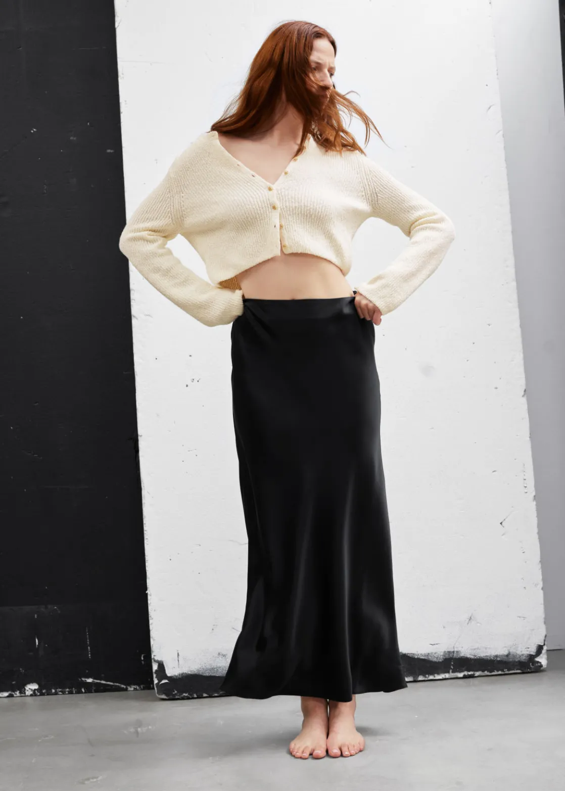 High-waist satin maxi skirt with a clean finish. Secured with a zipper at the side.