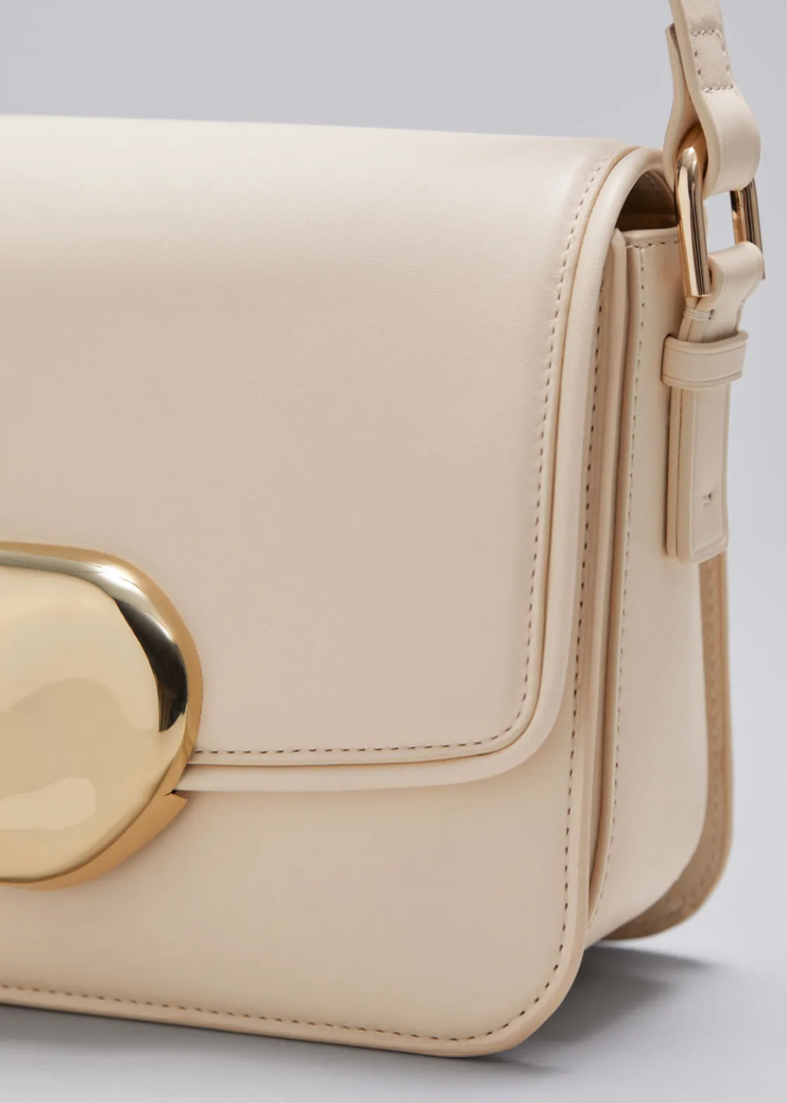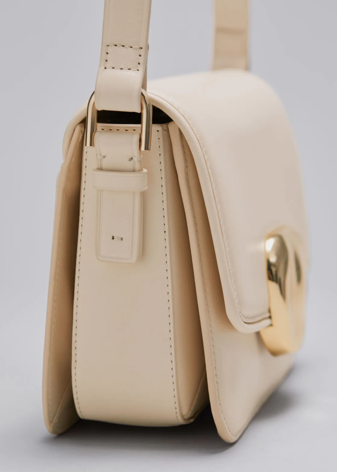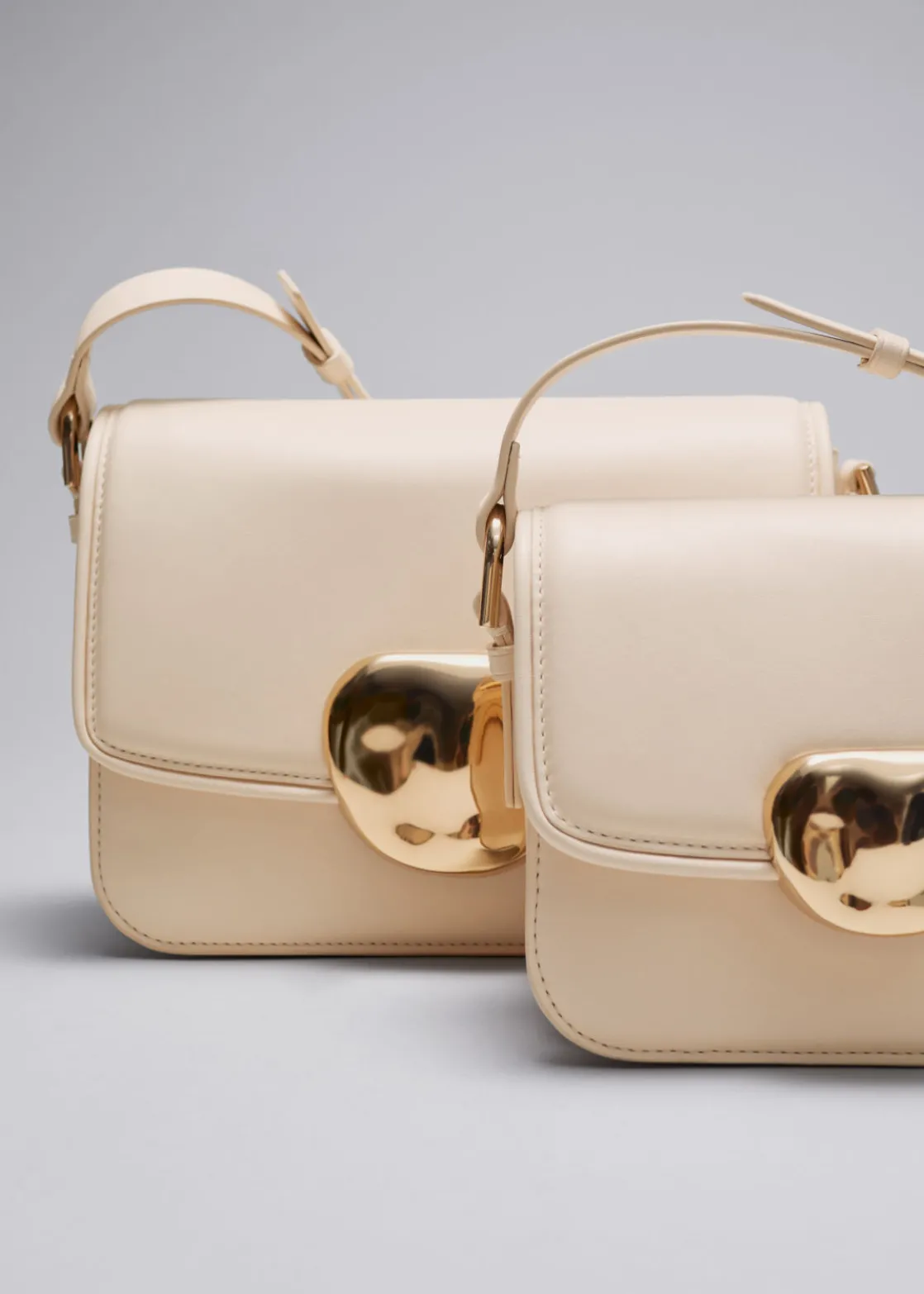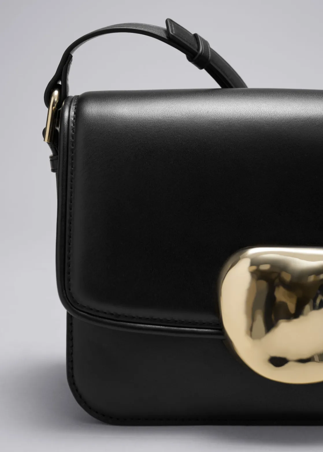 Timeless crossbody bag crafted from smooth structured leather. Featuring three inner compartments, one of which is zippered. Detailed with a large sculptural gold-toned buckle closure and adjustable shoulder strap.
