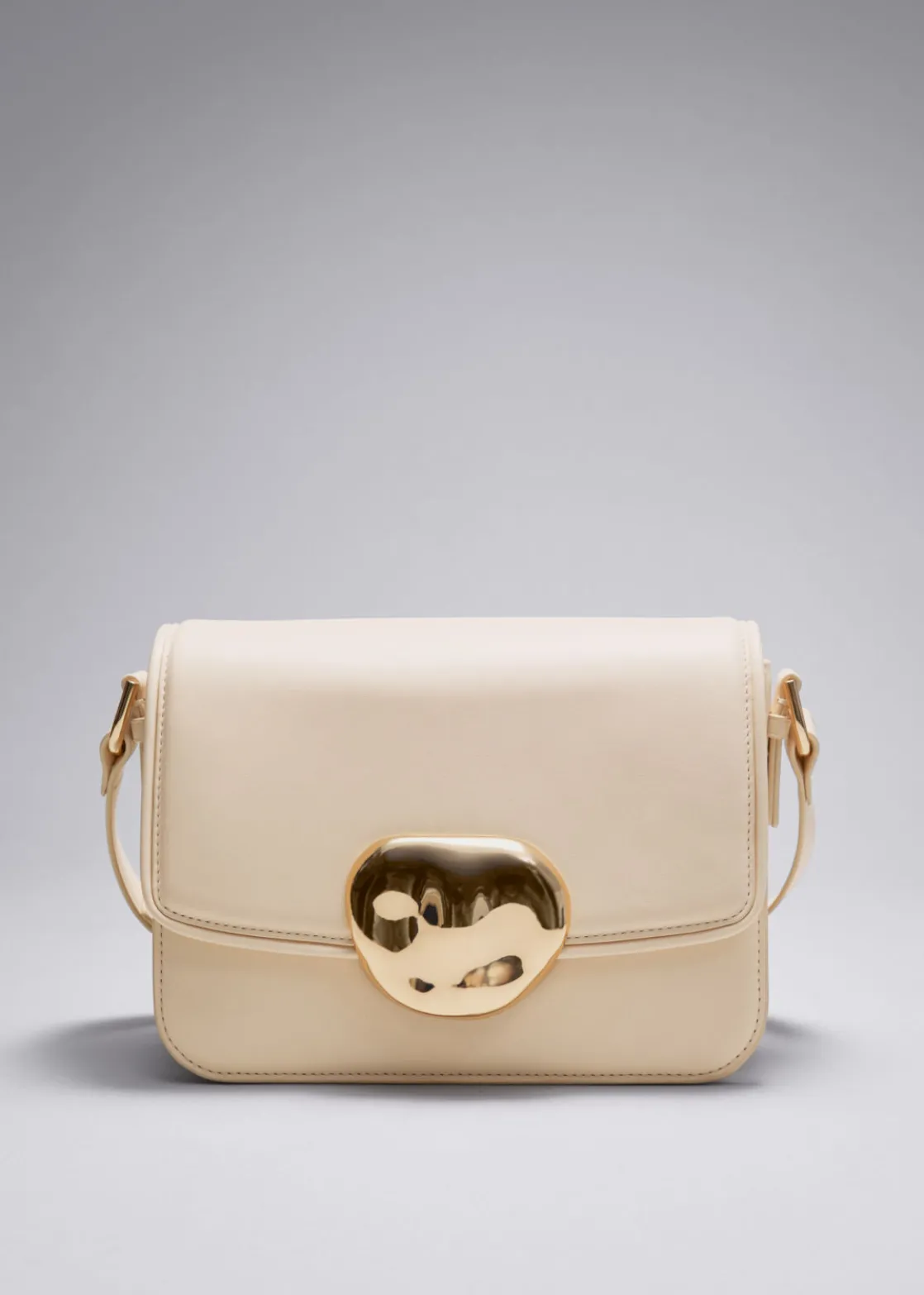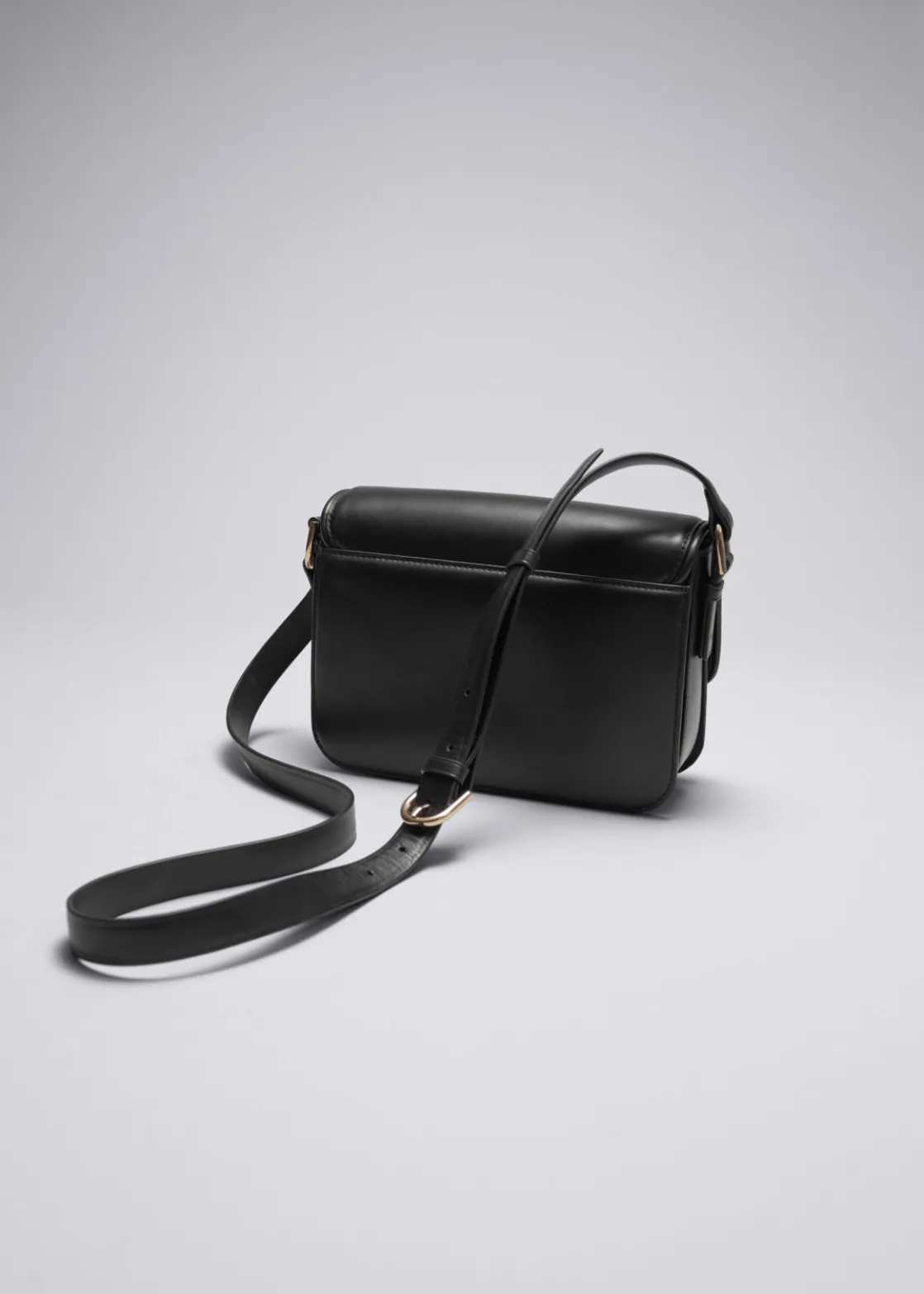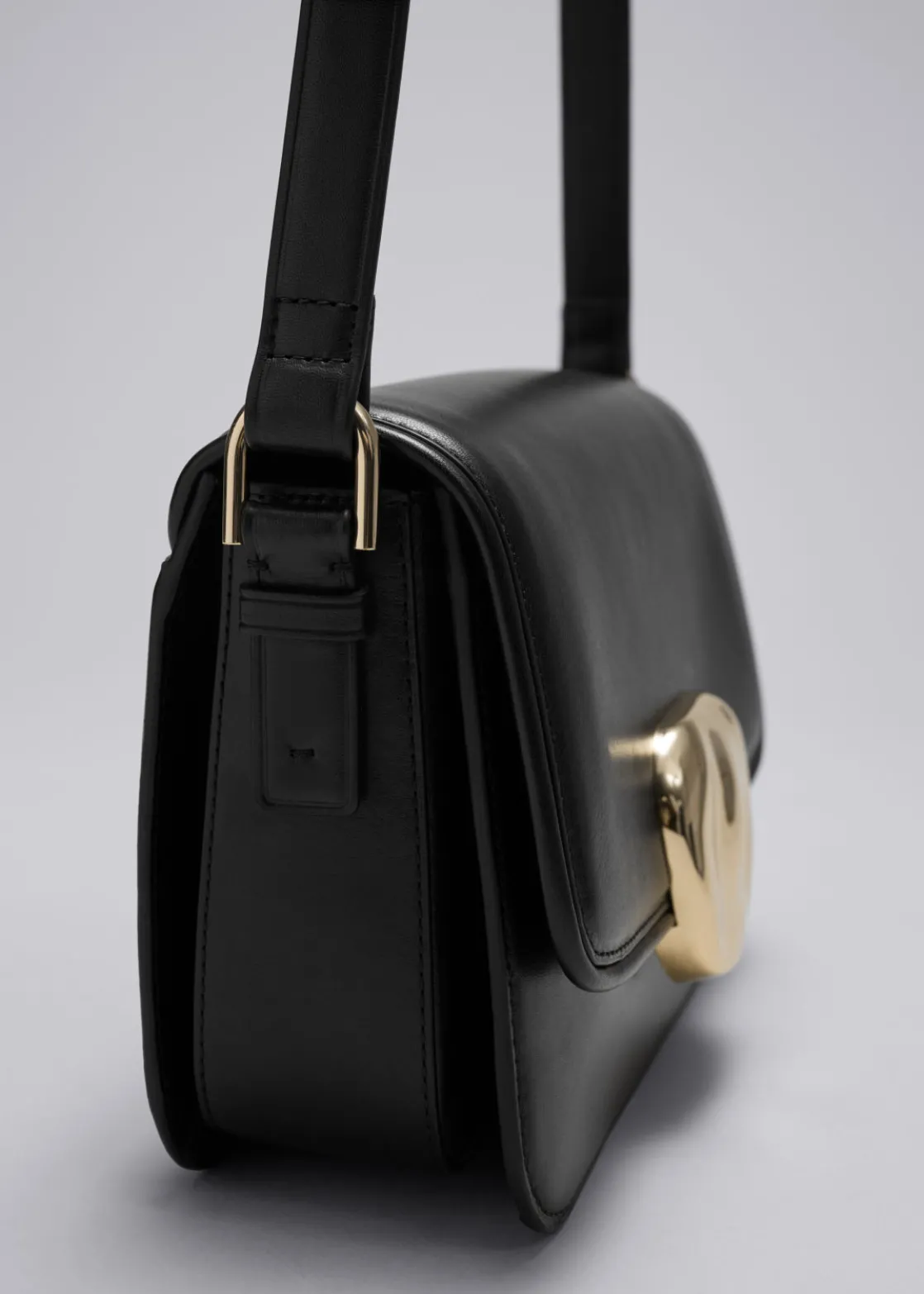 Timeless crossbody bag crafted from smooth structured leather. Featuring three inner compartments, one of which is zippered. Detailed with a large sculptural gold-toned buckle closure and adjustable shoulder strap.