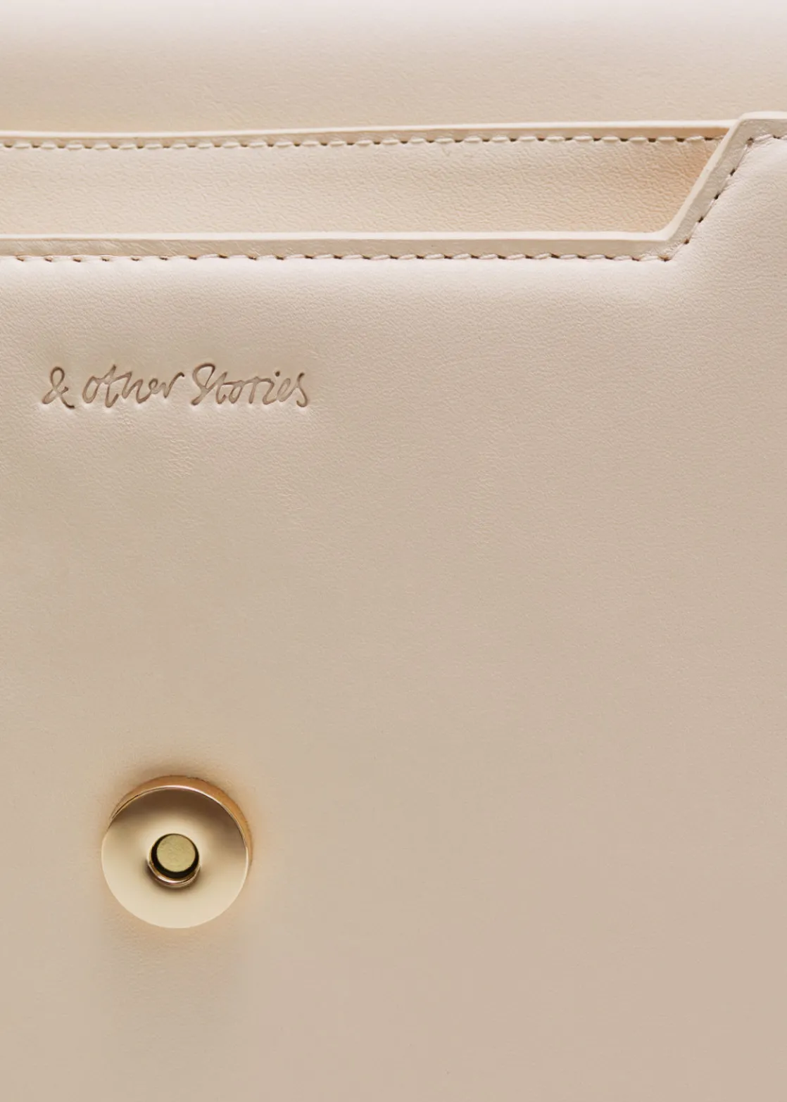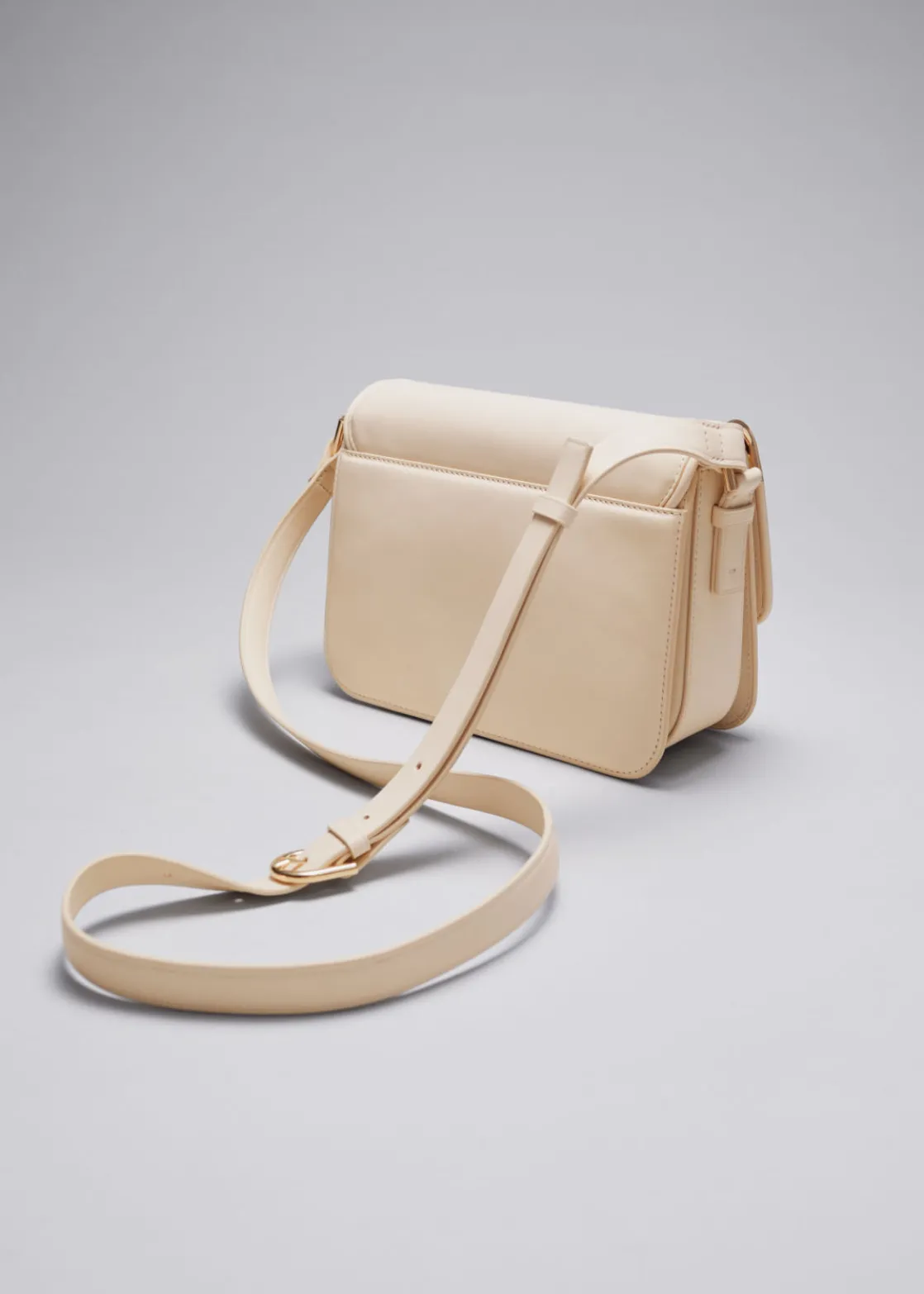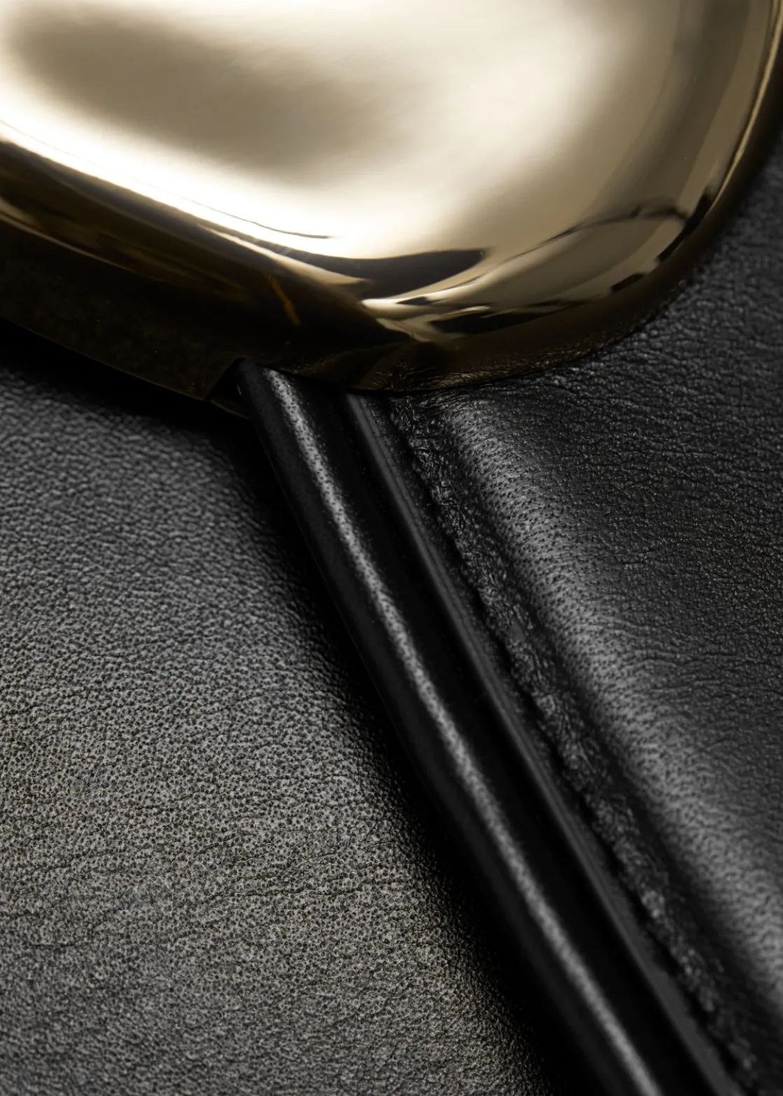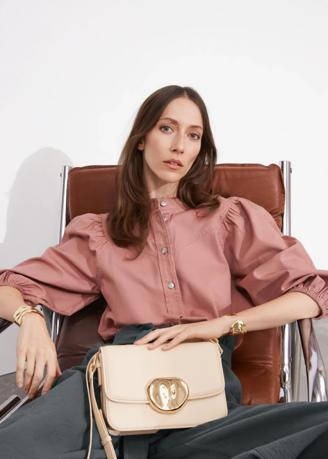 Timeless crossbody bag crafted from smooth structured leather. Featuring three inner compartments, one of which is zippered. Detailed with a large sculptural gold-toned buckle closure and adjustable shoulder strap.