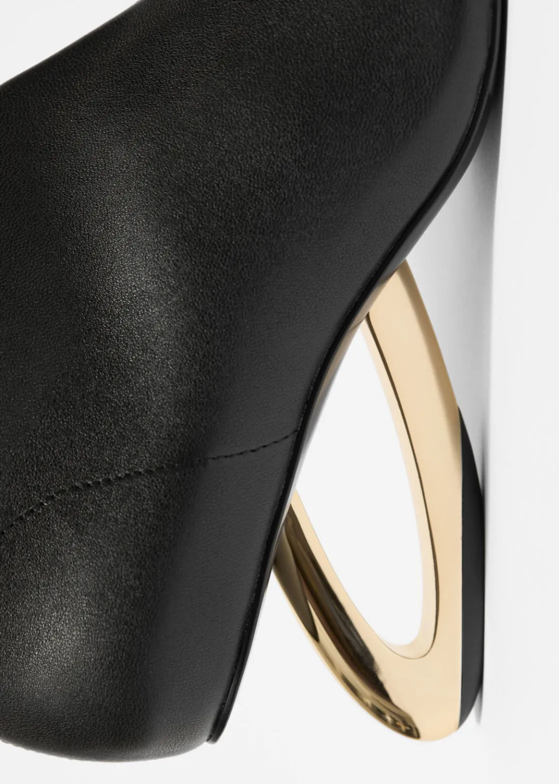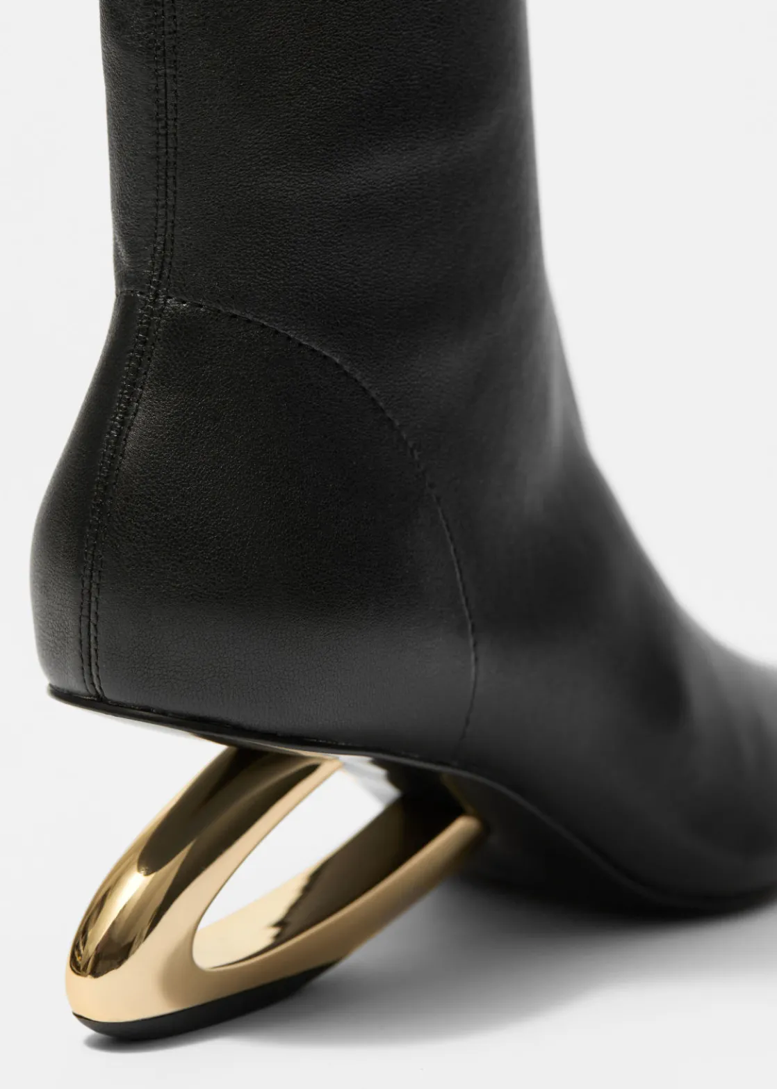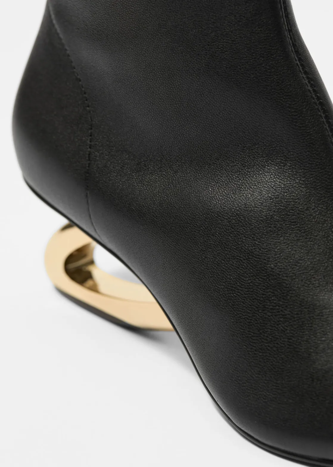 These ankle boots will elevate any outfit you pair them with. They’re crafted from supple stretch nappa leather and embellished with sculptural gold-tone heels.