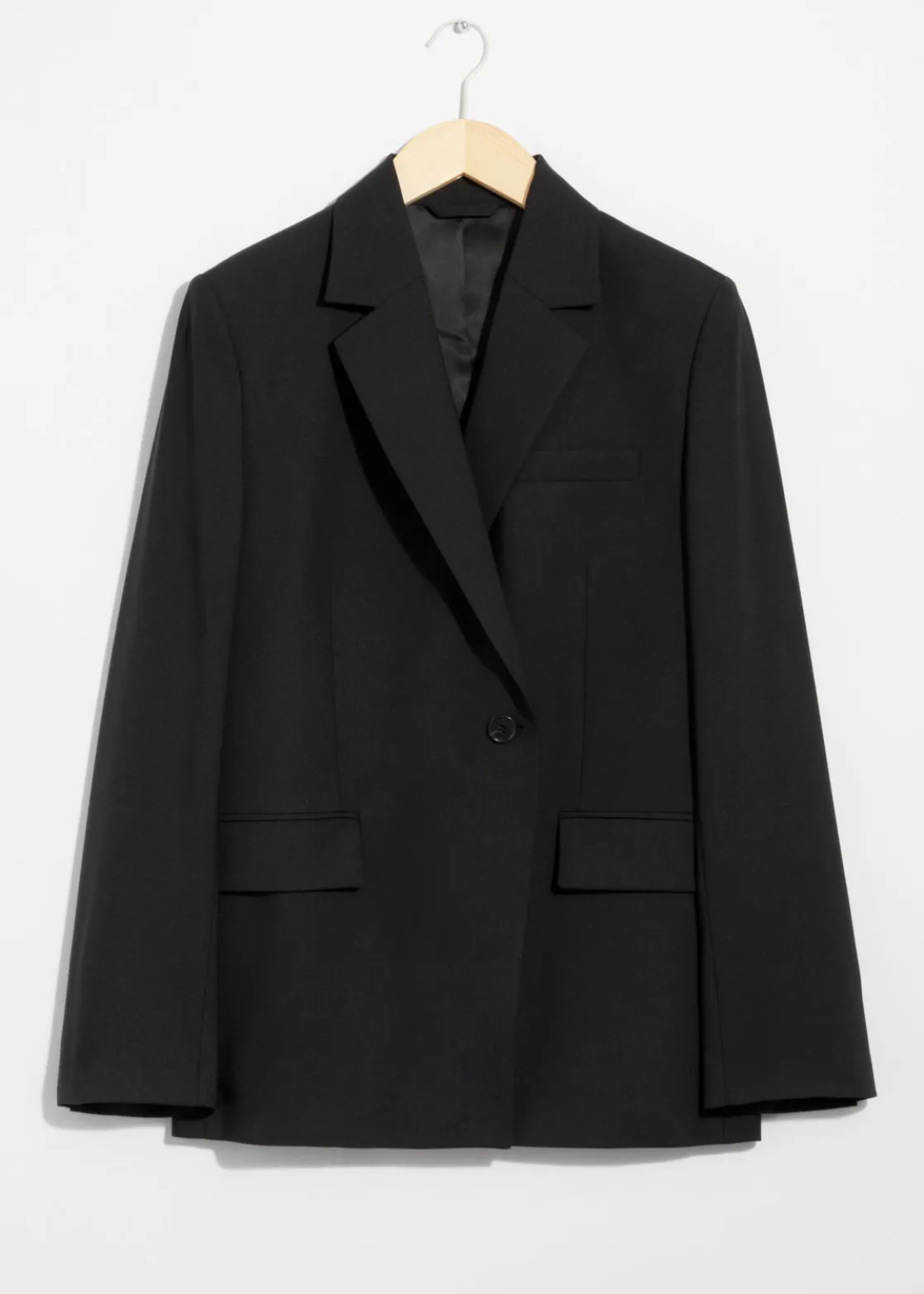 Single-breasted wool blazer featuring padded shoulders and duo welt pockets.