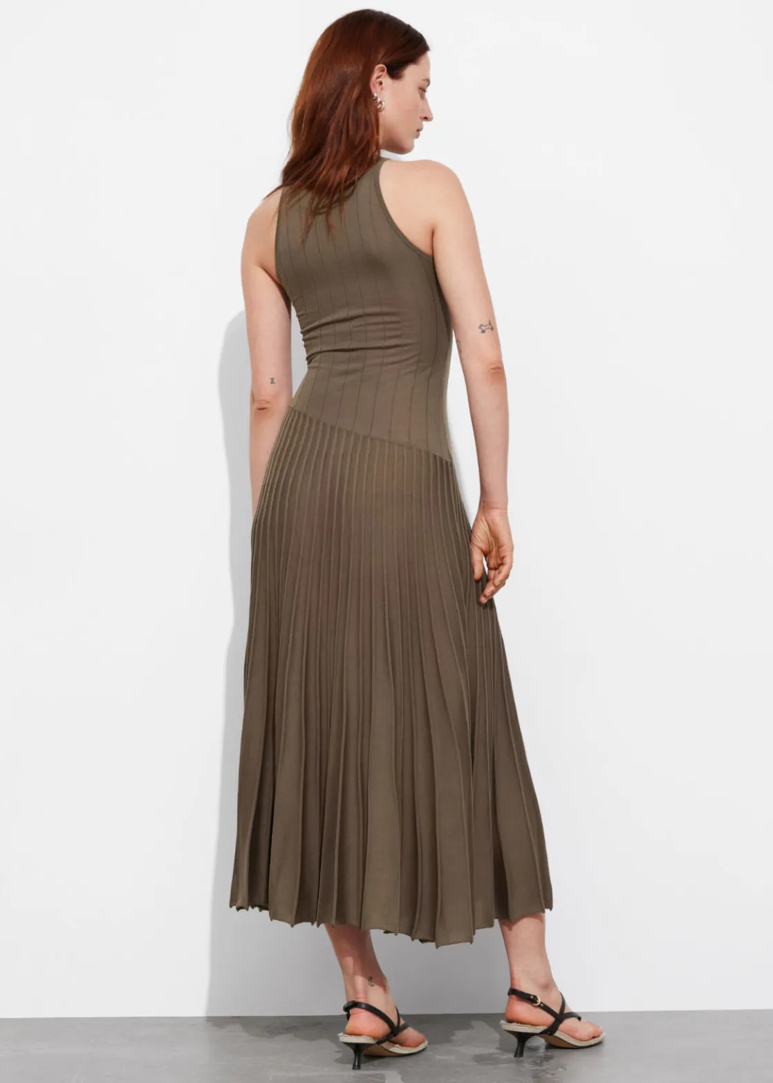 Sleeveless knitted maxi dress with a sheer, pleated finish.