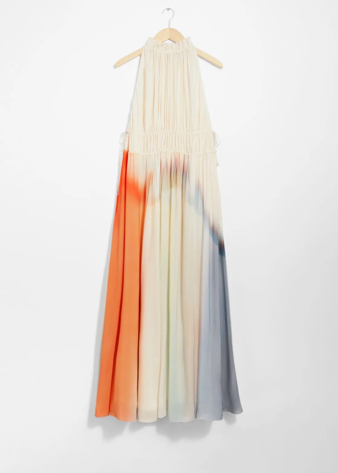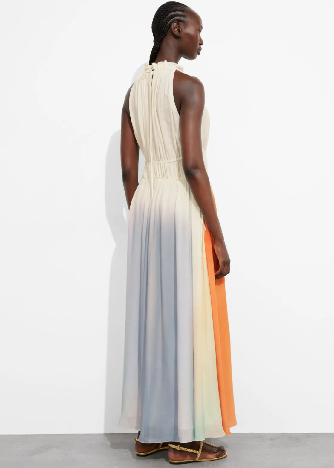 Sleeveless maxi dress featuring a gently gathered finish. Designed with a frilled neckline and drawstring detailing at the waist.