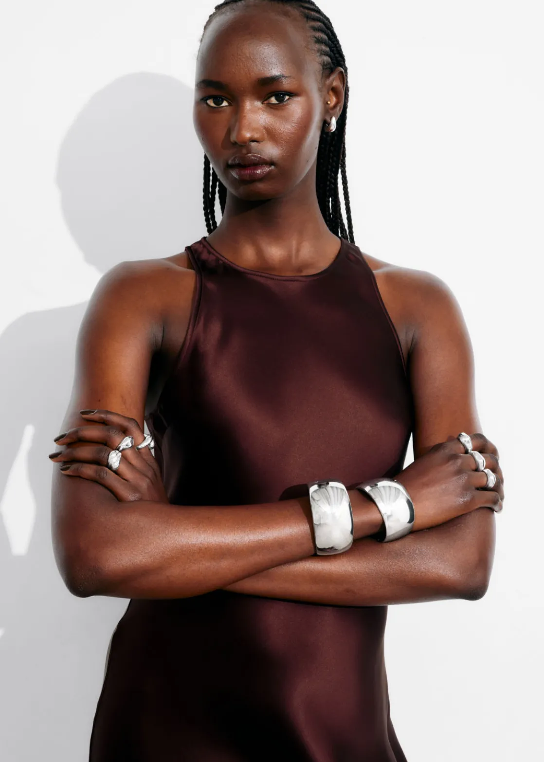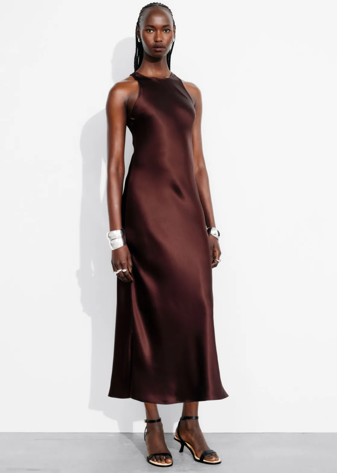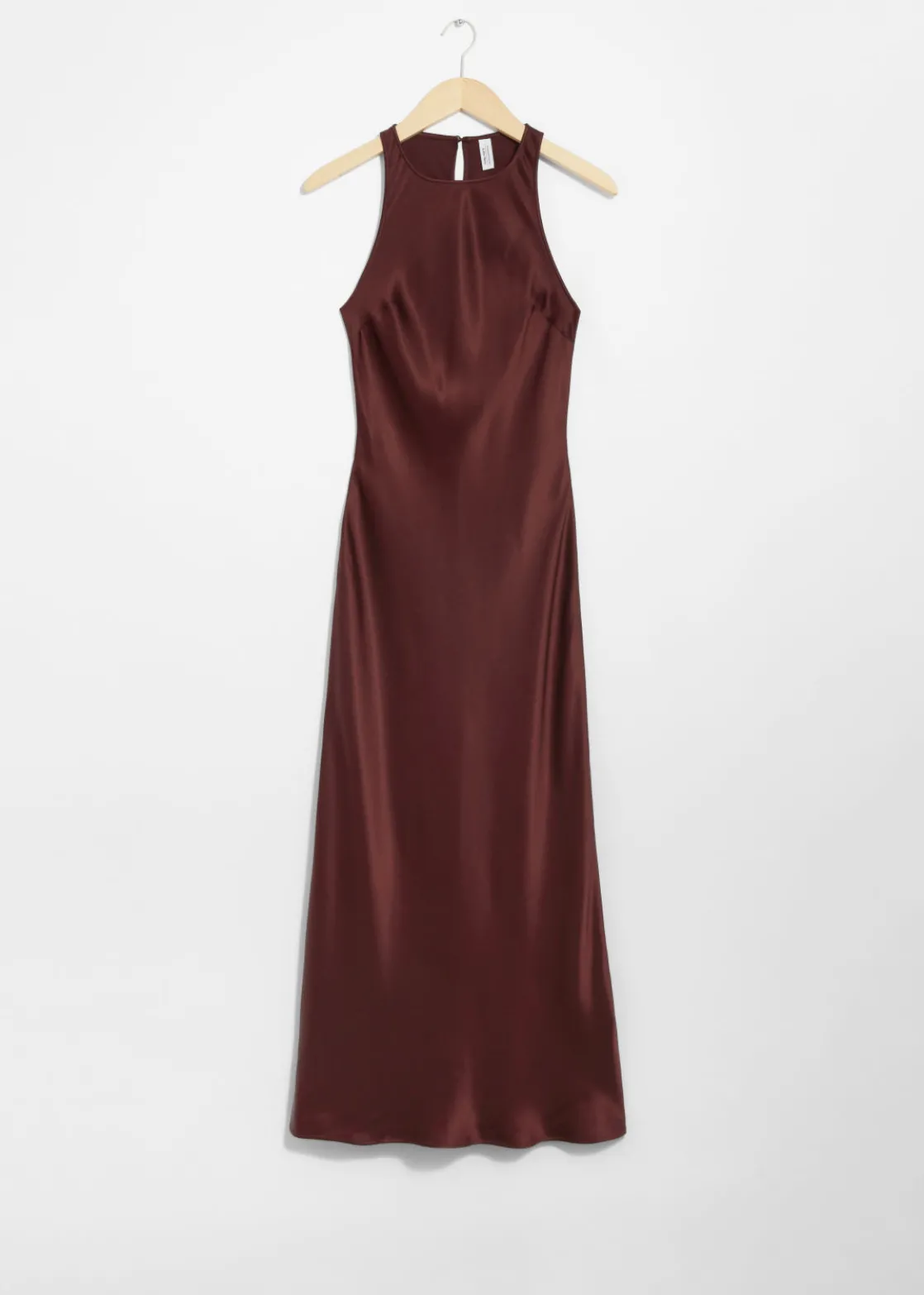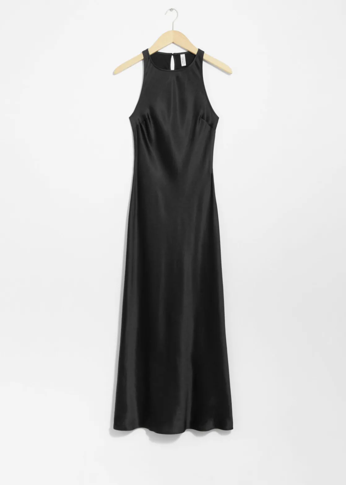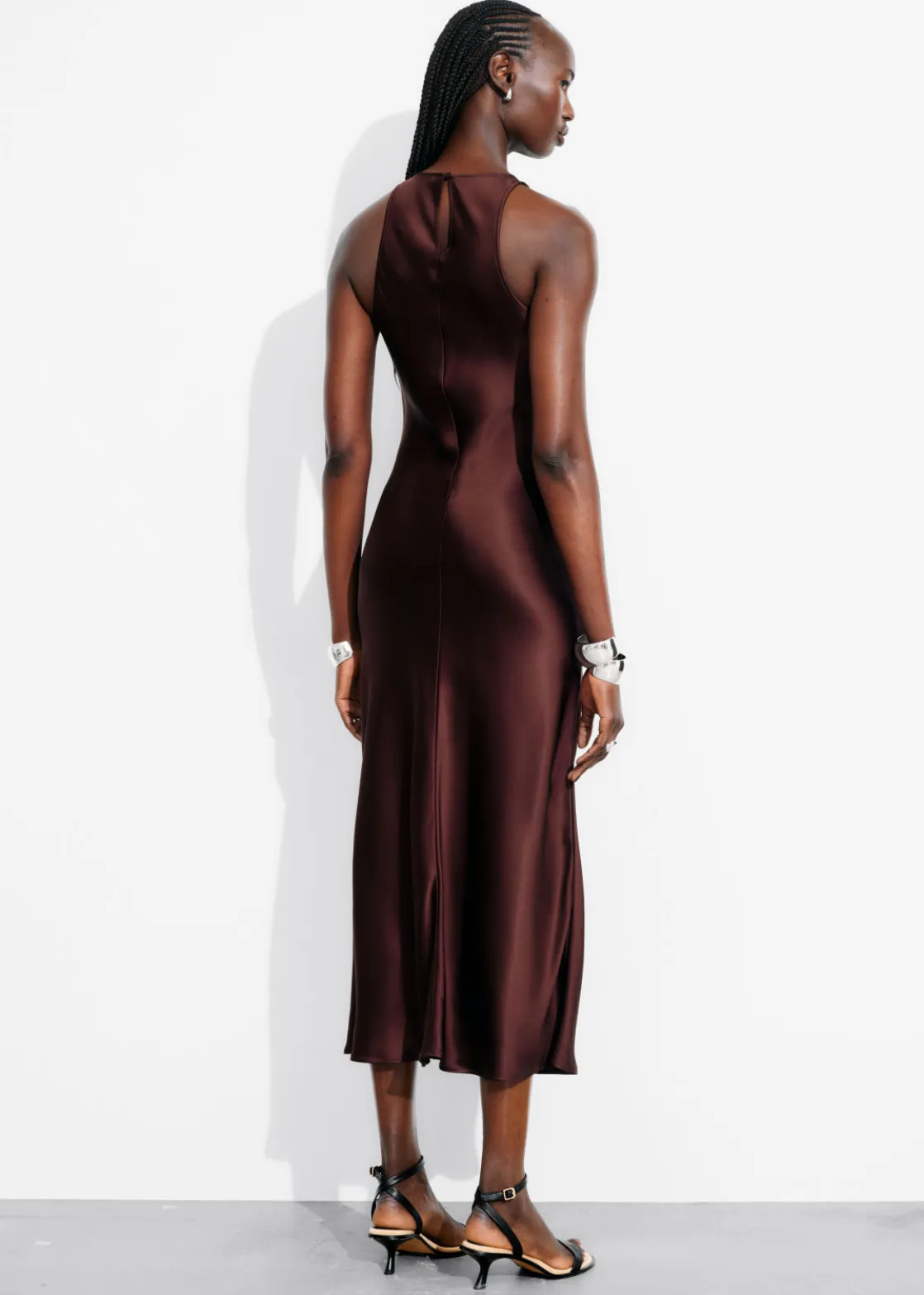 Sleeveless satin dress featuring a glossy, satin finish and a round neckline. Finished with a keyhole closure at the neck.