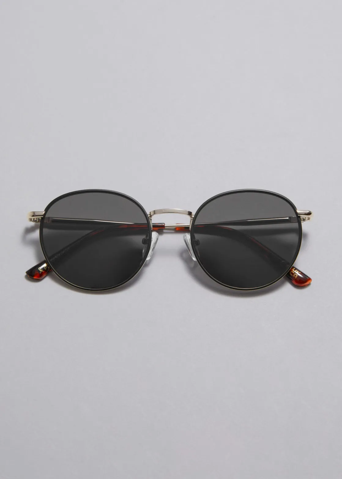 These sunglasses have narrow, oval frames. Made from polished metal with a lightweight feel, they have slim arms complete with acetate tips.