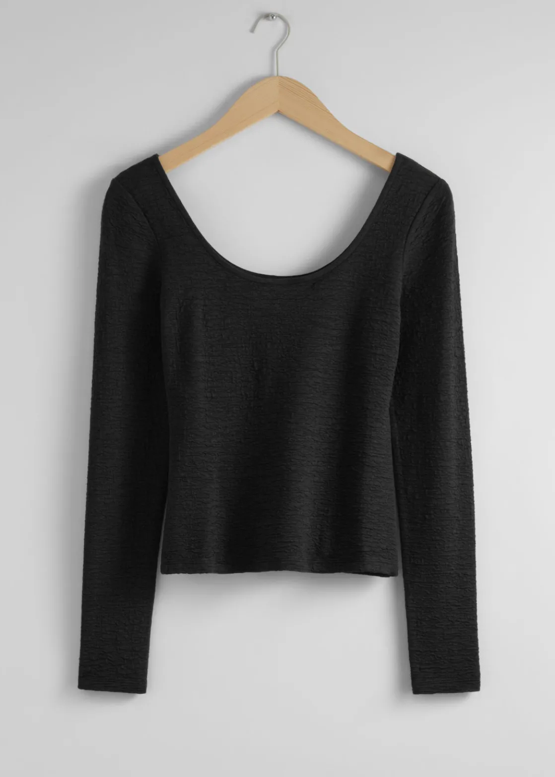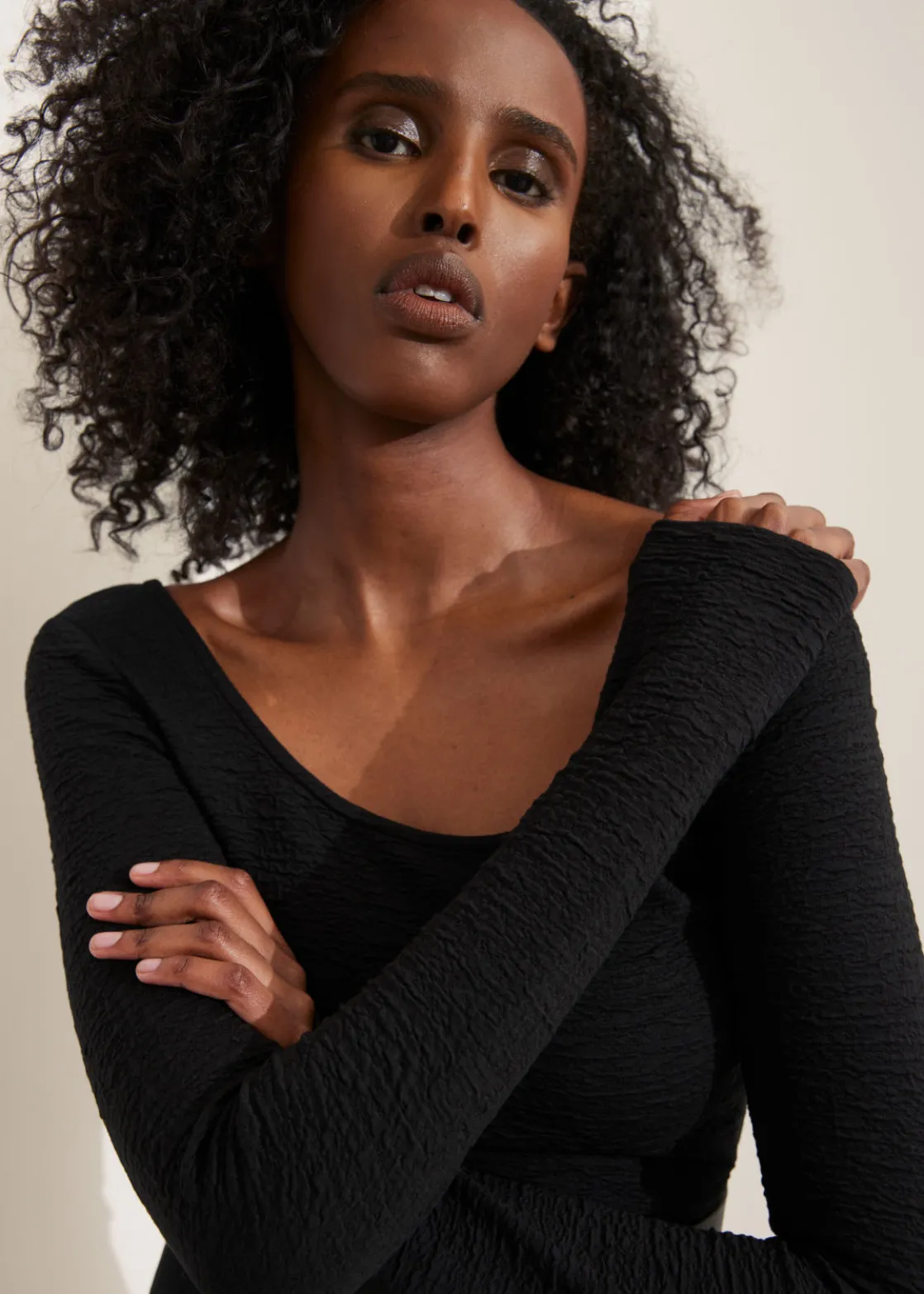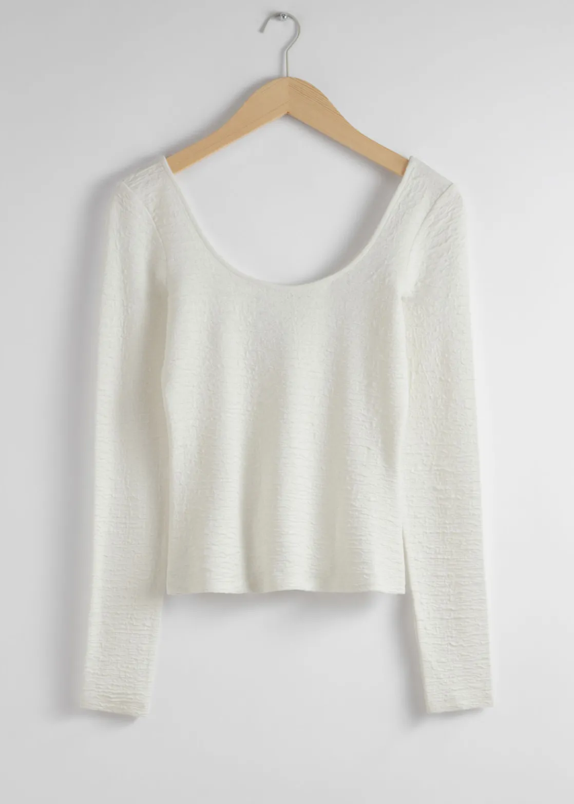 Long-sleeve top featuring a close-fitting silhouette and a gently textured finish. Finished with a scooped neckline.