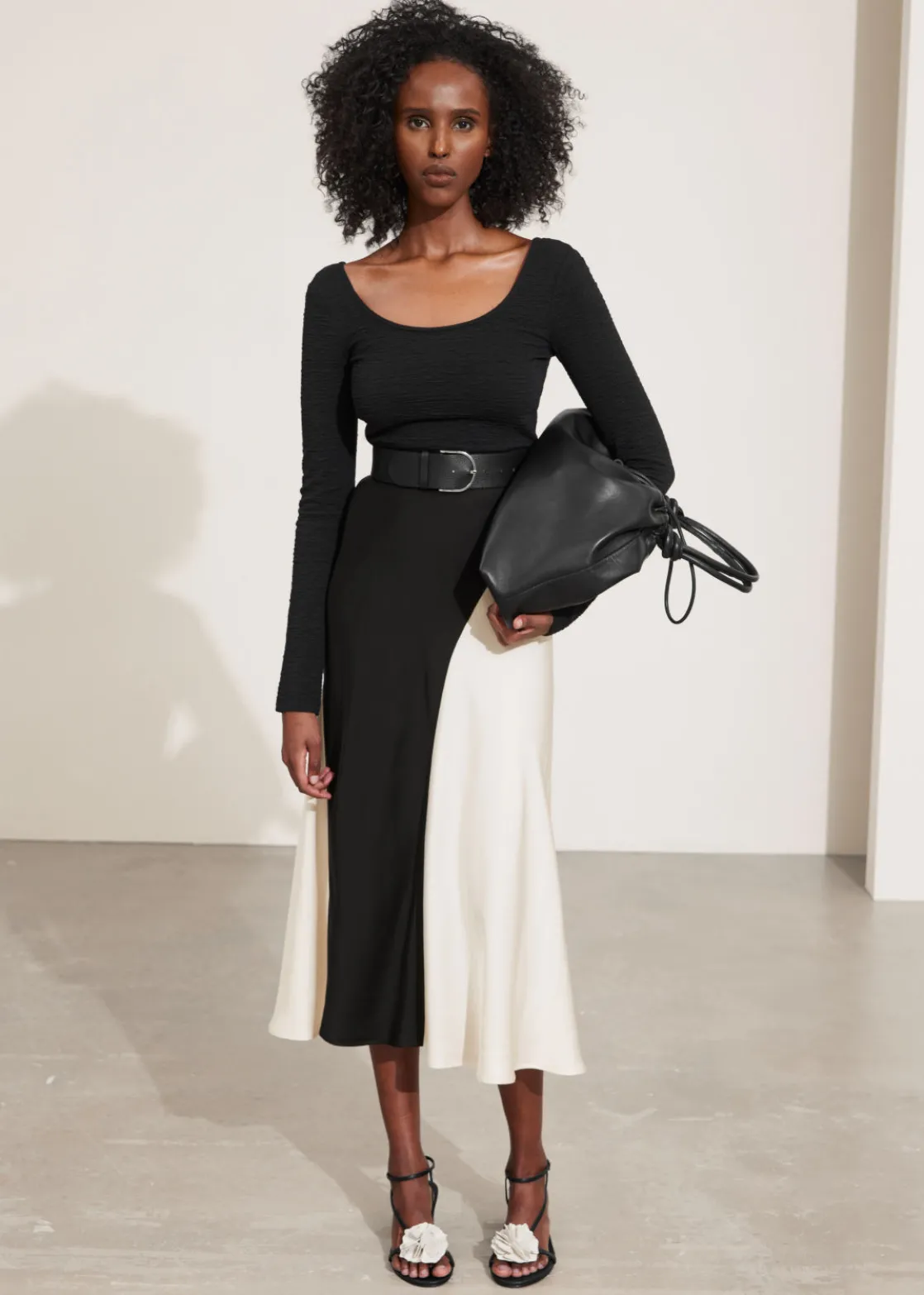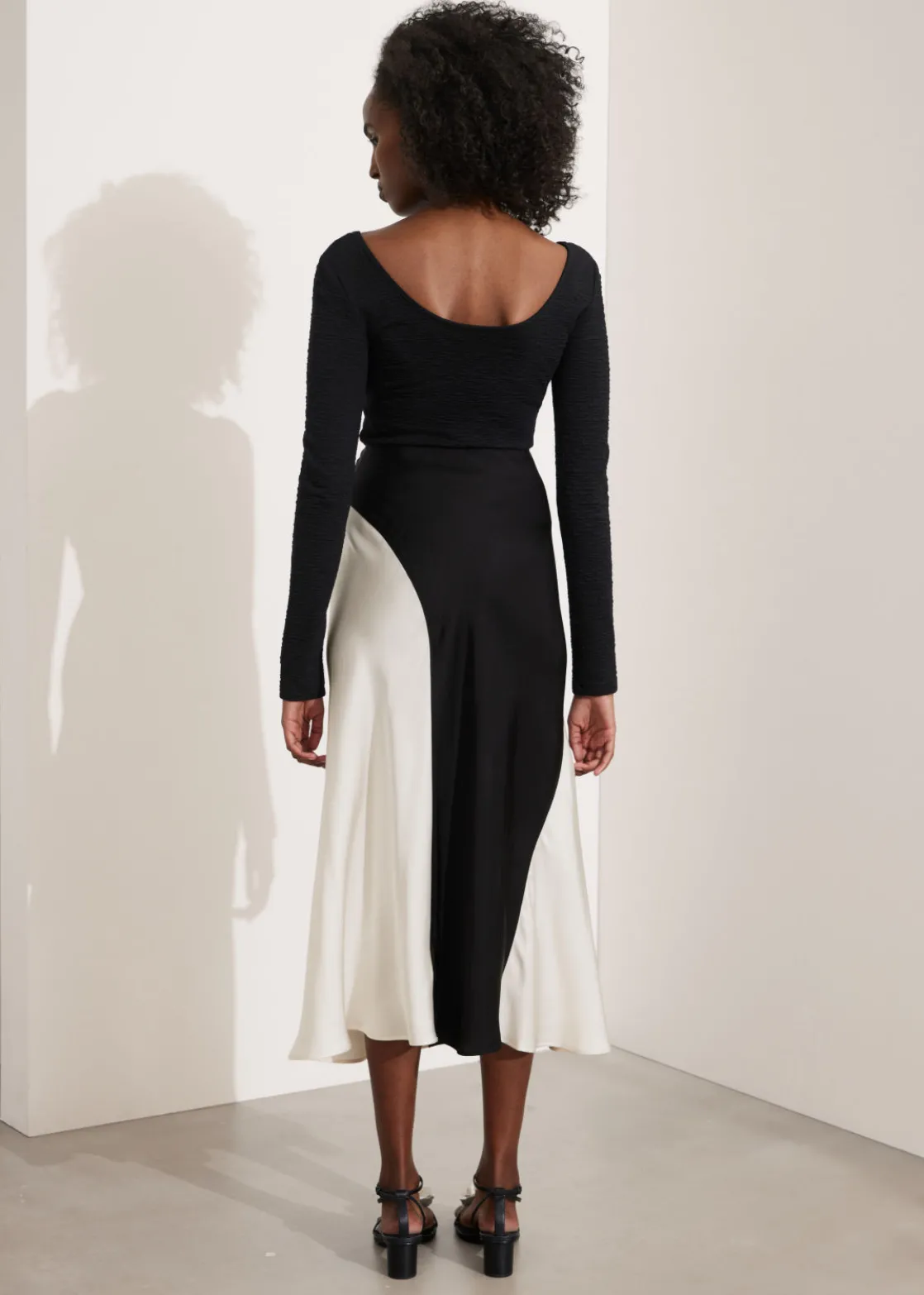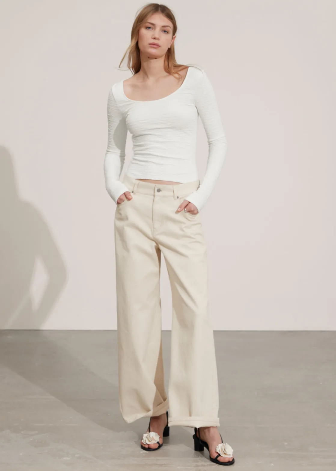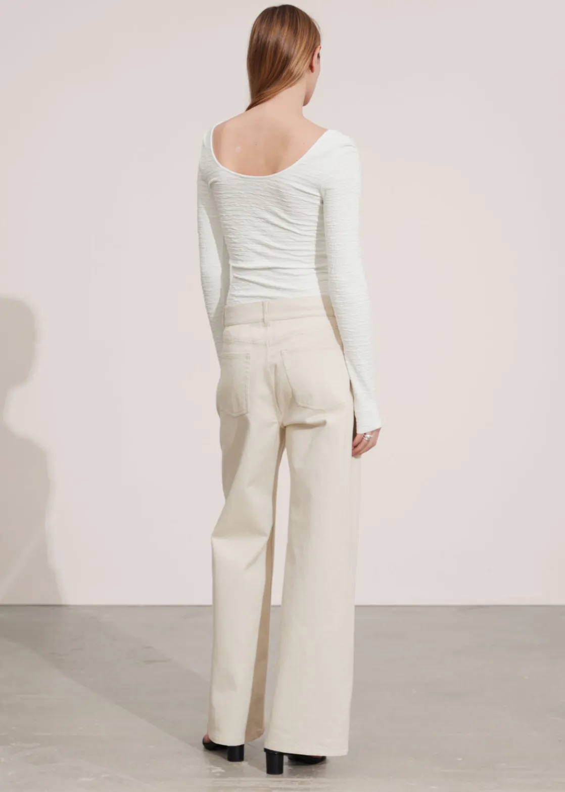 Long-sleeve top featuring a close-fitting silhouette and a gently textured finish. Finished with a scooped neckline.