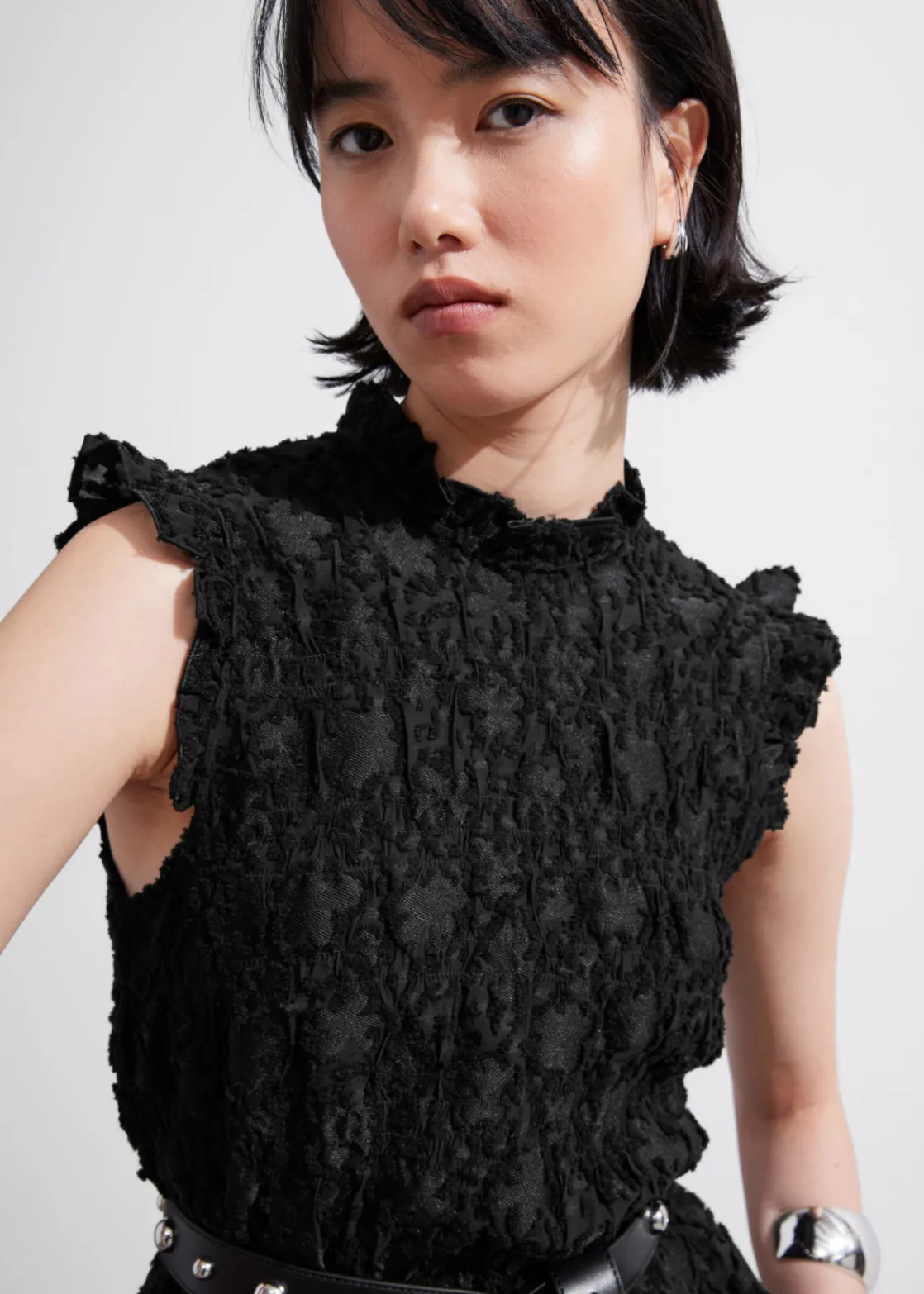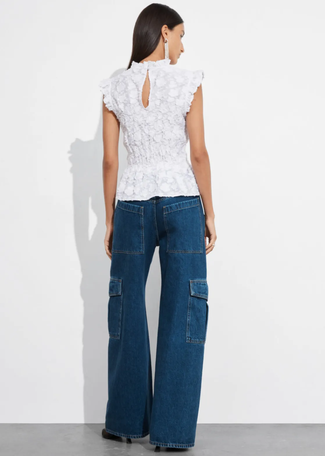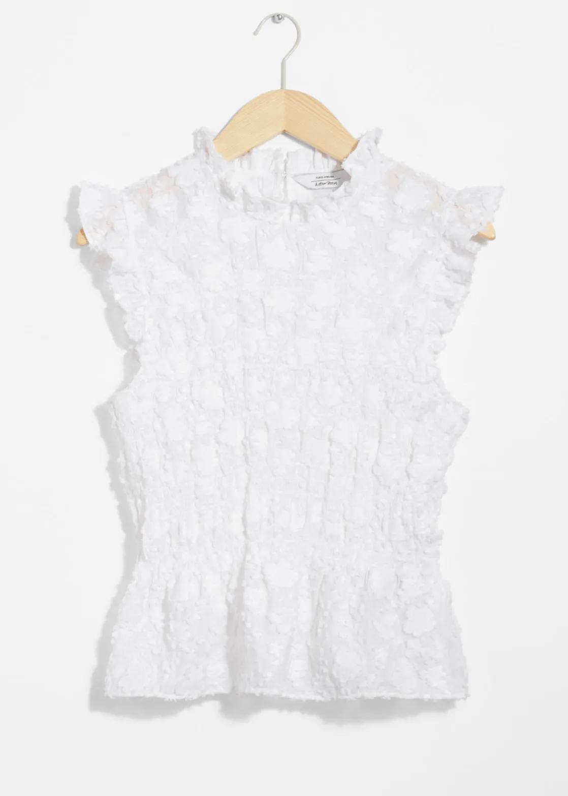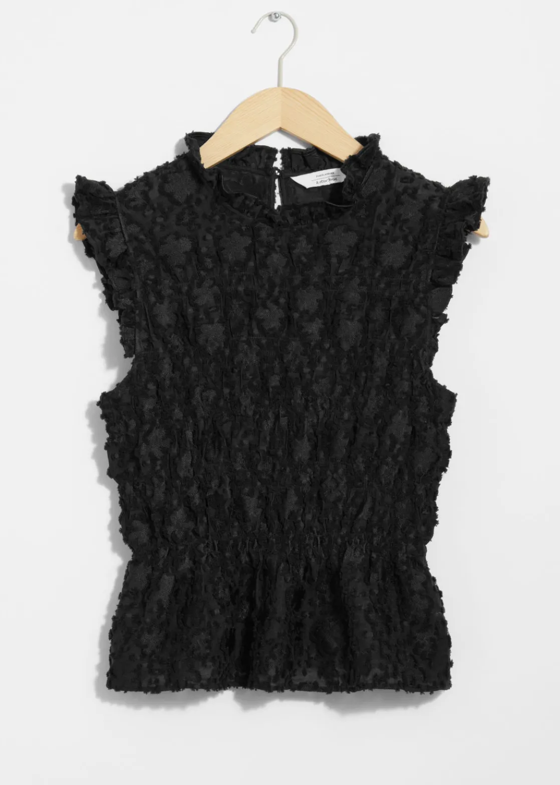 Sleeveless top defined by a smocked finish. Designed with a peplum hemline and frilled detailing at the arm openings and neckline.
