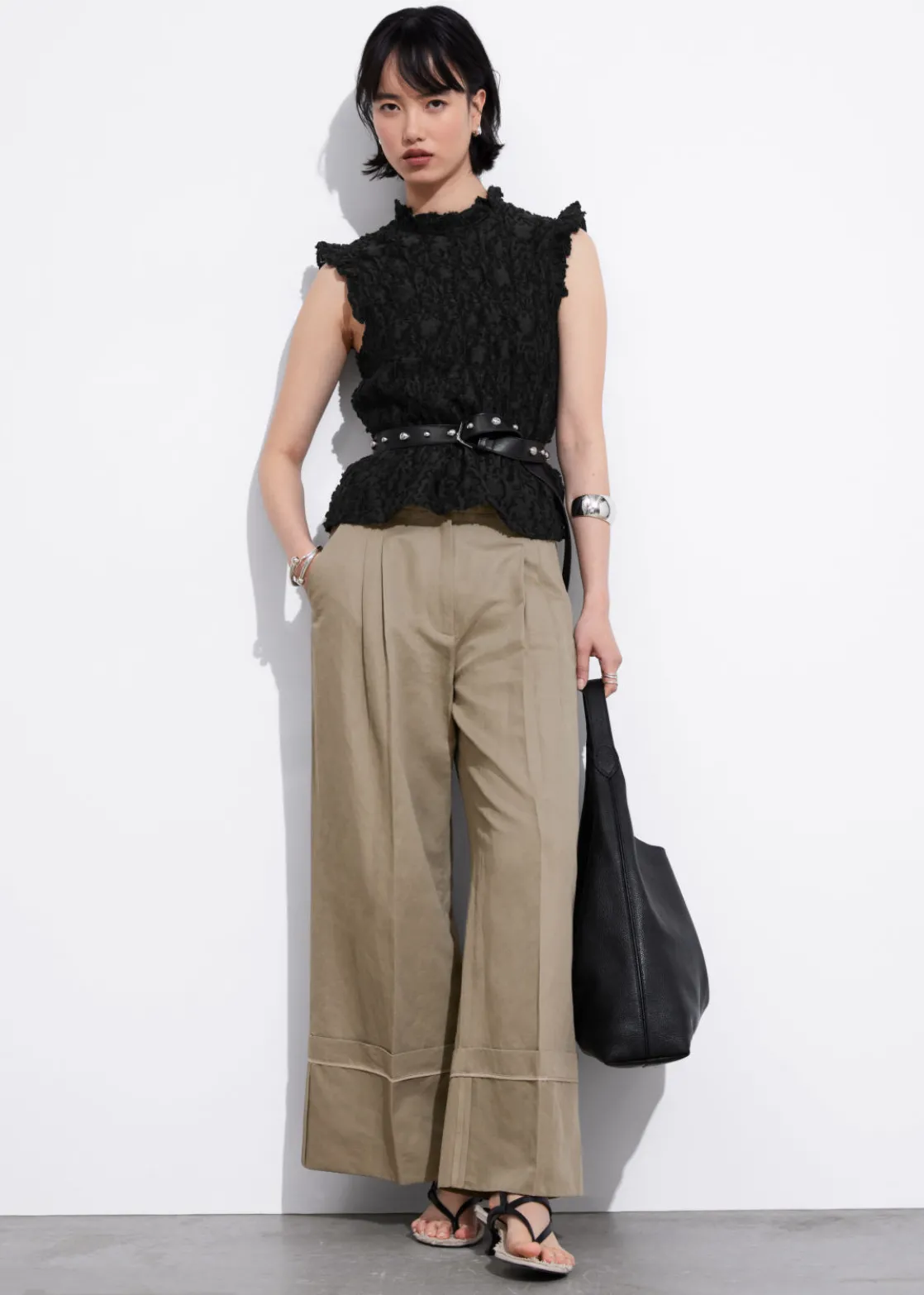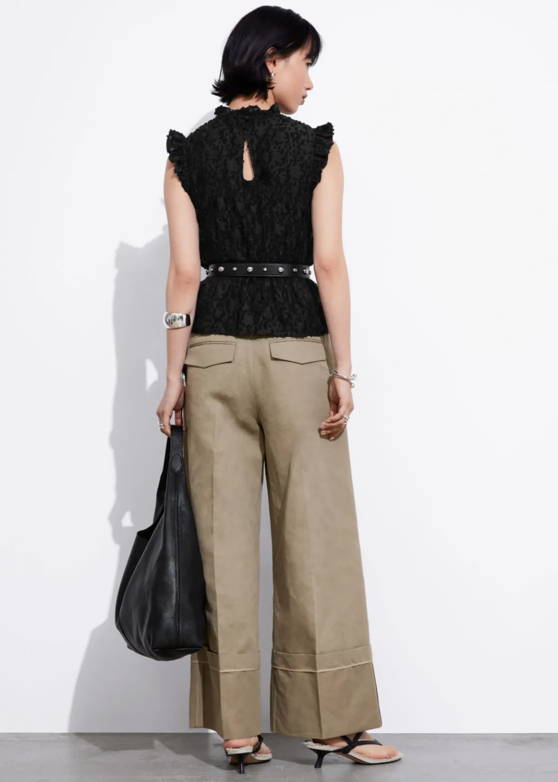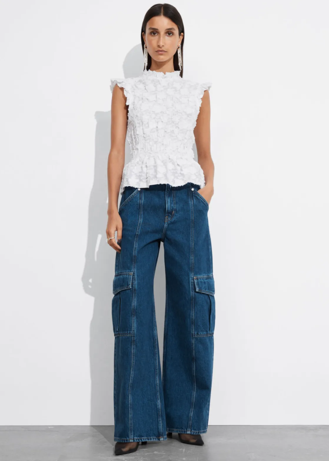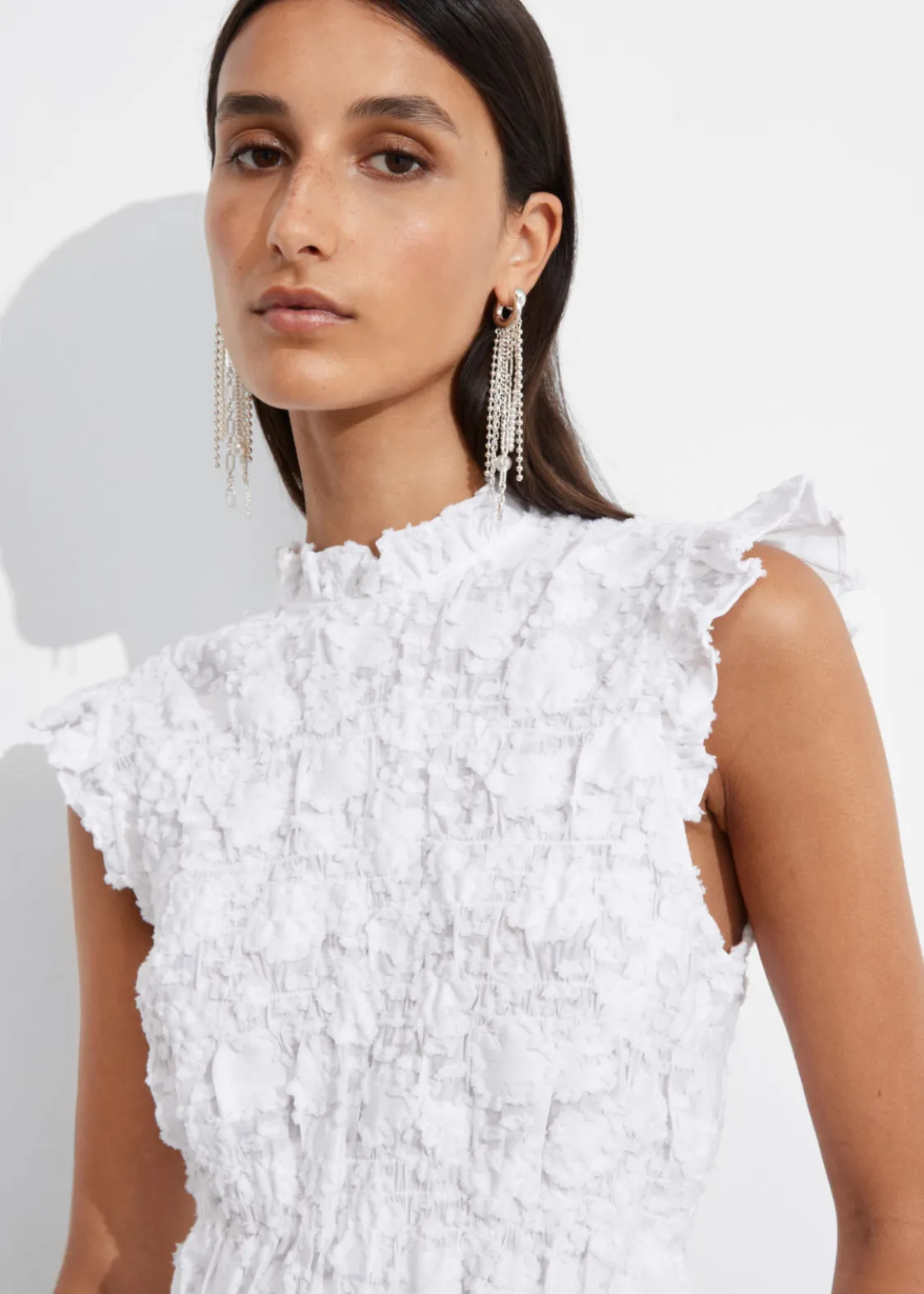 Sleeveless top defined by a smocked finish. Designed with a peplum hemline and frilled detailing at the arm openings and neckline.