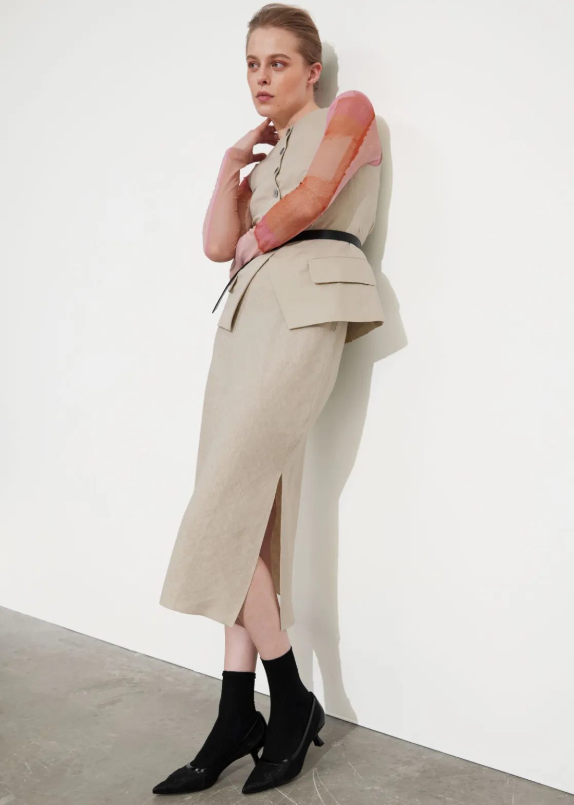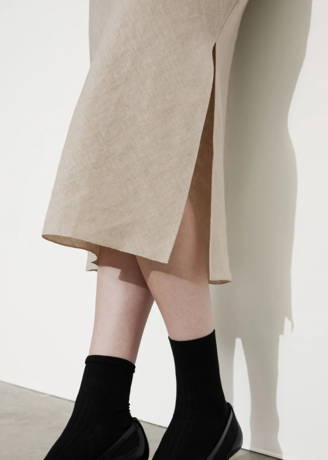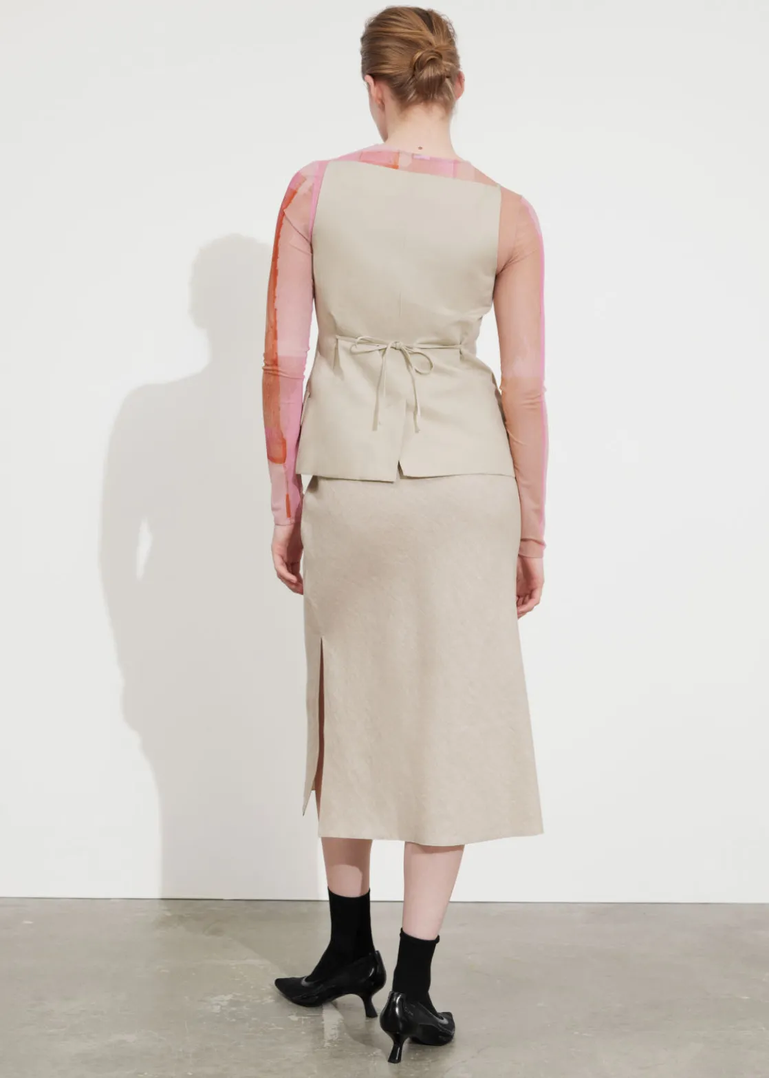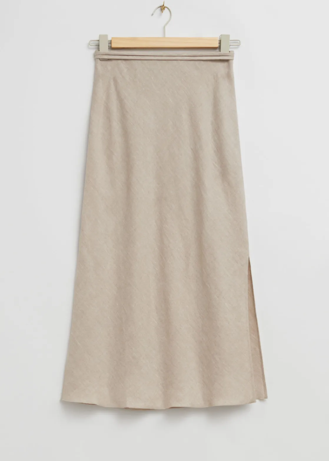 Strap detail linen midi skirt crafted from natural woven linen fabric. Featuring a high elasticated waist with flat strap detail, styled to be crossed in front and tied in the back. Finished with a high-cut side slit and shaped in an a-line, midi-length silhouette. For a complete set, pair with its matching shirt.
