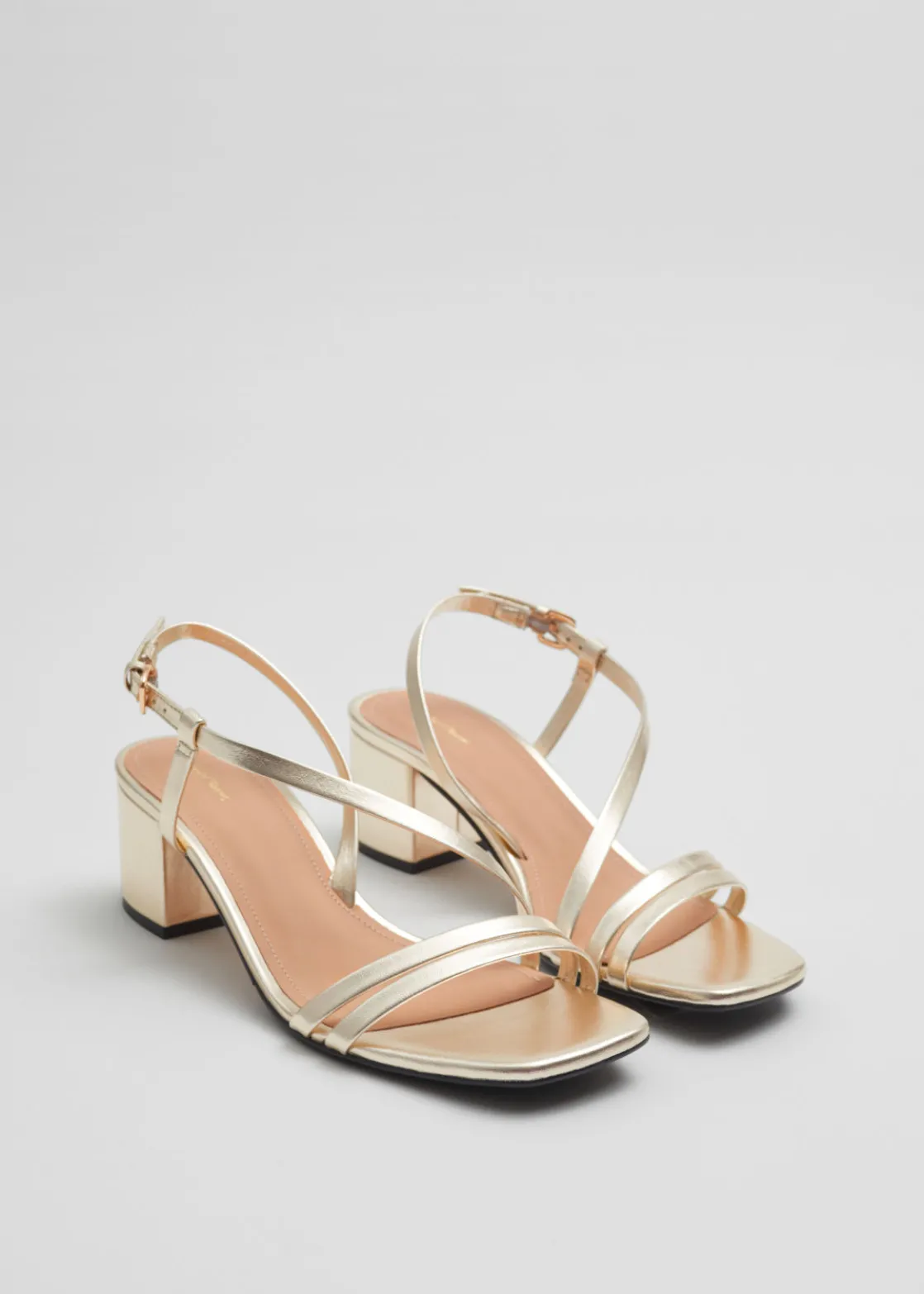 Strappy square-toe sandals with stacked block heels. Crafted from leather and finished with adjustable back straps featuring delicate gold-toned buckle closures.