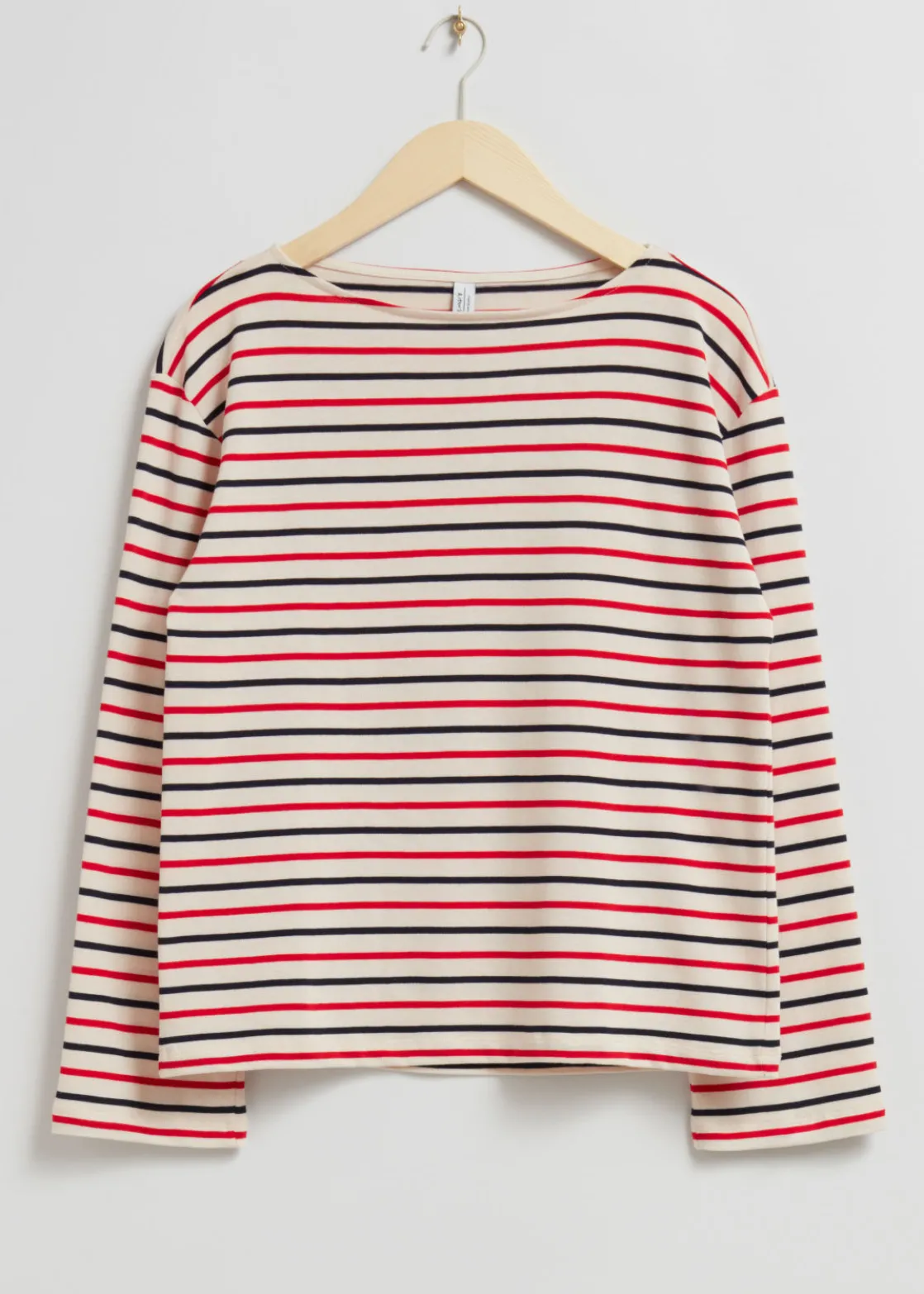 Striped jersey top designed with a round-cut neckline and an allover striped design.