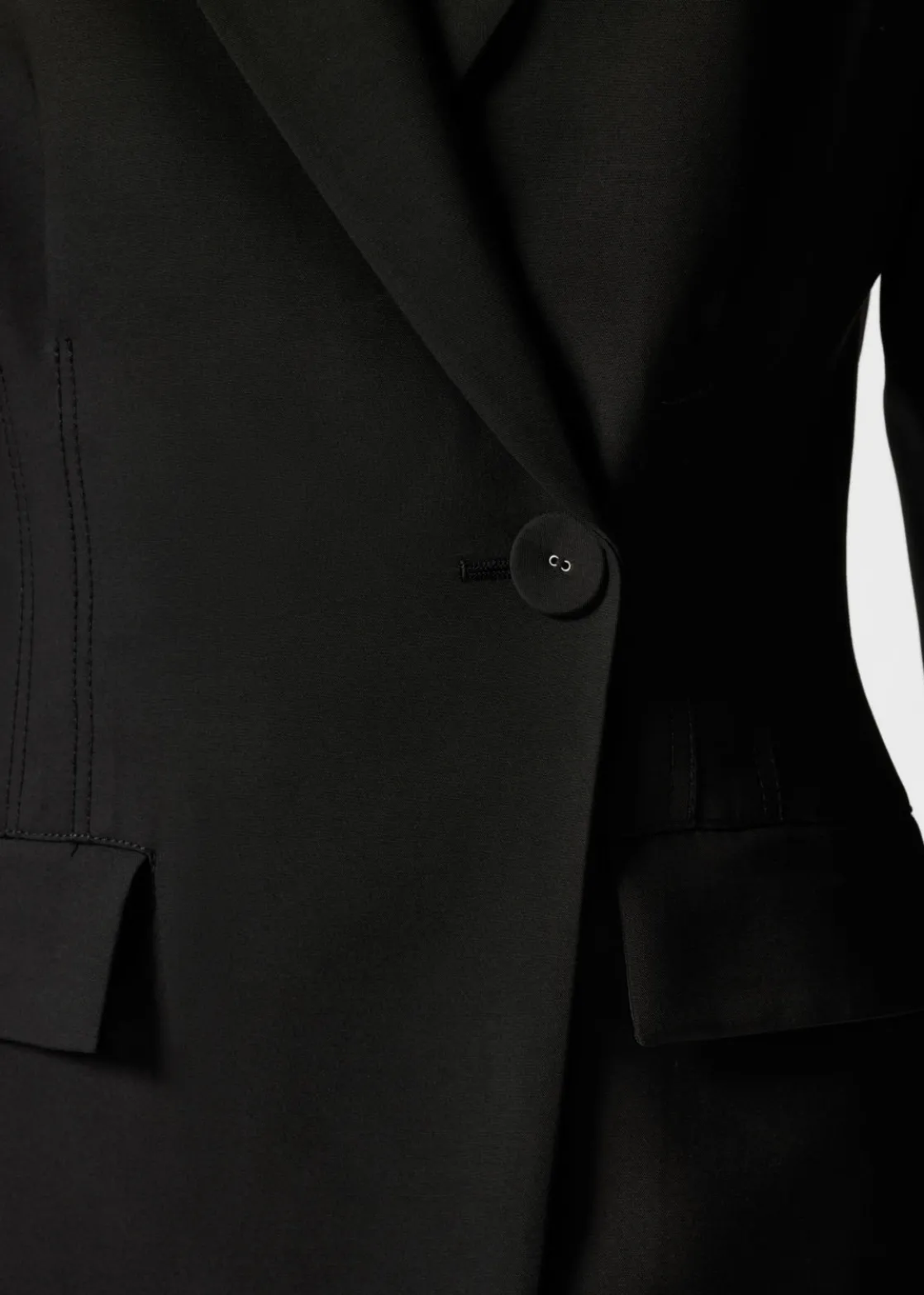 Single-breasted blazer mini dress featuring padded shoulders and an accentuated waistline for a structured, hourglass-like silhouette.