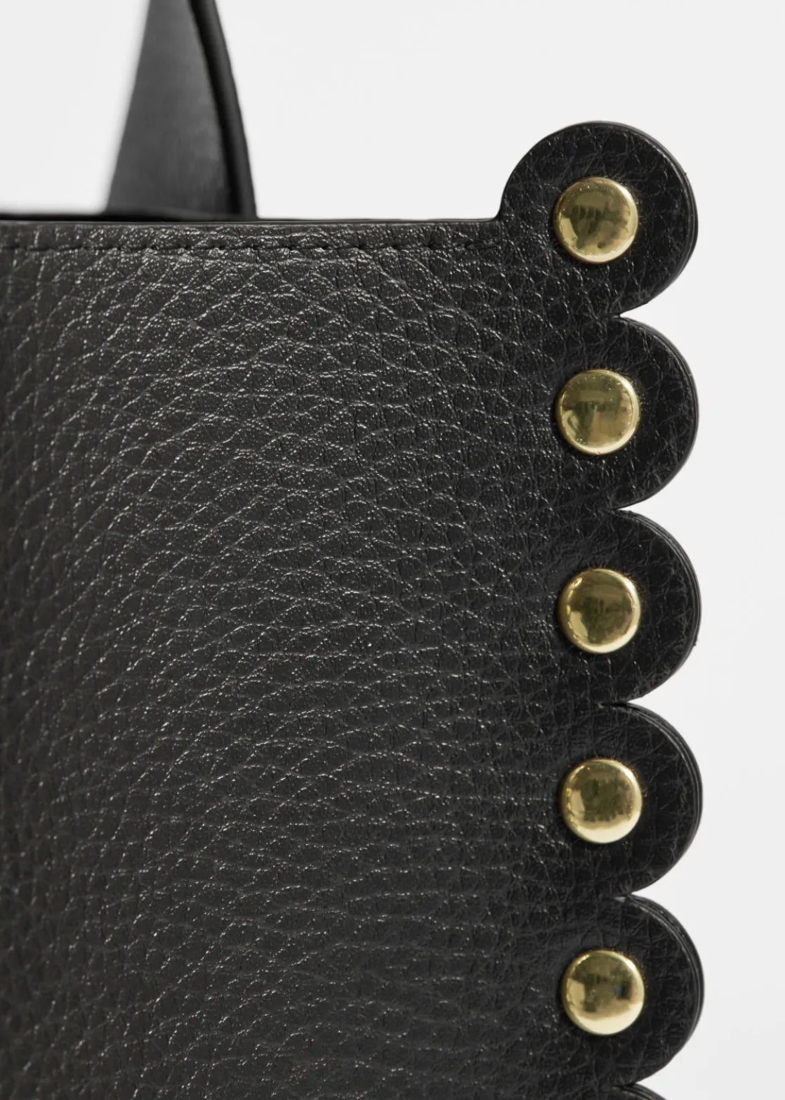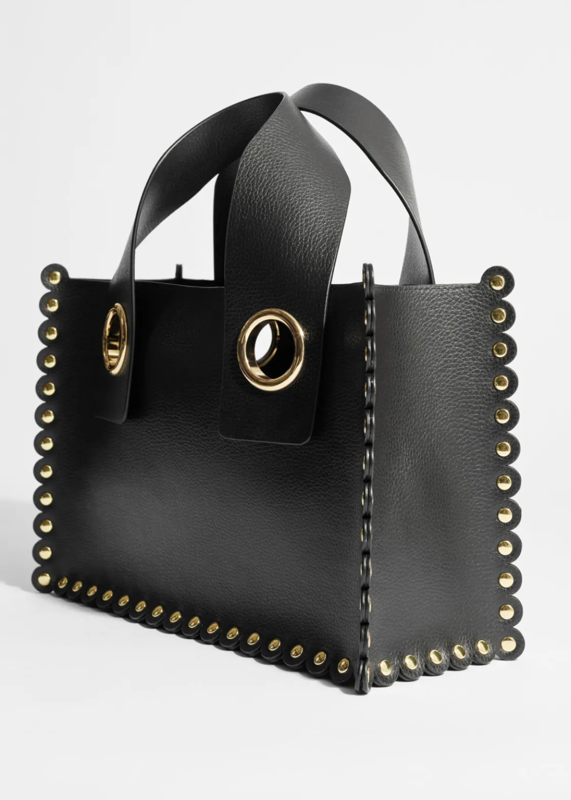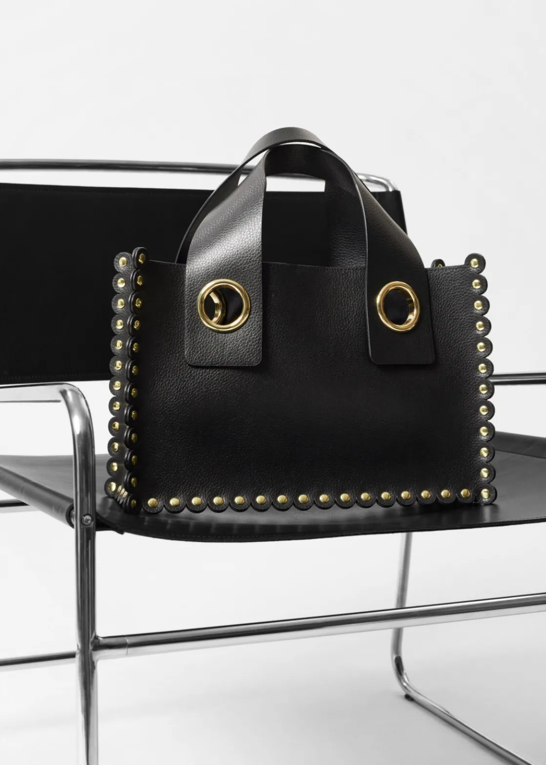 Tote bag featuring short, wide straps and scalloped endings with studded detailing. Finished with an inner zip pocket and magnetic closing.