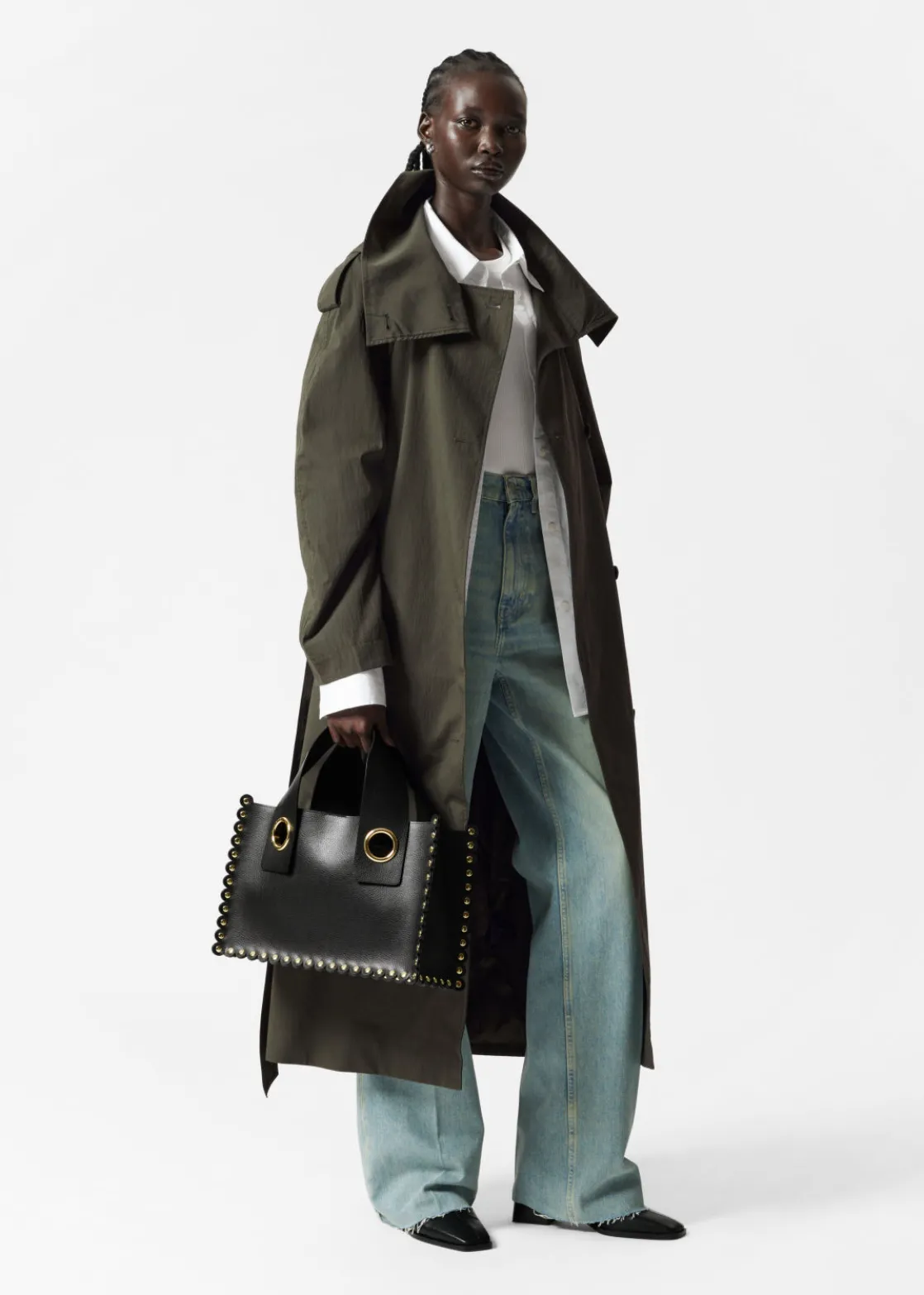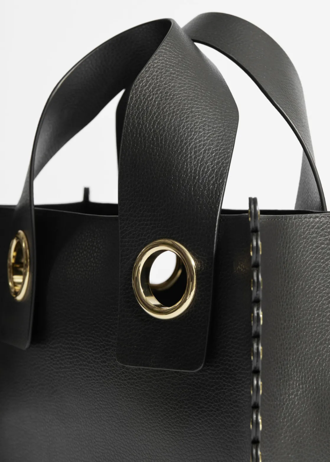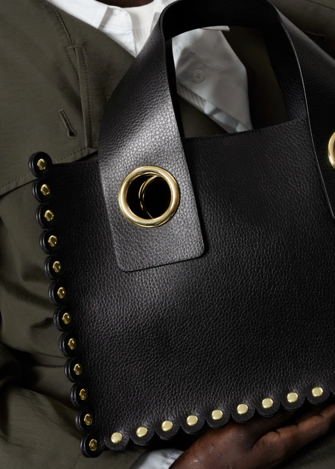 Tote bag featuring short, wide straps and scalloped endings with studded detailing. Finished with an inner zip pocket and magnetic closing.