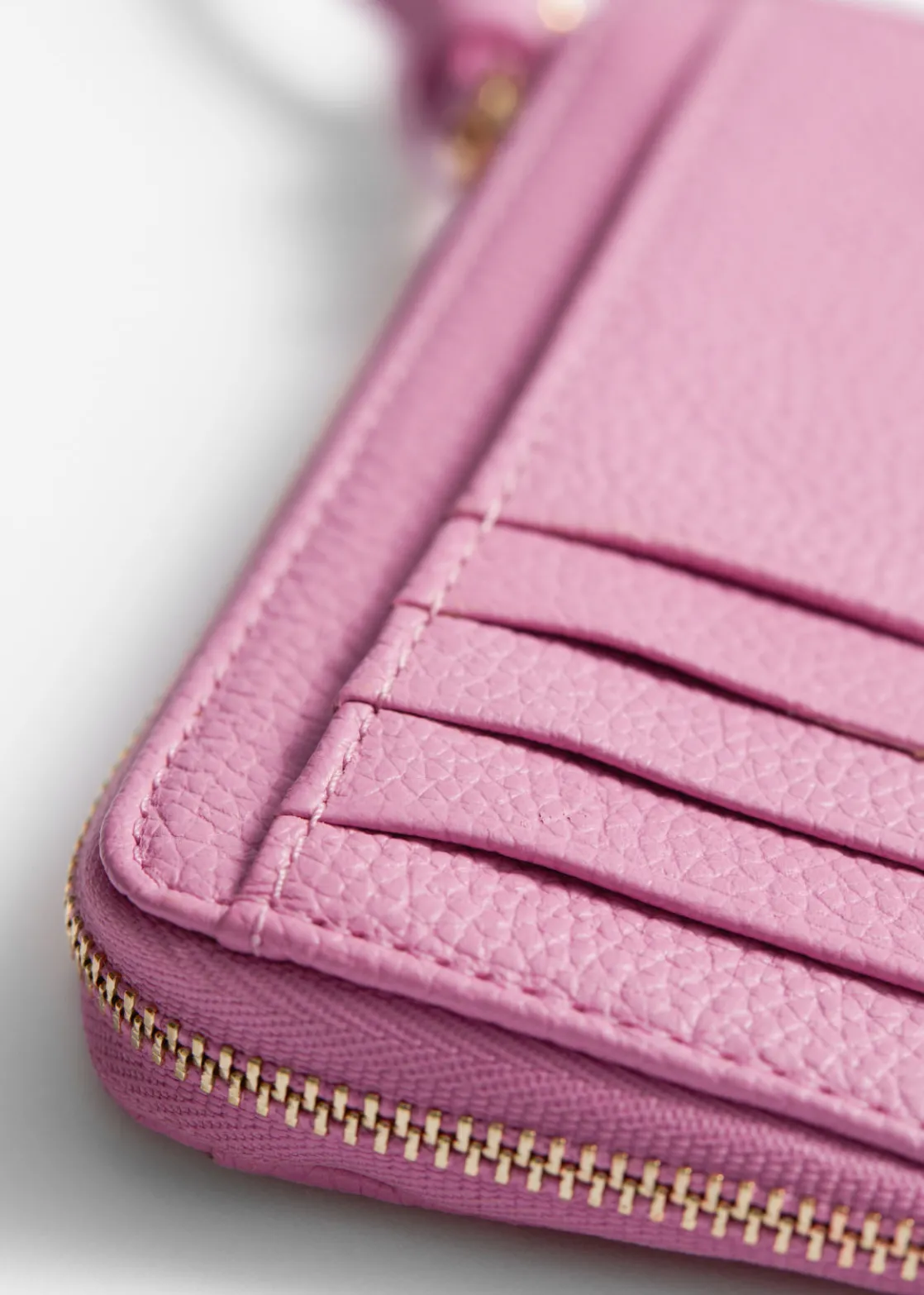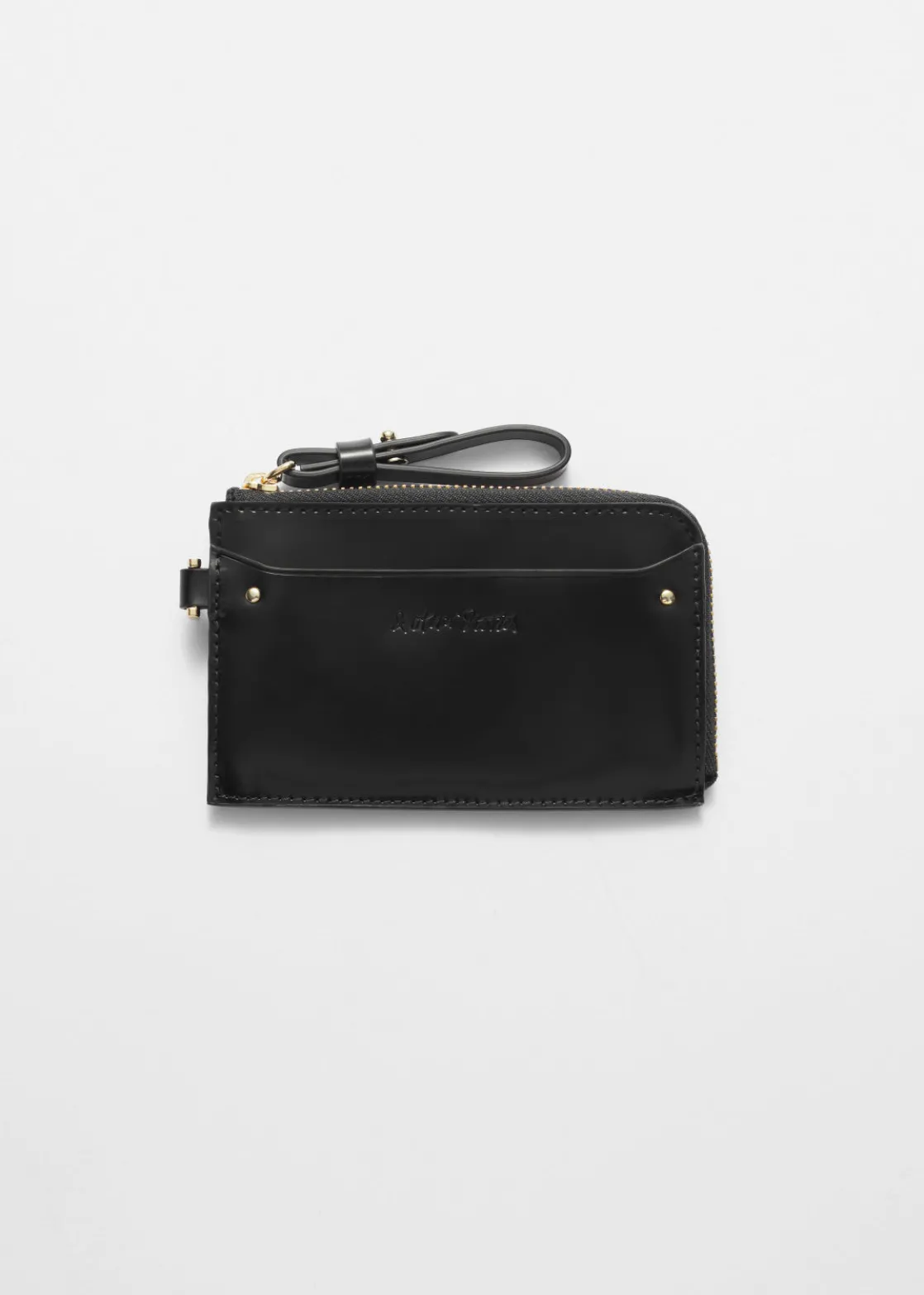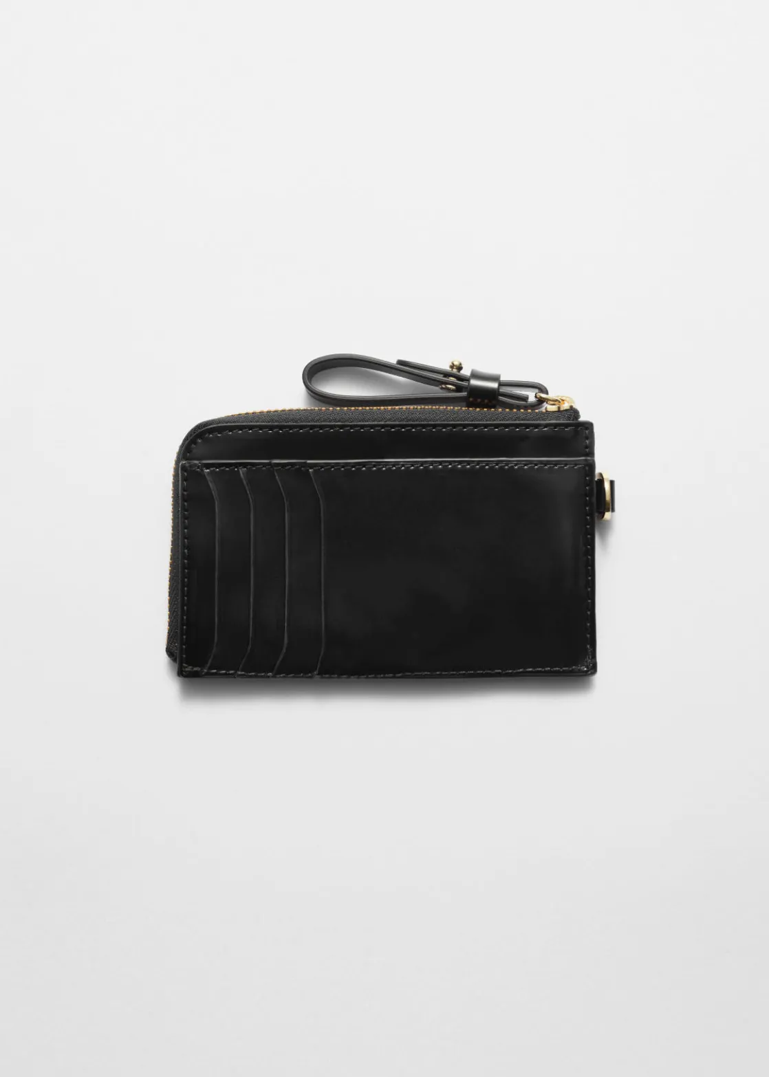 Leather wallet with a zipper compartment, card holder pockets and gold-toned hardware. Featuring coin pendant and a pull tab. It can easily fit a few cards, cash and your ID too.