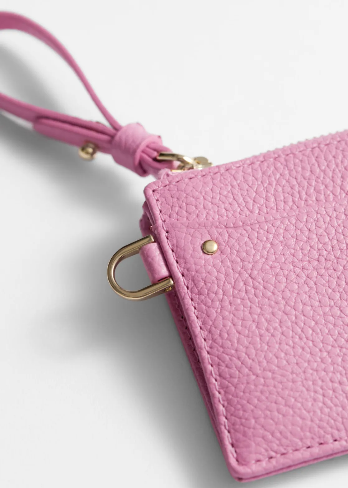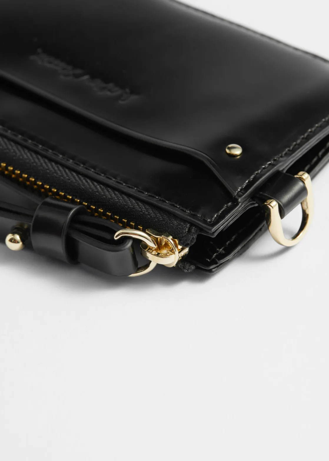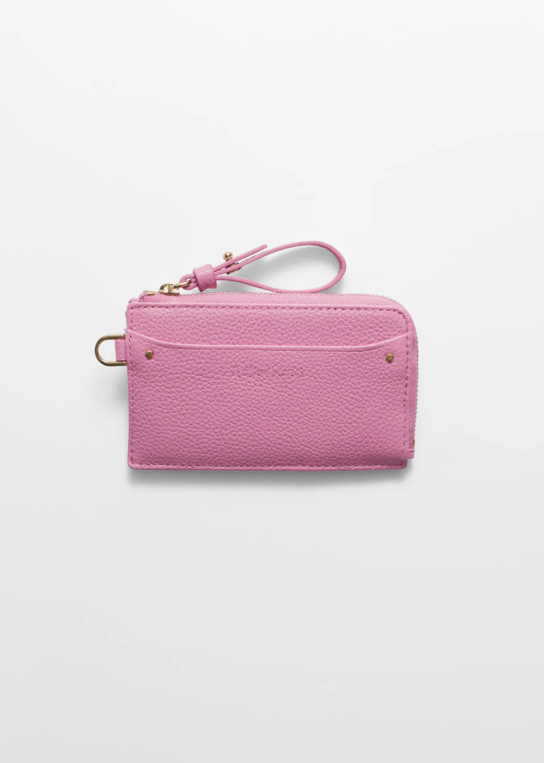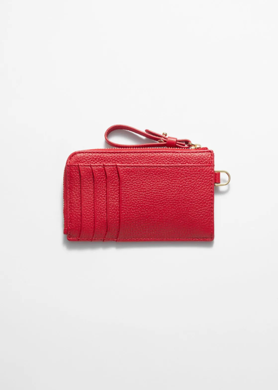 Leather wallet with a zipper compartment, card holder pockets and gold-toned hardware. Featuring coin pendant and a pull tab. It can easily fit a few cards, cash and your ID too.