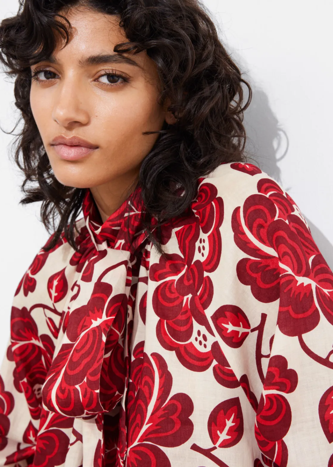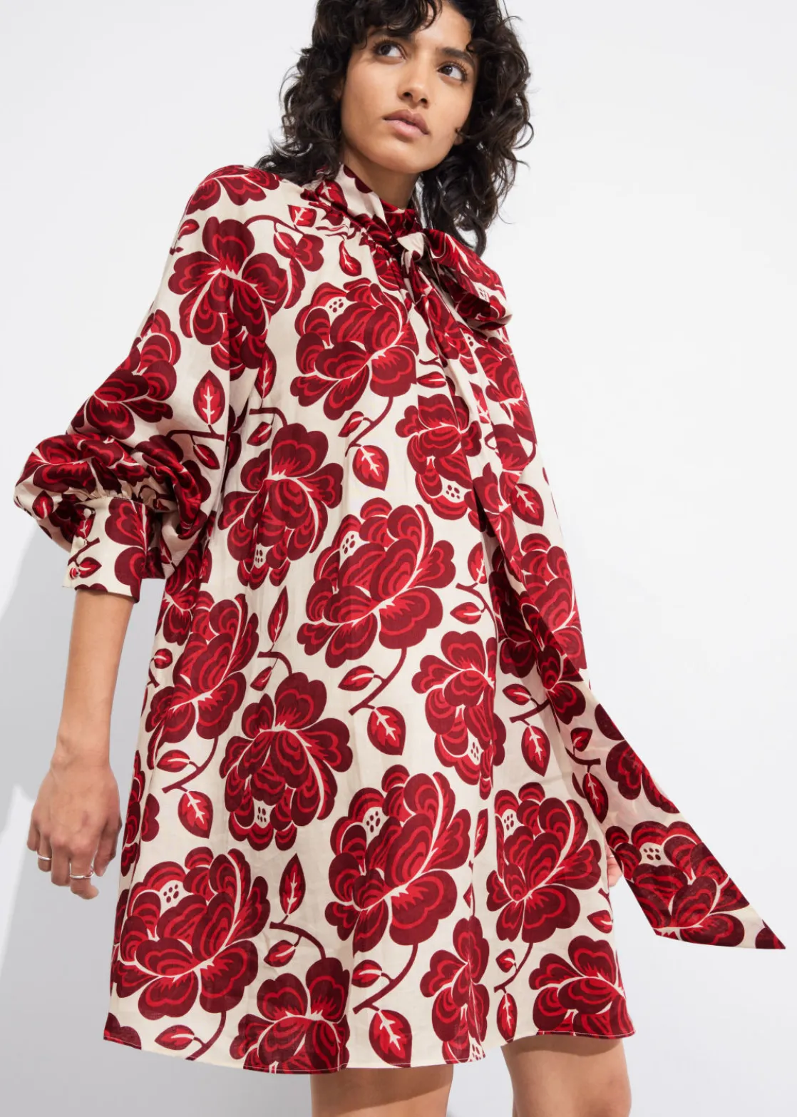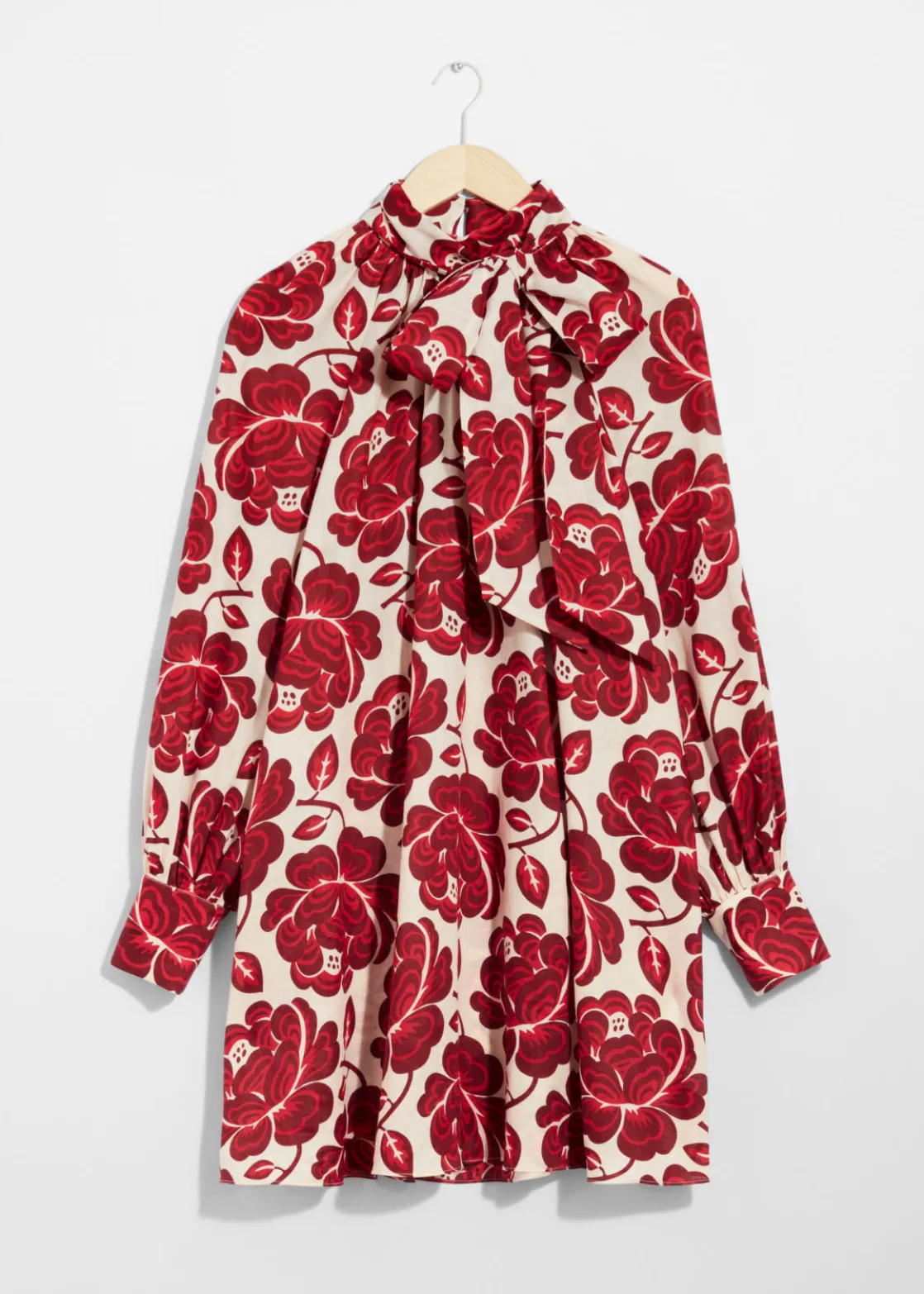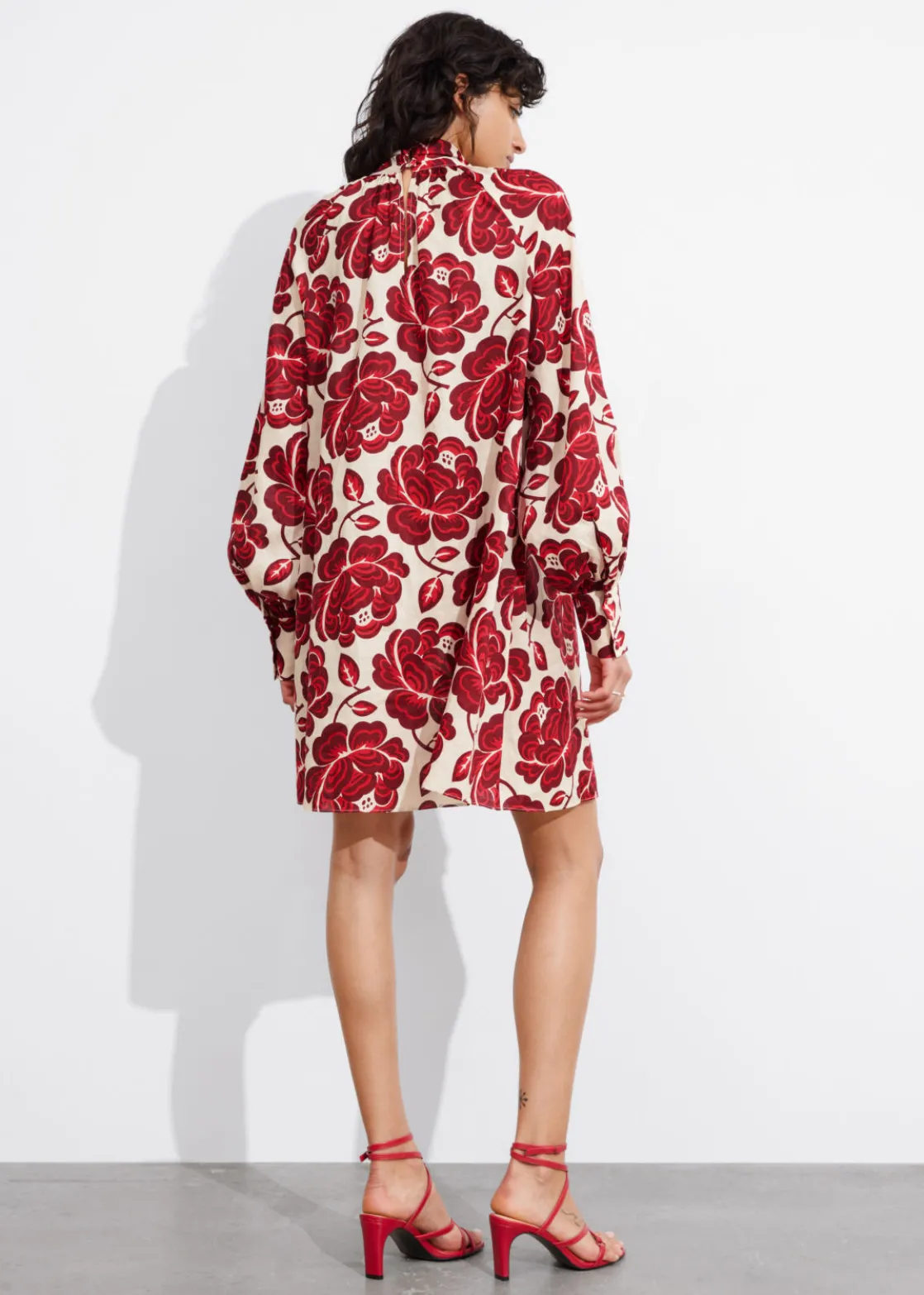 A-line mini dress featuring voluminous sleeves and a mock neck accented with ties.