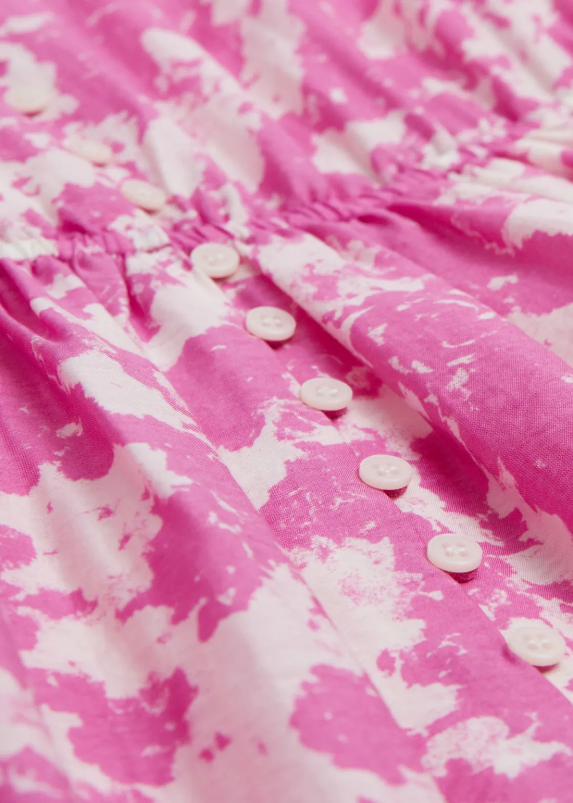 Tiered maxi dress crafted from a woven blend of materials. Featuring a v-cut neckline and buttoned front with a tiered frill skirt, a gathered elasticated waistband and short puffed sleeves. Cut in a maxi length silhouette.