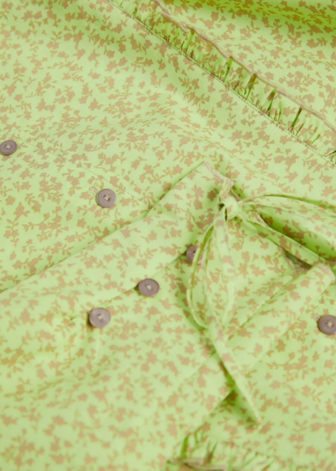 Voluminous sleeve frilled blouse crafted from a woven blend of cotton and viscose. Featuring large voluminous sleeves fitted below the elbow with frilled front and back placket and buttoned front. Finished with a back tie-back and buttoned and tied cuffs.