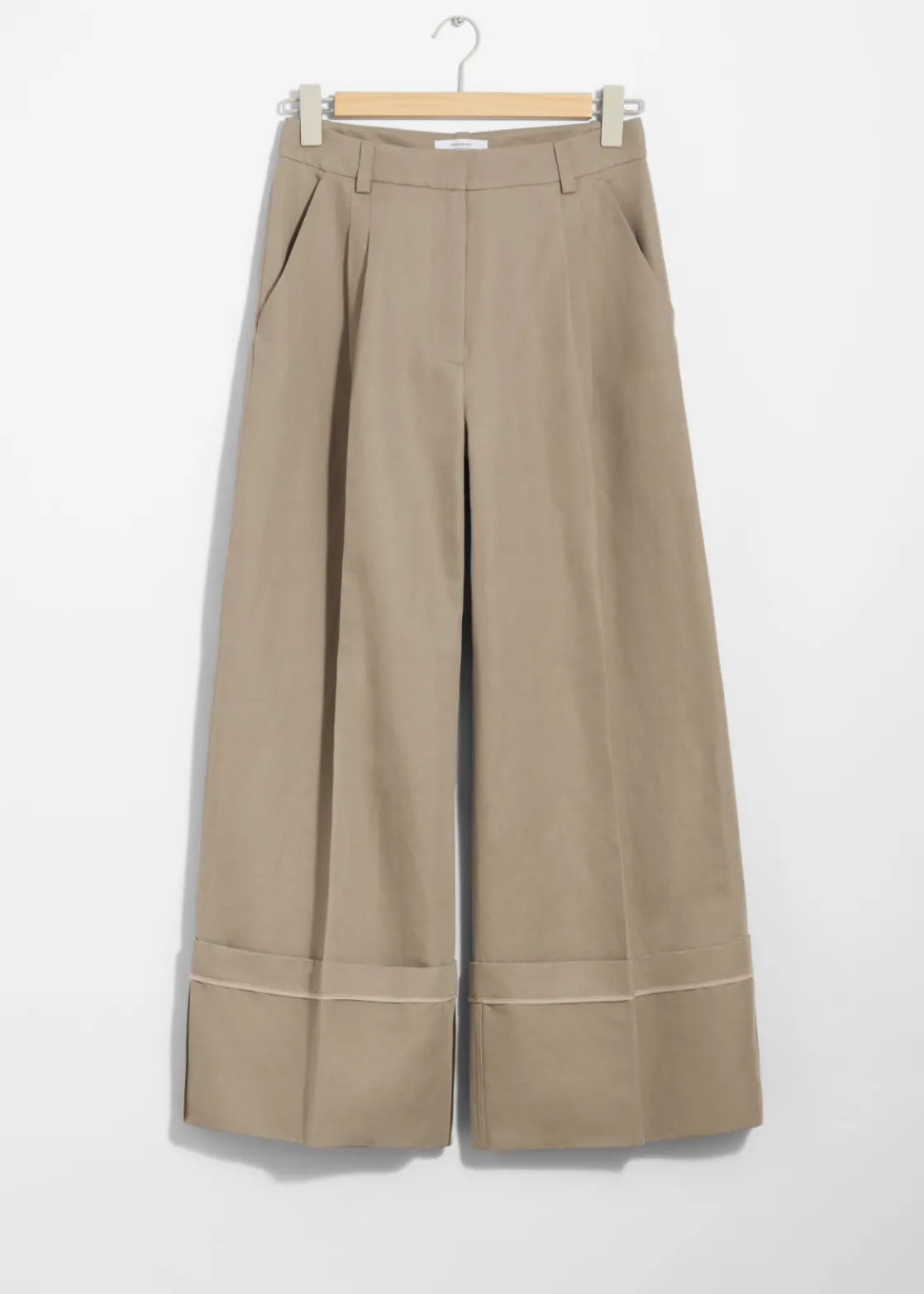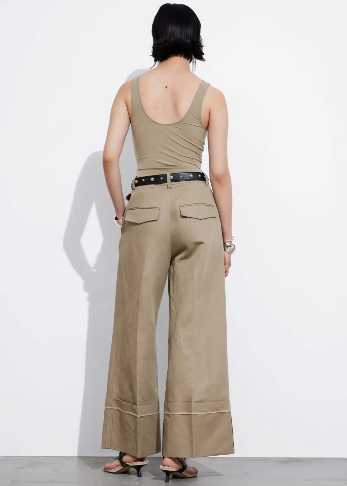 Tailored high-waist trousers with a wide silhouette. Finished with press creases and fold-up cuffs.